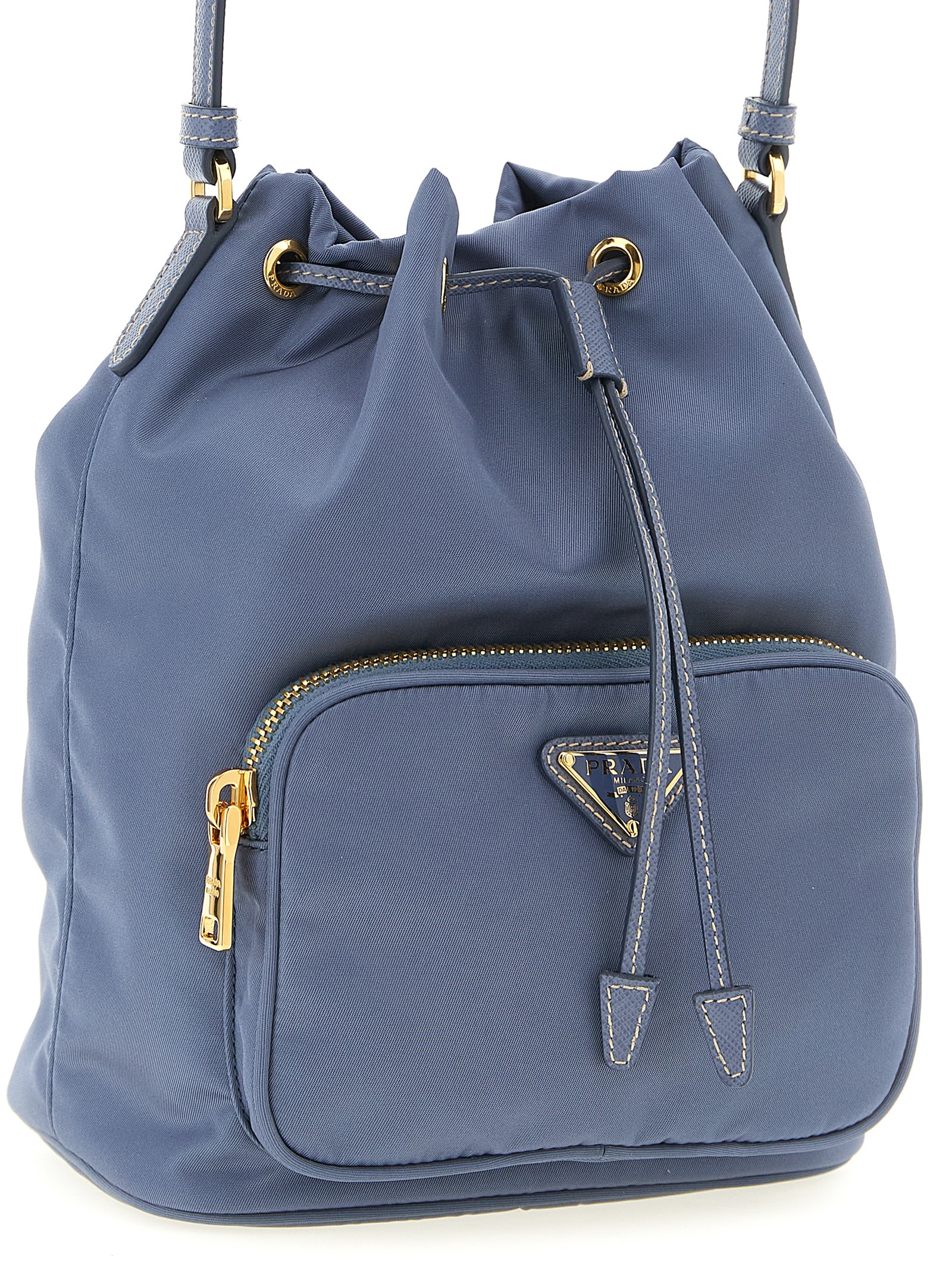'Prada Duet' Re-Nylon and Saffiano leather tone-on-tone bucket bag, zip pocket and front enameled metal triangle logo, fixed handle, drawstring closure, signed Re-Nylon lining, adjustable and removable shoulder strap. SUSTAINABLE: This product is made with Re-Nylon, a regenerated yarn made from recycled and purified plastic collected in oceans, fishery nets and textile fibers.