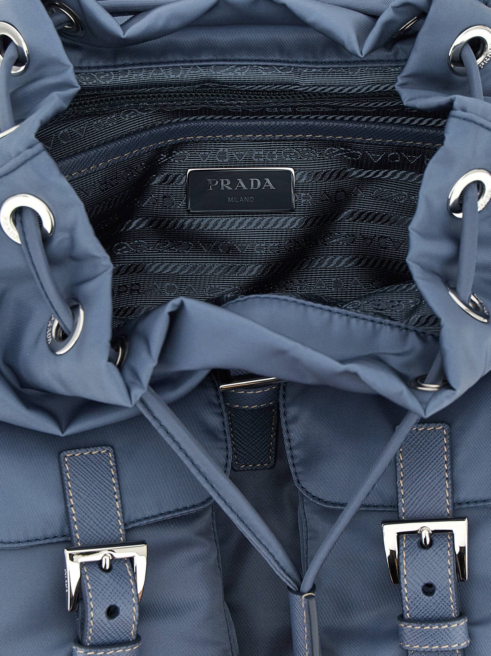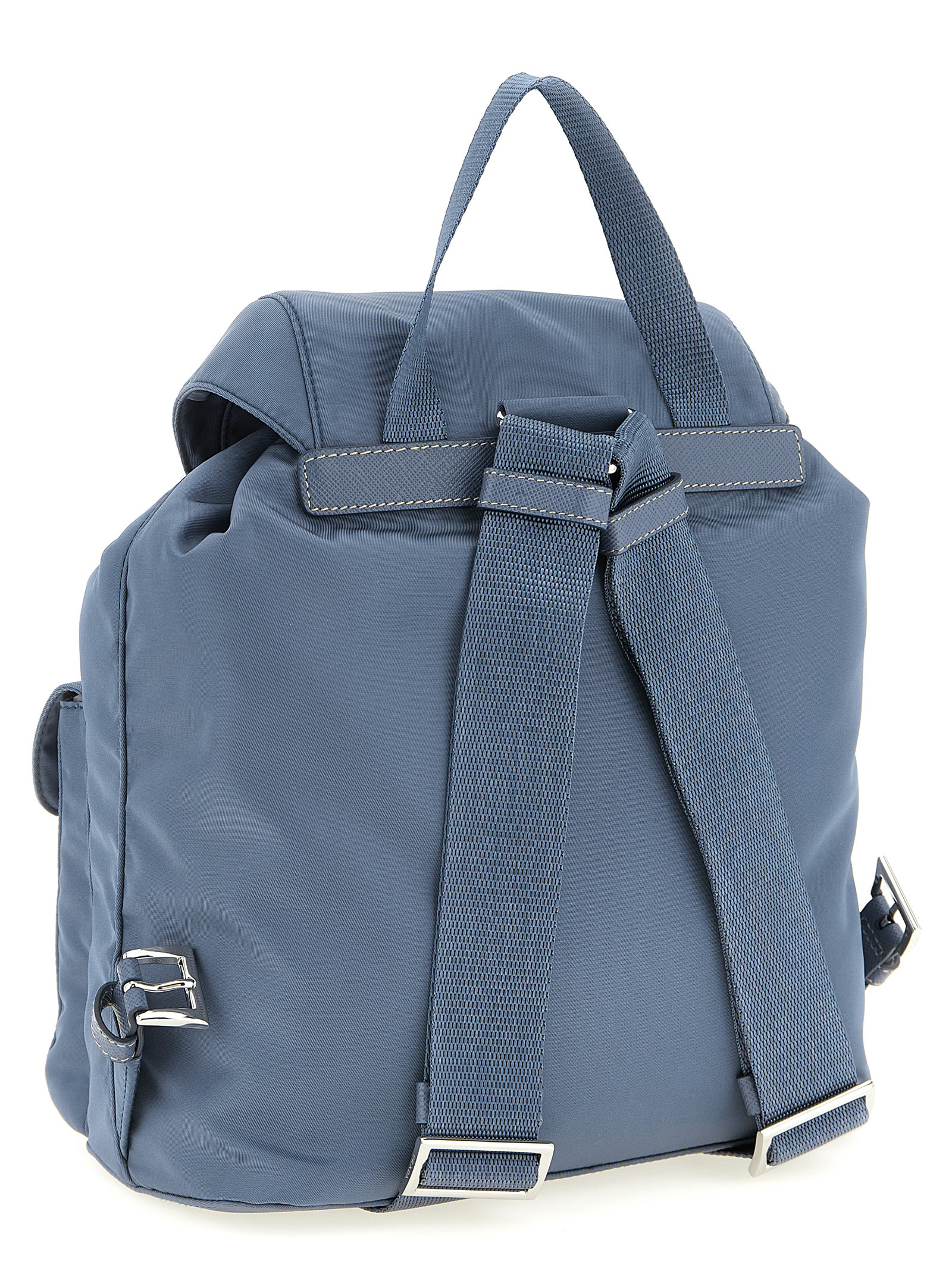 Small Re-Nylon backpack with tone-on-tone Saffiano leather details, magnetic flap closure with front enameled metal triangle strap and logo, inner drawstring, front pockets, fixed handle and adjustable tape shoulder straps. SUSTAINABLE: This product is made with Re-Nylon, a regenerated yarn made from recycled and purified plastic collected in oceans, fishery nets and textile fibers.