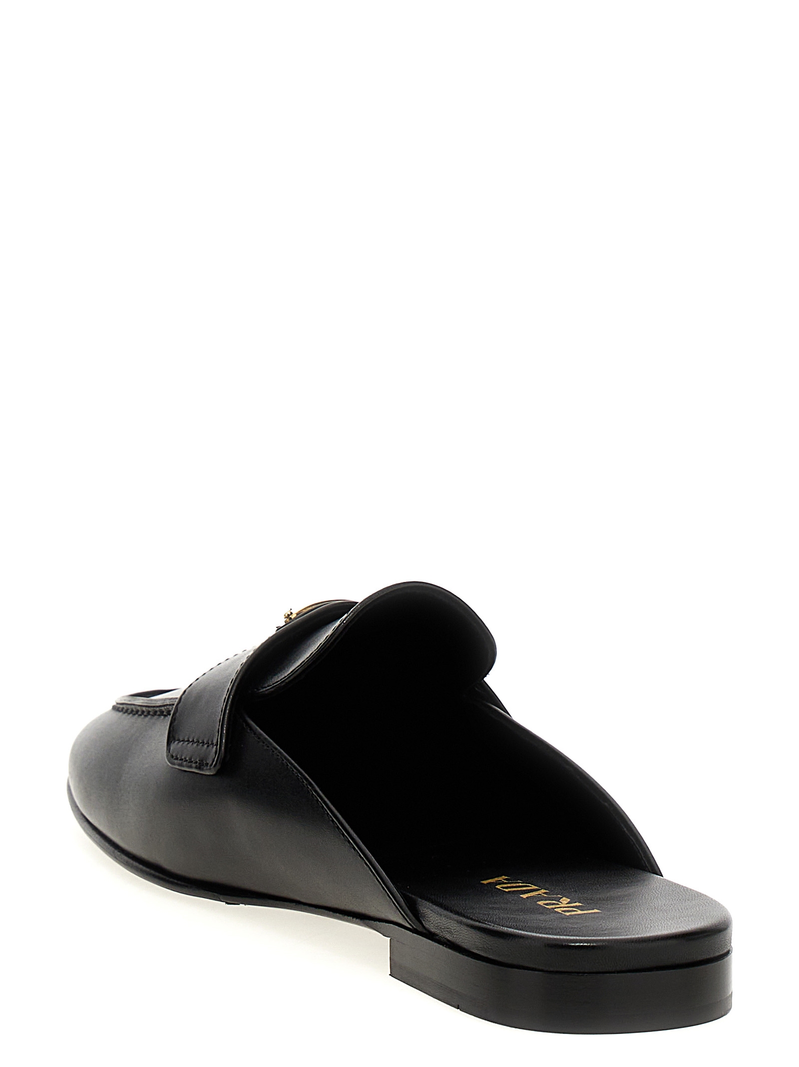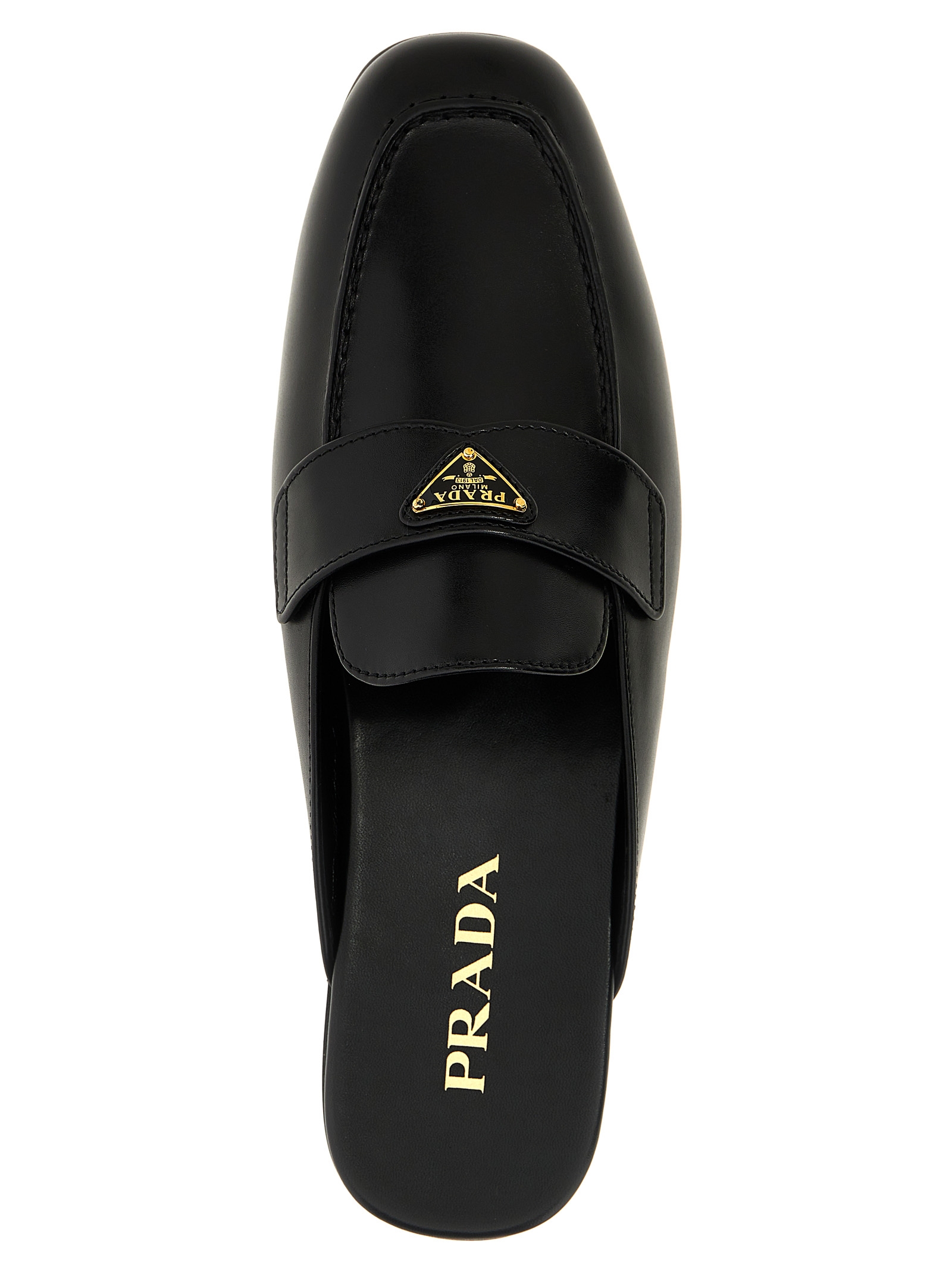 Sabots with leather clamp upper, triangle logo in enameled metal on the front, leather sole and monobloc rubber with fire logo.