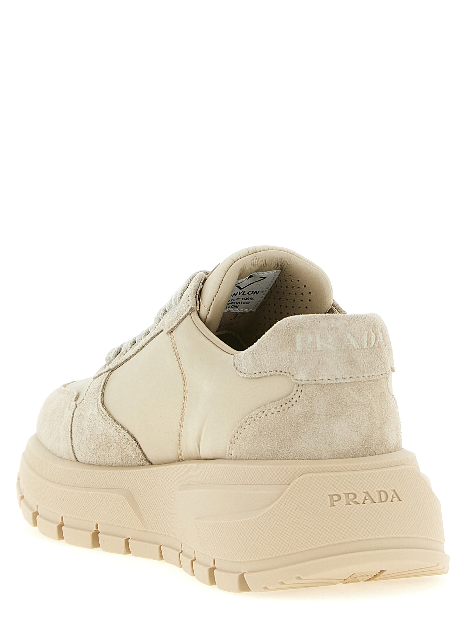 'Prax 01' Re-Nylon and suede sneakers, side enameled metal triangle logo, lace-up closure, tone-on-tone silicone lettering logo on tongue, rubber sole. SUSTAINABLE: This product is made with Re-Nylon, a regenerated yarn made from recycled and purified plastic collected in oceans, fishery nets and textile fibers.