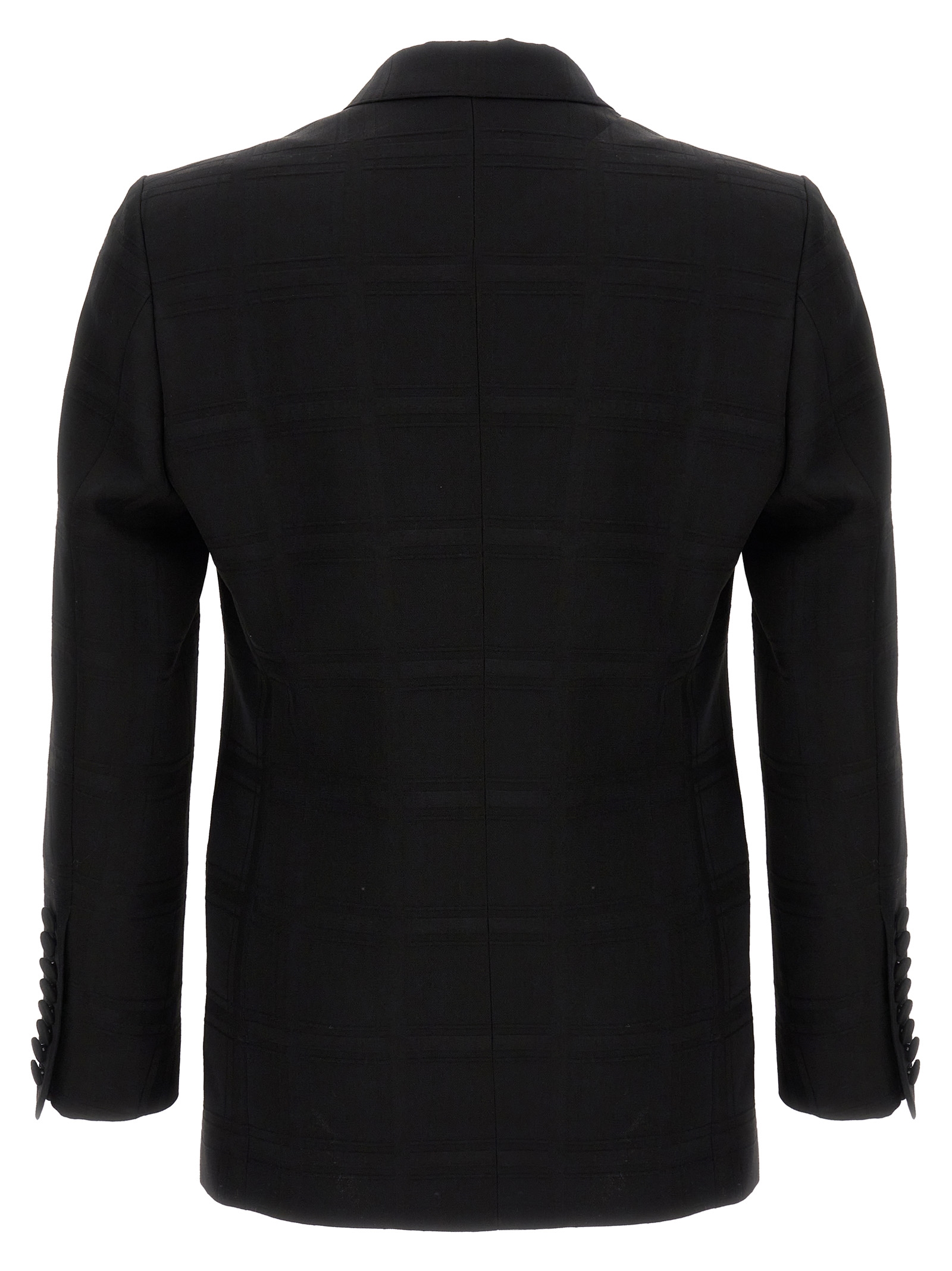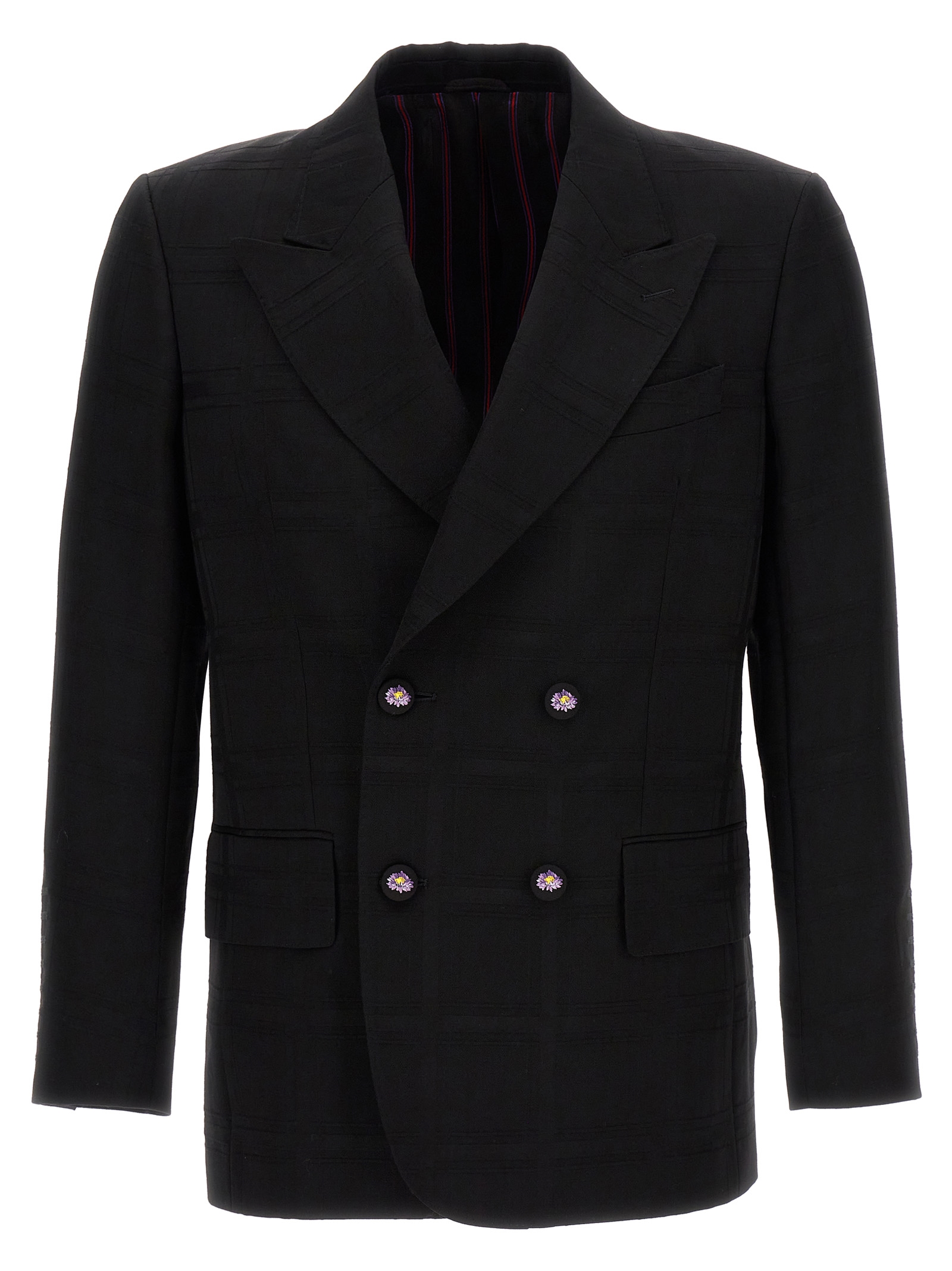 Check double-breasted wool blazer with button closure, pockets, long sleeves.