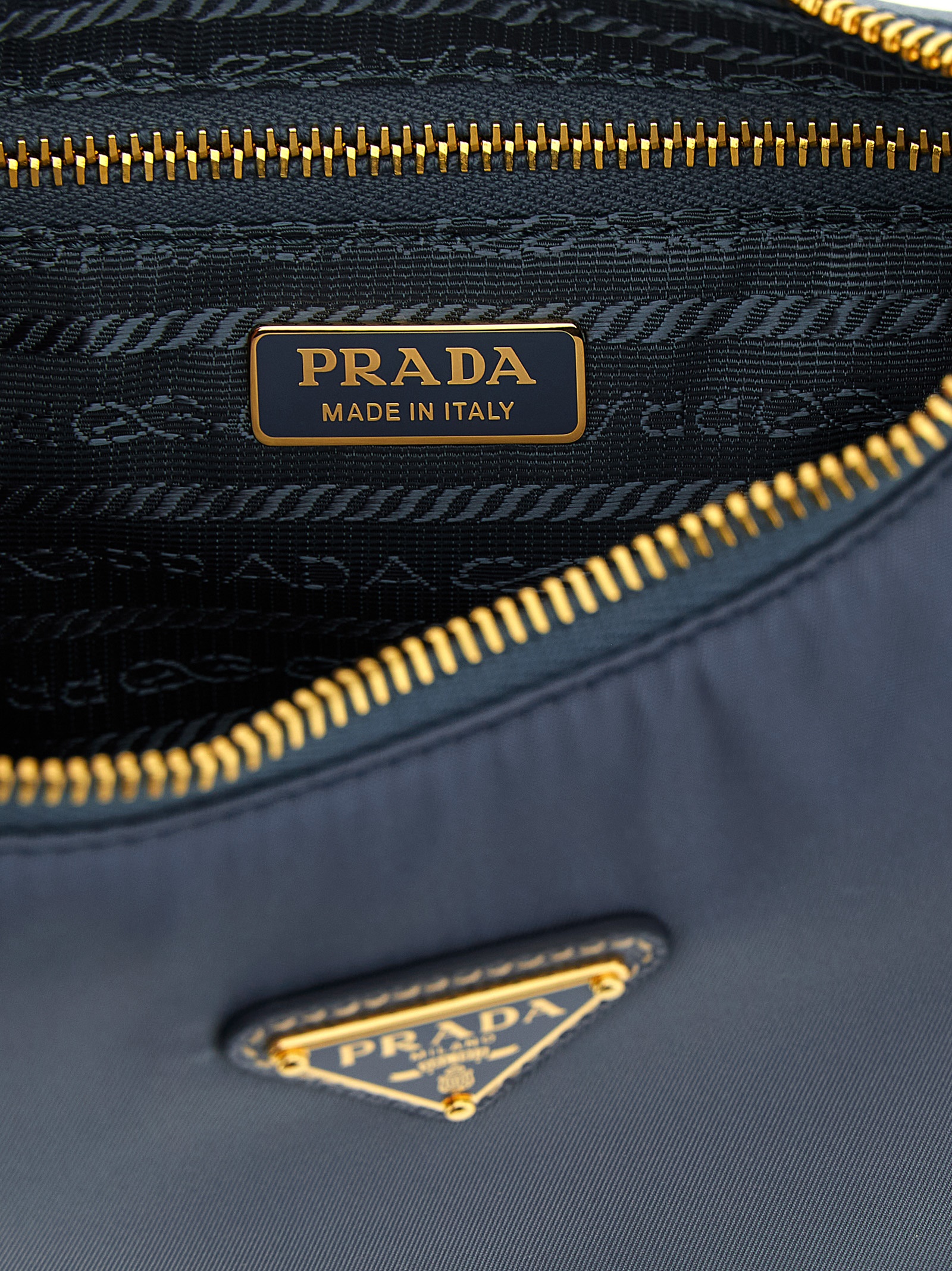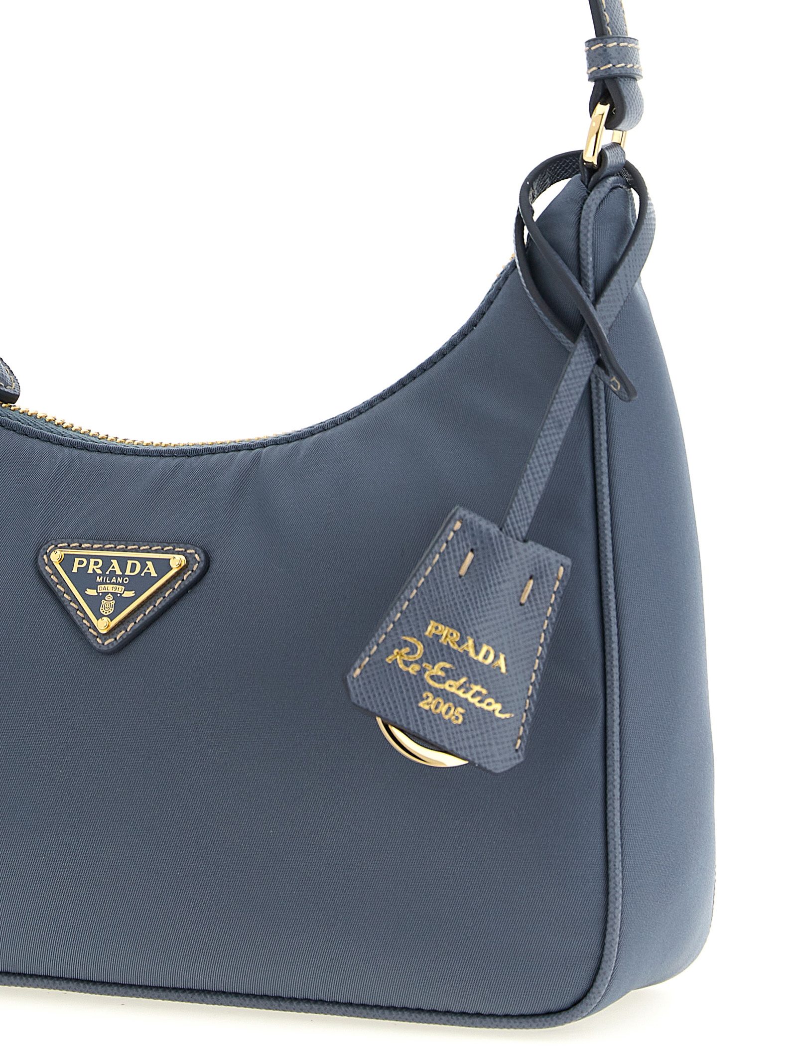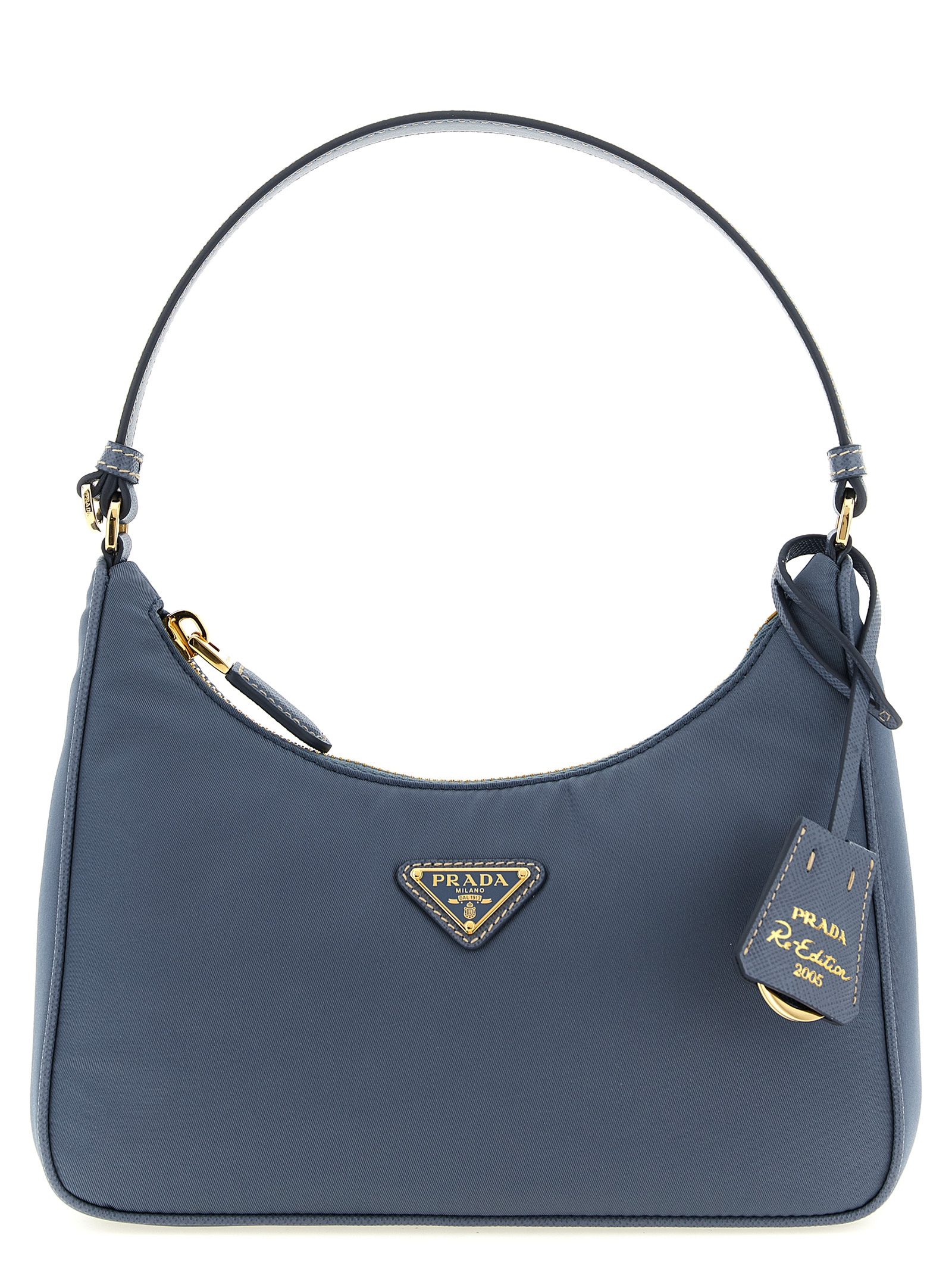 'Prada Re-Edition 2005' shoulder bag in Re-Nylon and Saffiano, front enameled metal triangle logo, top zip closure, fixed handle, removable leather-covered keyring. SUSTAINABLE: This product is made with Re-Nylon, a regenerated yarn made from recycled and purified plastic collected in oceans, fishery nets and textile fibers.