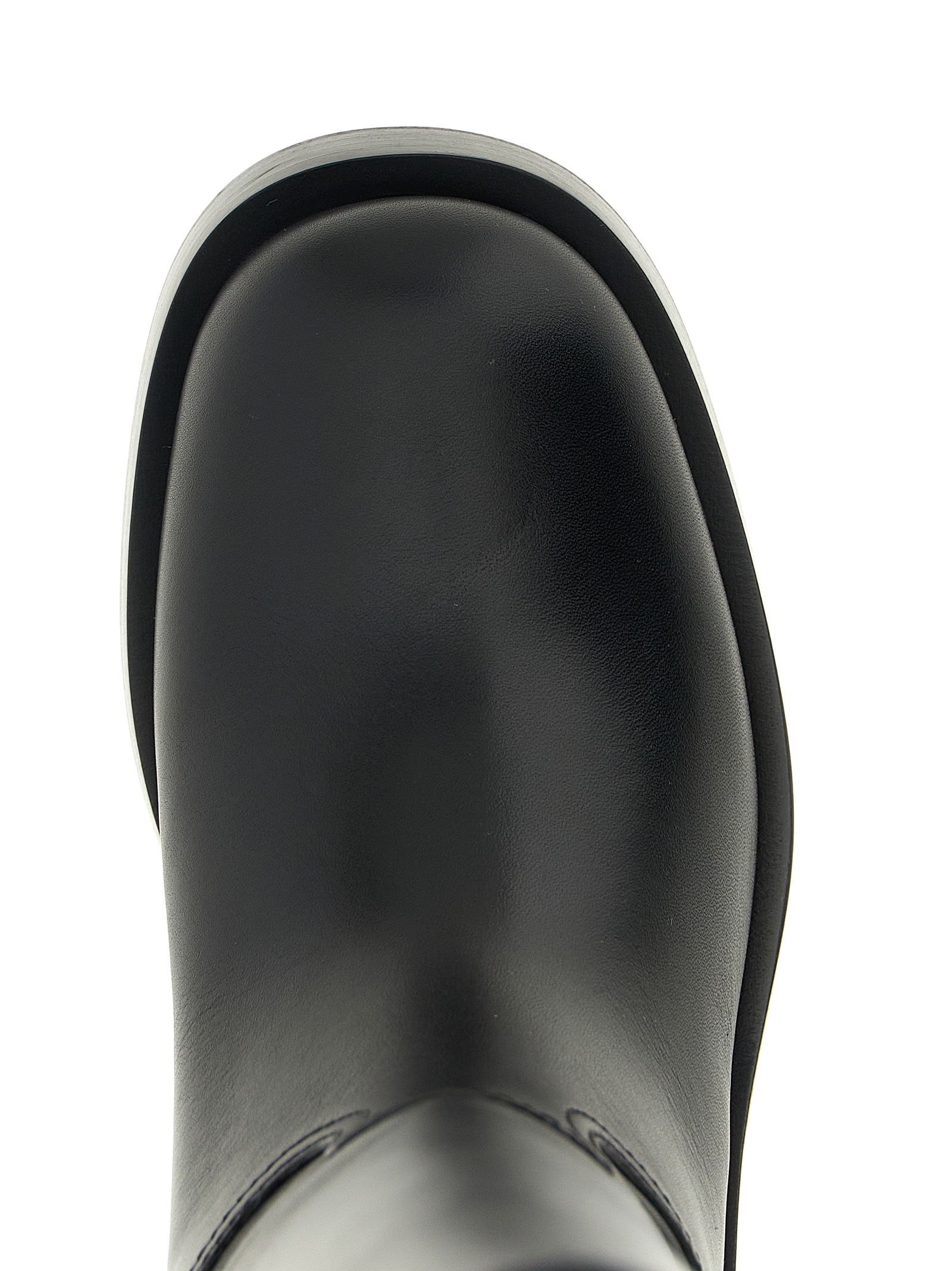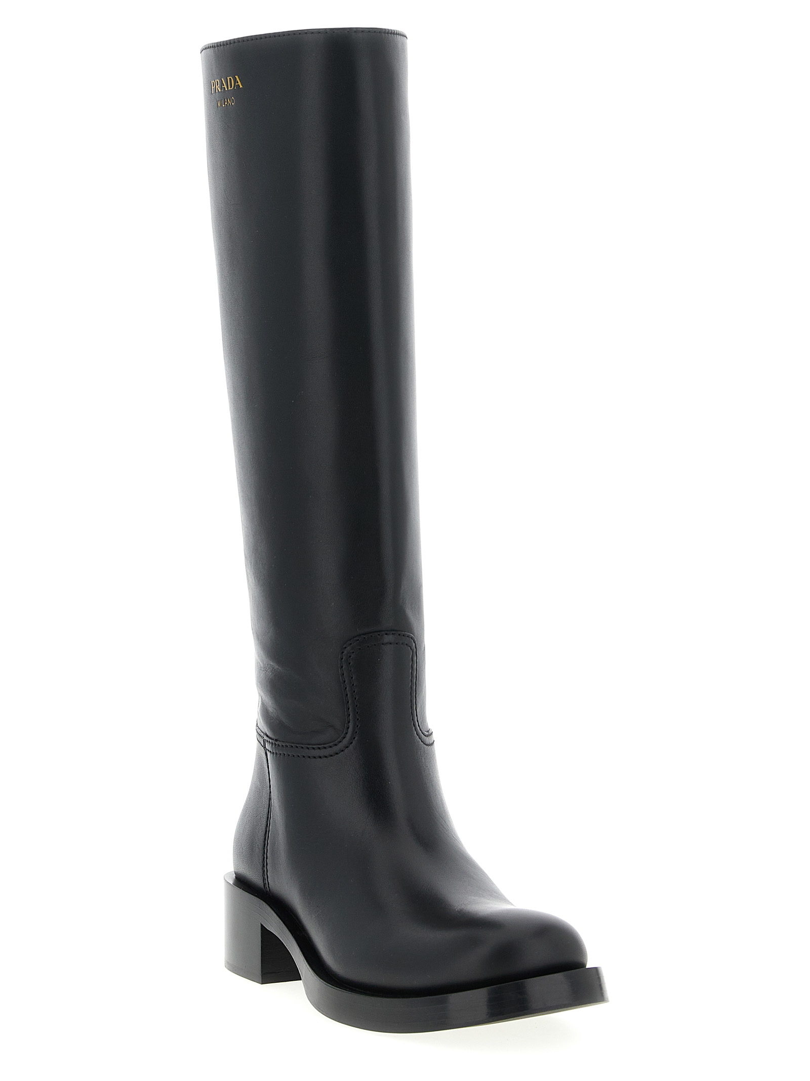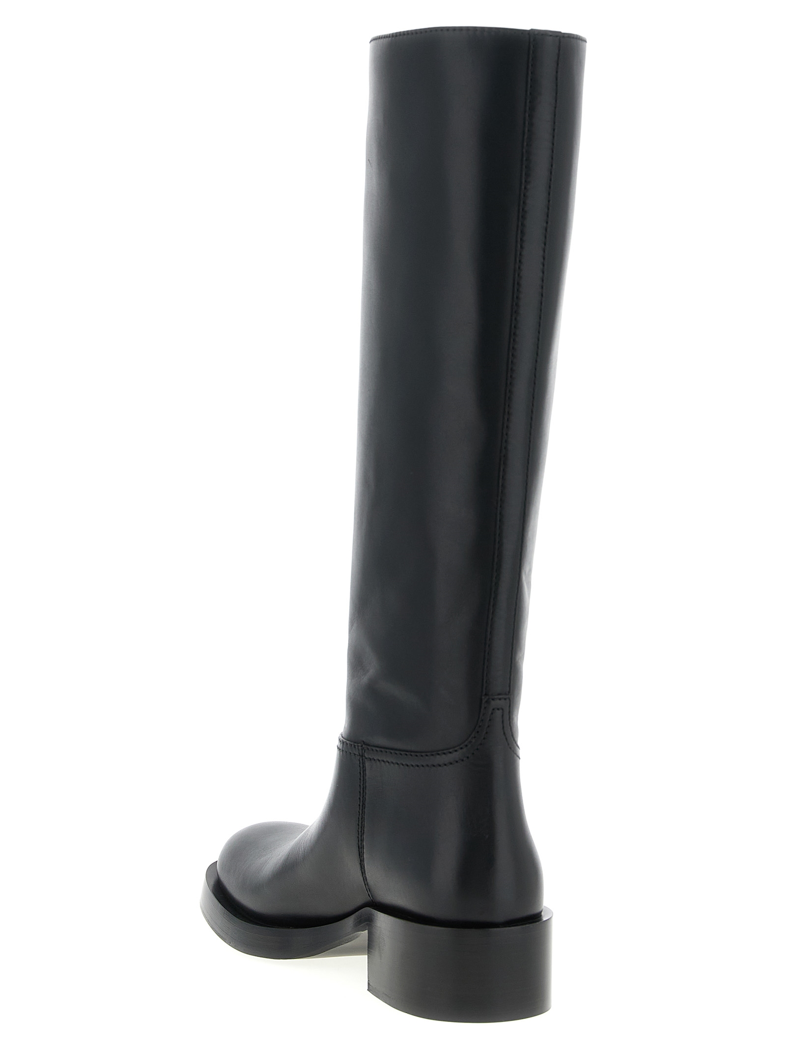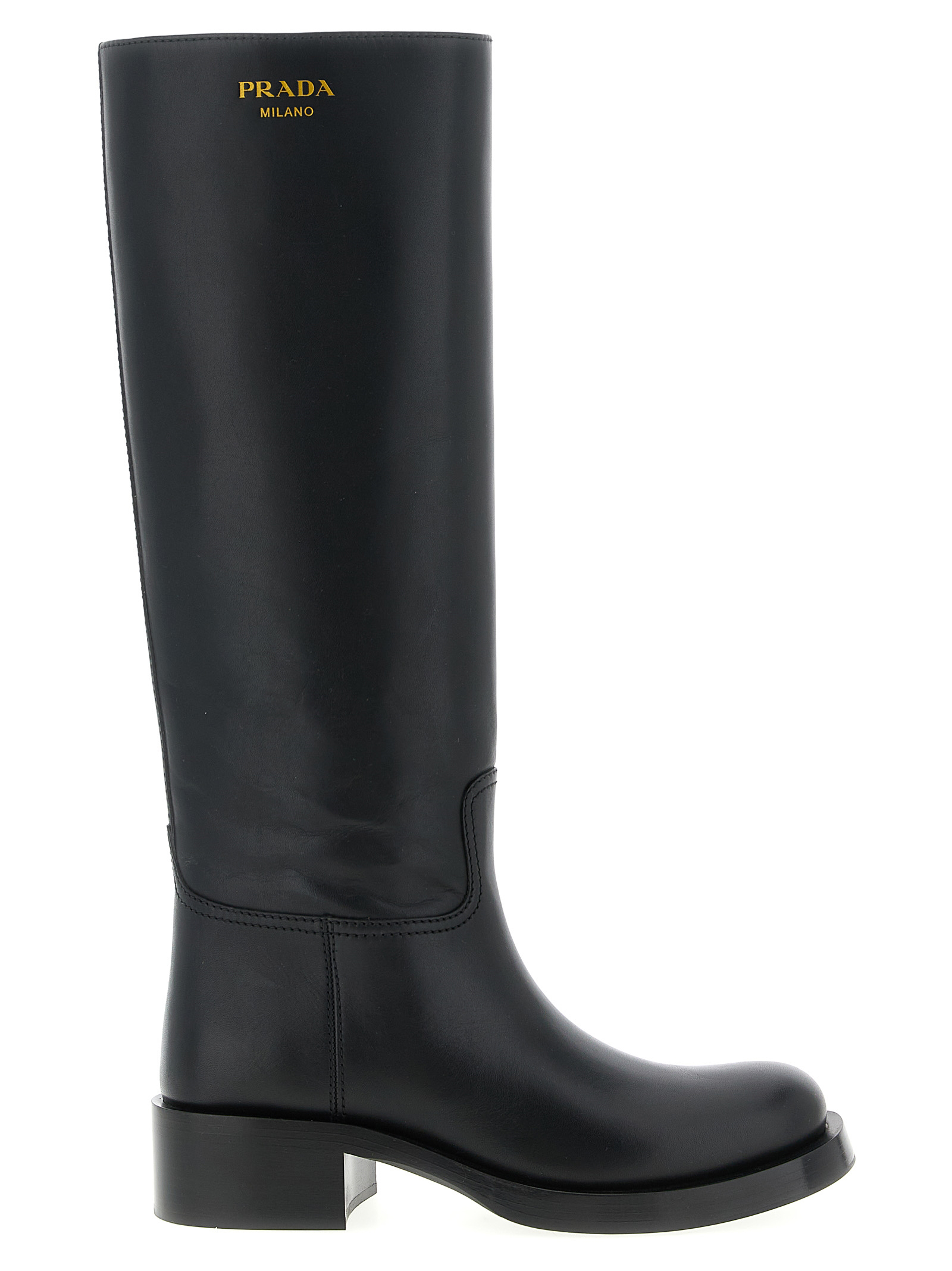 Leather boot, pull-on model, rounded toe, side embossed logo, leather sole.