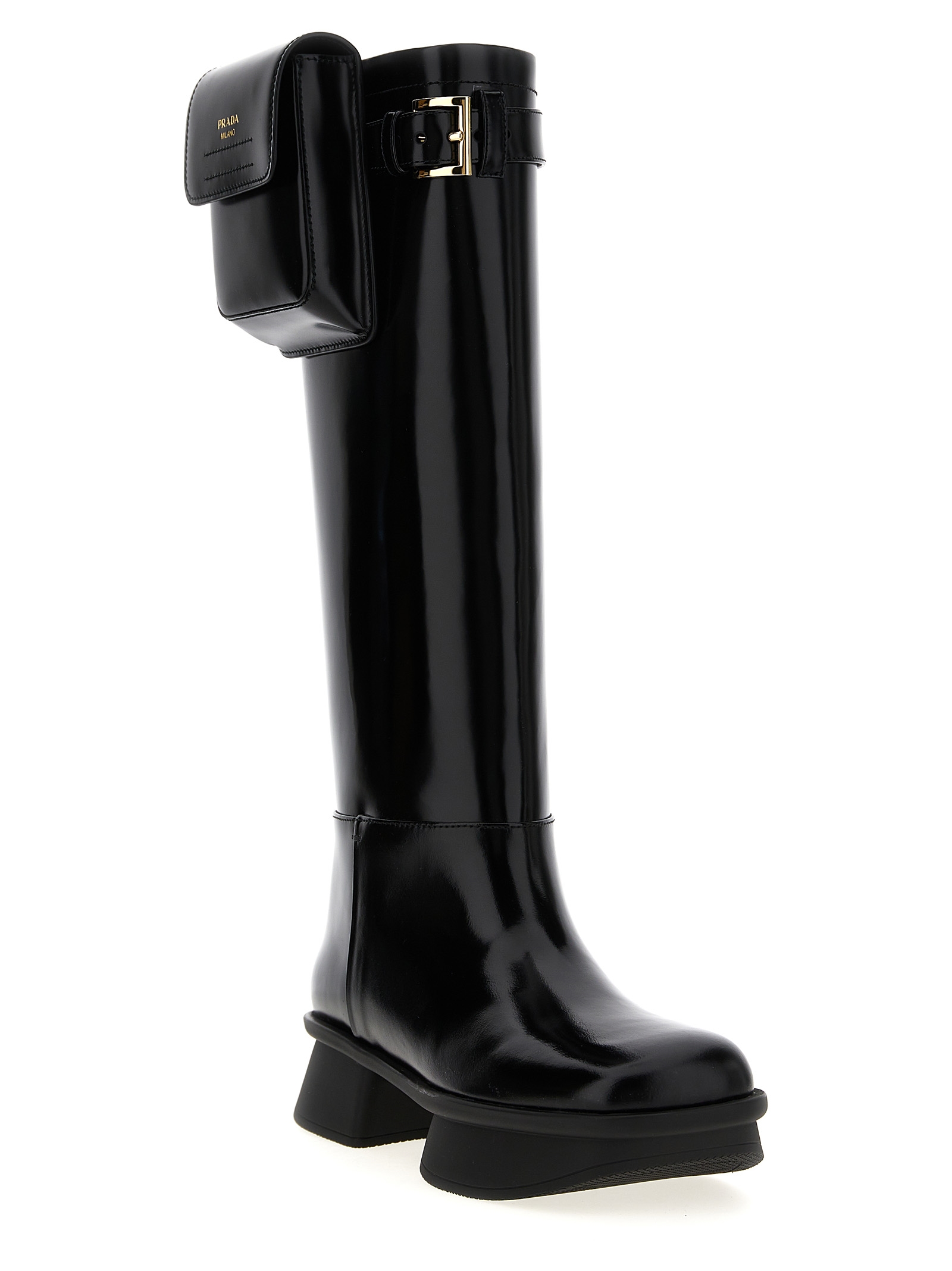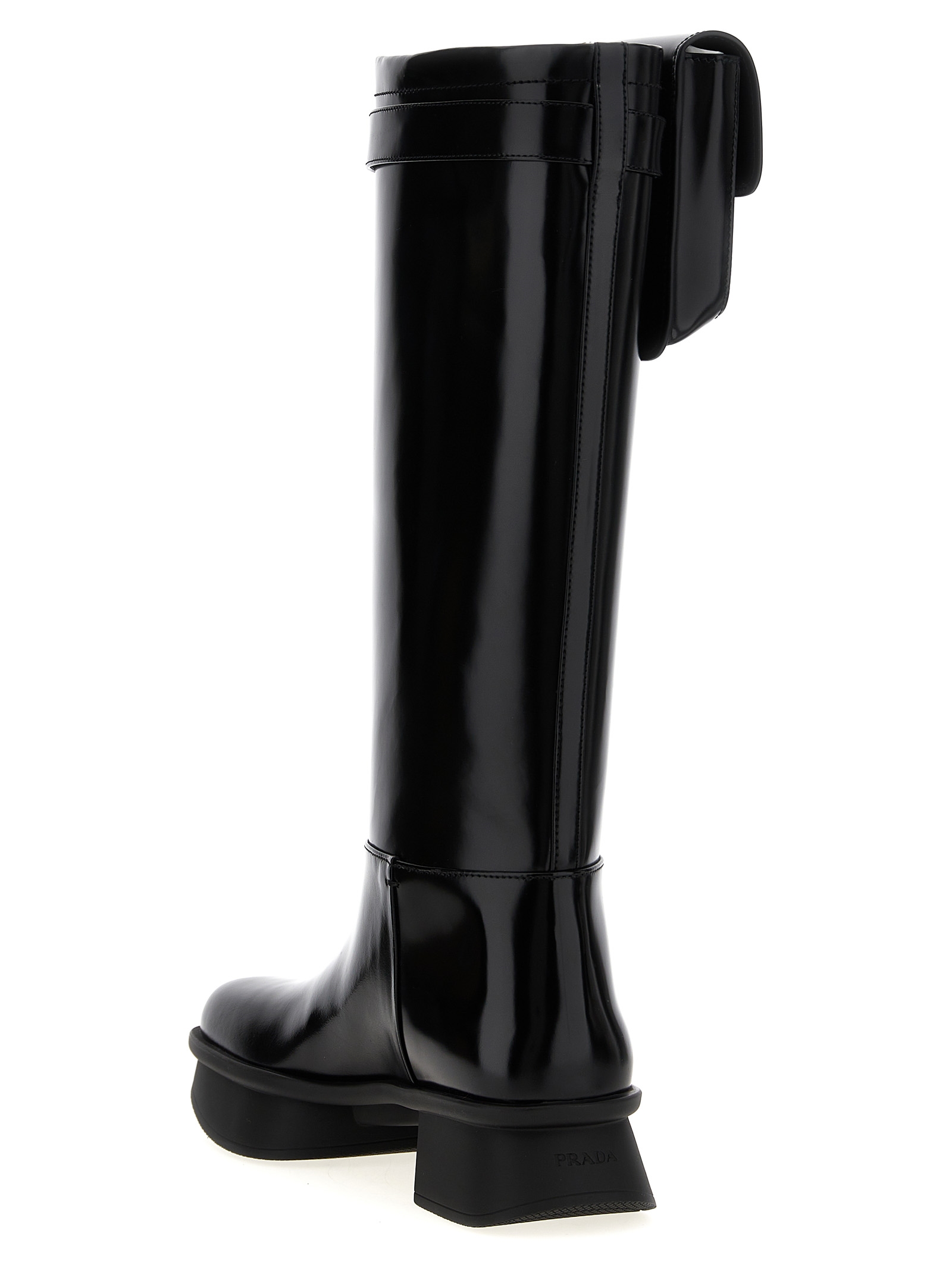'Equal' brushed leather boots, monobloc rubber sole, strap with removable pouch.