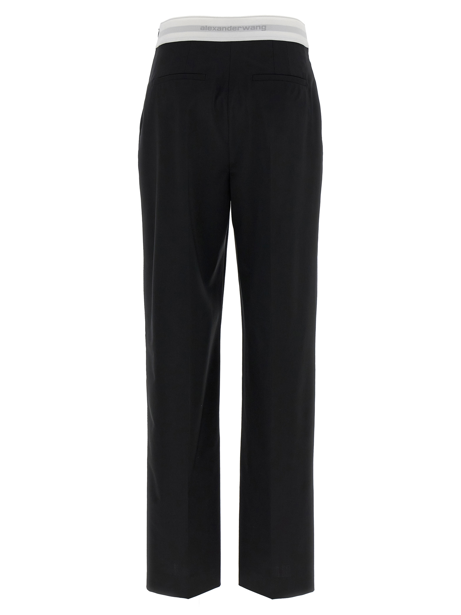 Wool pants, elastic with contrast jacquard logo at the waist, pleats and stretched pleat, straight leg, trompe l'oeil flap, pockets, side zip closure.