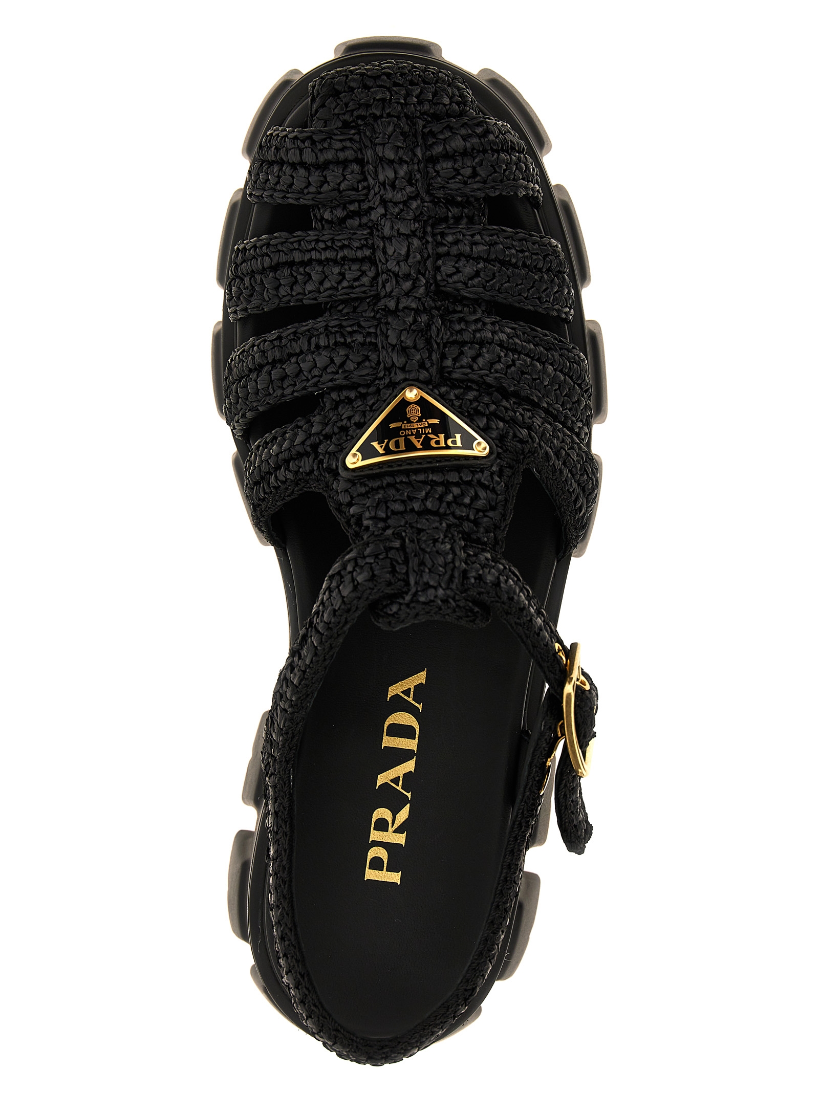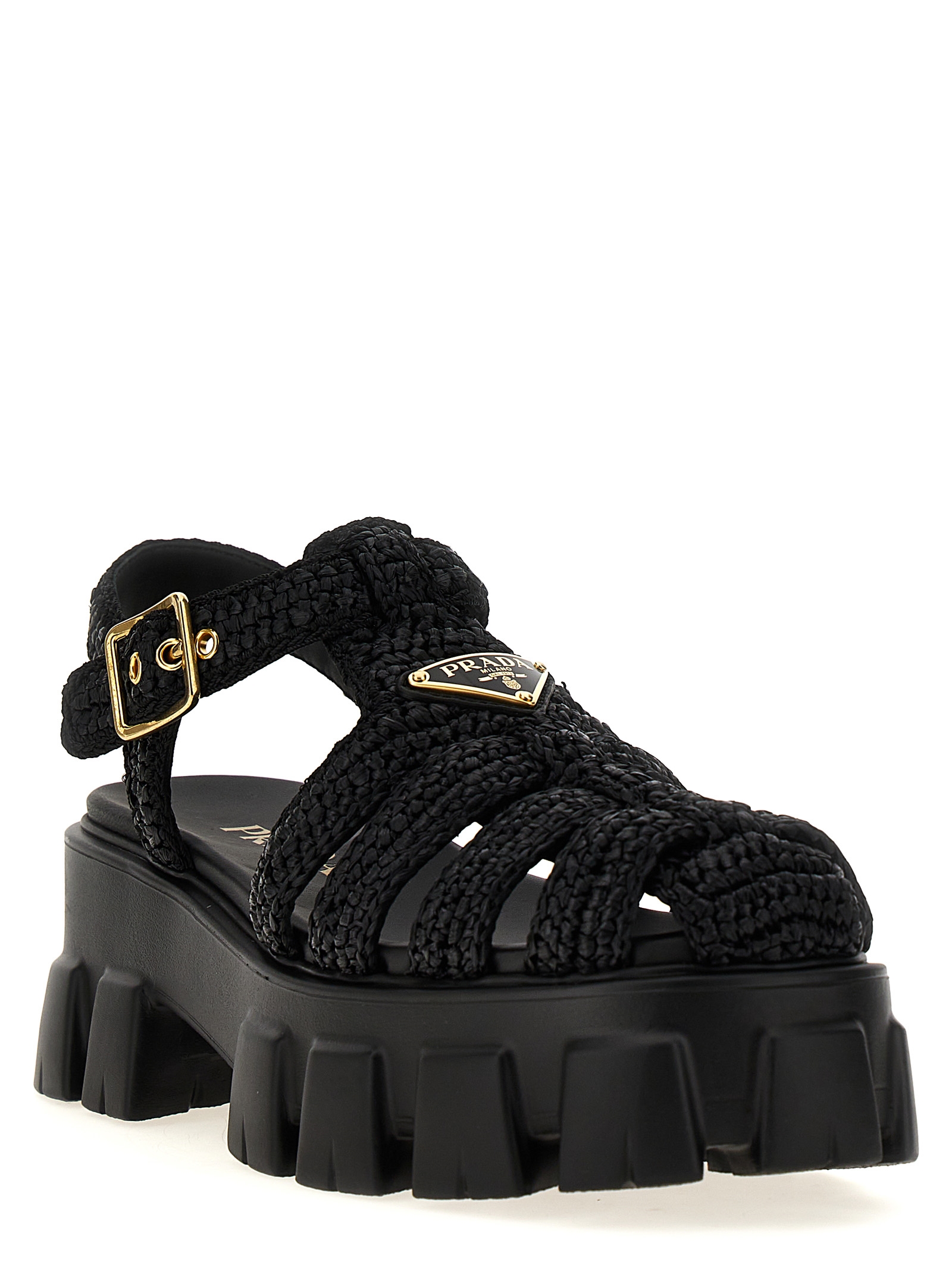 Сандалии «Монолит» из плетеной рафии с треугольным логотипом спереди и фигурной резиновой подошвой.Характеристики товара