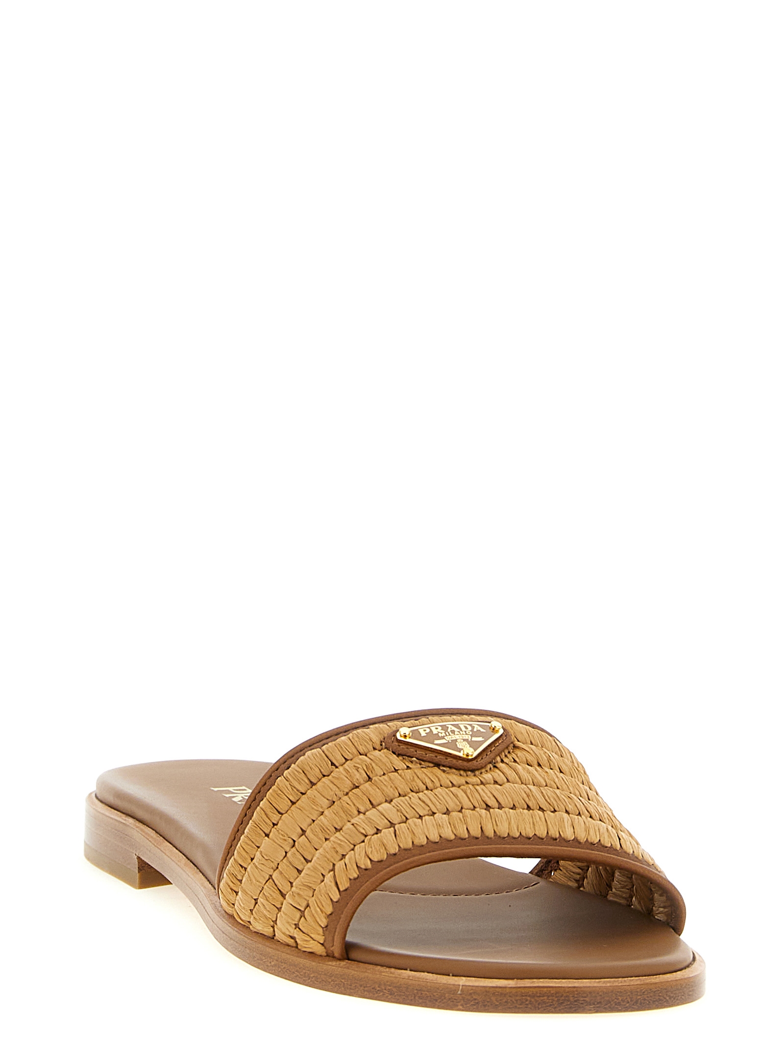 Slides in woven viscose raffia with crochet and smooth leather craftsmanship, front enameled metal triangle logo, monobloc leather and rubber sole. Handcrafted product, any imperfections are to be considered characteristics of uniqueness.Характеристики товара