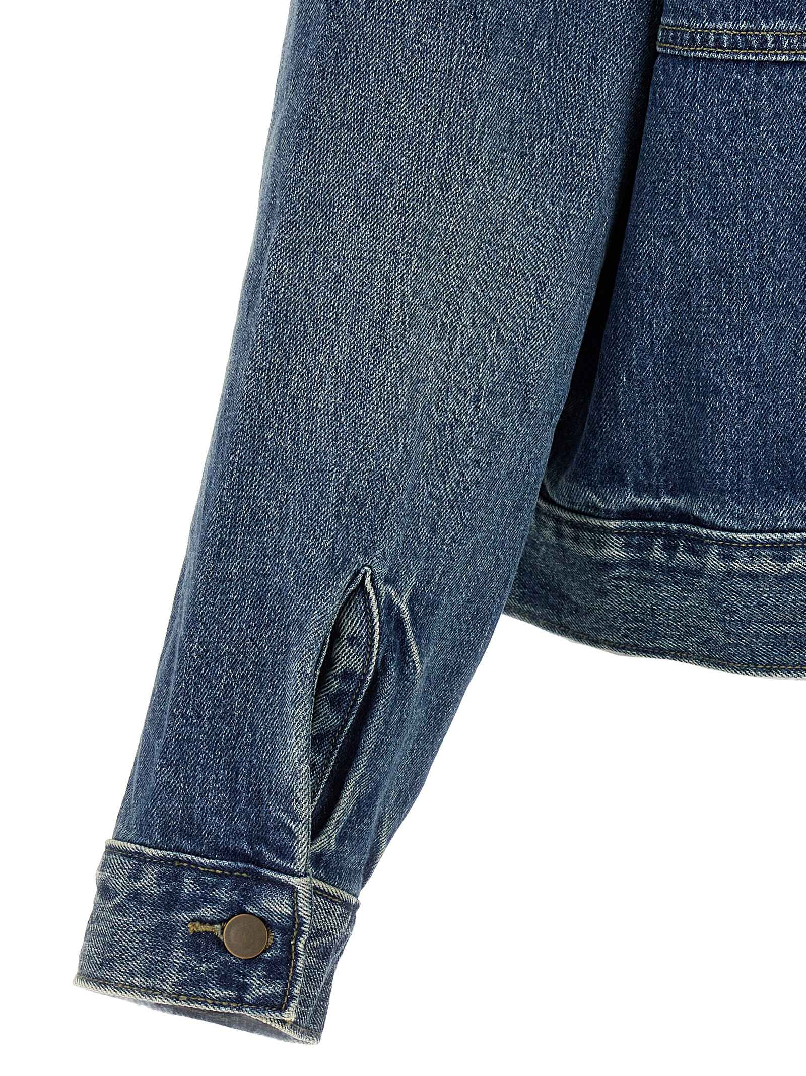 Джинсовая куртка-тракер из выстиранного хлопка с кожаной нашивкой с логотипом на спине, воротником рубашечного типа, застежкой-молнией спереди, карманами, длинными рукавами с манжетами и приспущенными плечами.Характеристики товара