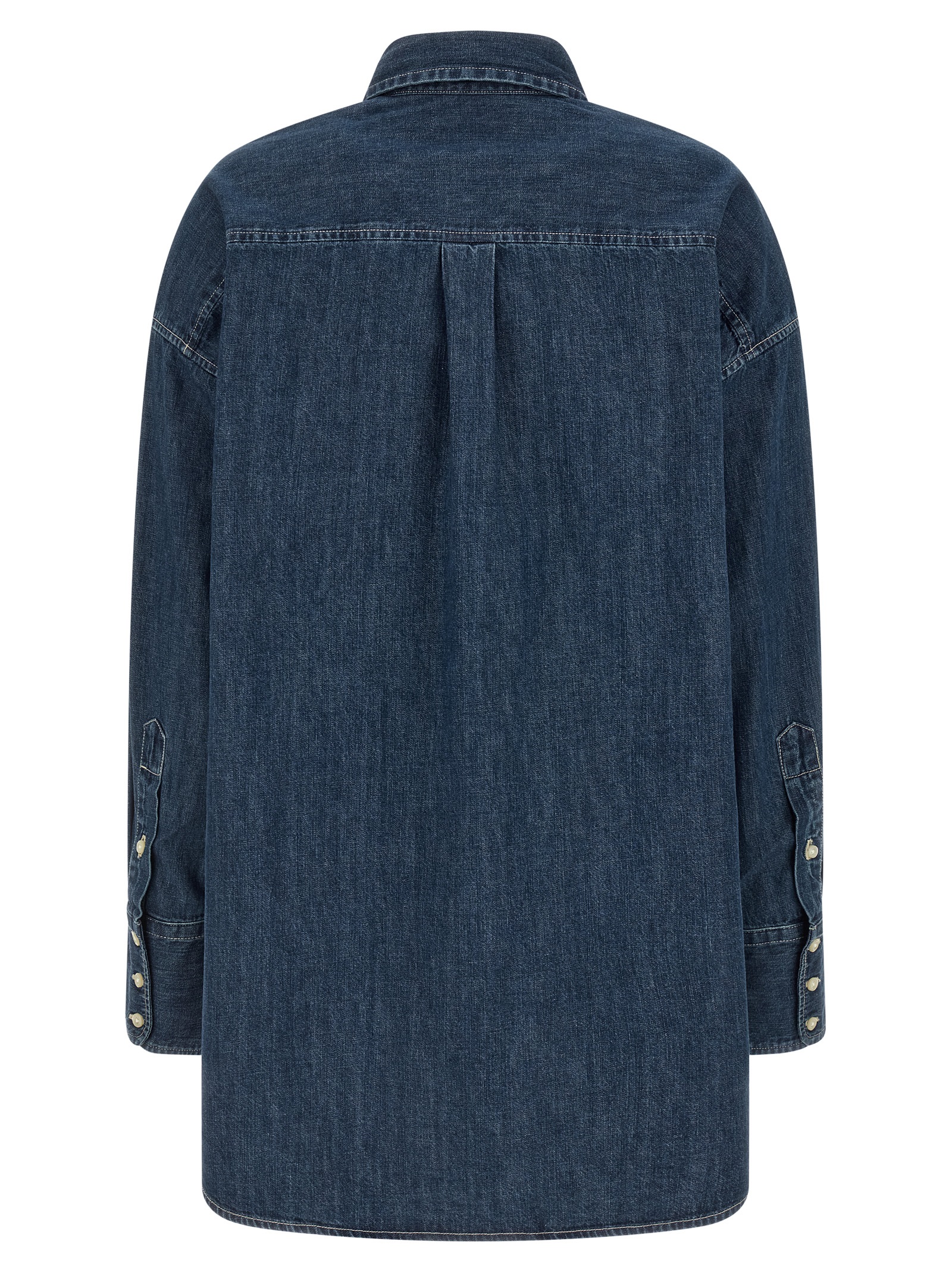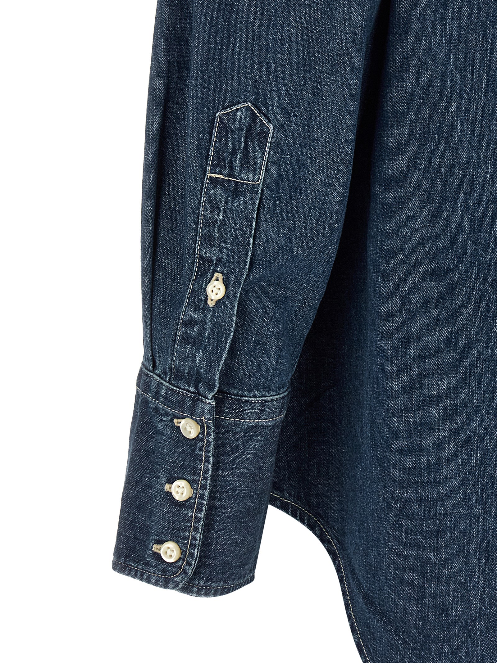 Cotton denim shirt with contrast stitching, trapeze silhouette, trompe l'oeil plastron and front button closure, long sleeves with dropped shoulders, logo embroidered cuffs, asymmetrical rounded hem.