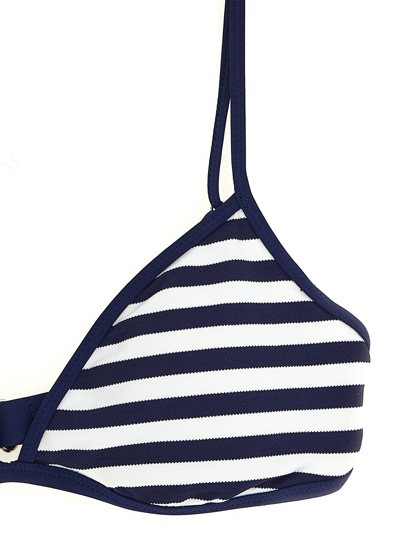 Верхняя часть бикини из полосатой ткани пике, треугольный дизайн, съемные чашечки, тонкие регулируемые бретели, регулируемая застежка на крючки сзади. ЭКОЛОГИЧНОСТЬ: Изделие изготовлено из переработанных материалов.