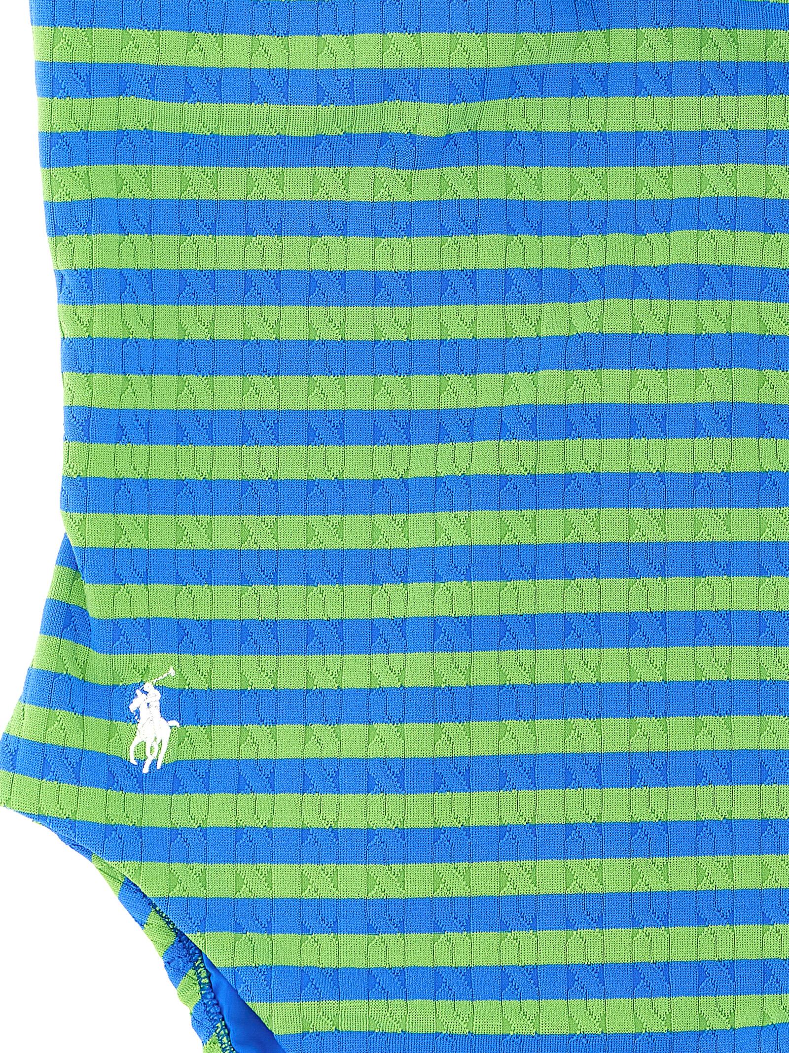 Цельный купальник «Lingerie» из технологичной ткани с горизонтальными полосатыми узорами, в олимпийском стиле, с контрастной вышивкой «Pony» и V-образным вырезом спереди, съемными чашечками, тонкими регулируемыми бретелями, круглым вырезом сзади, высоким вырезом для ног и открытой нижней частью.Характеристики товара