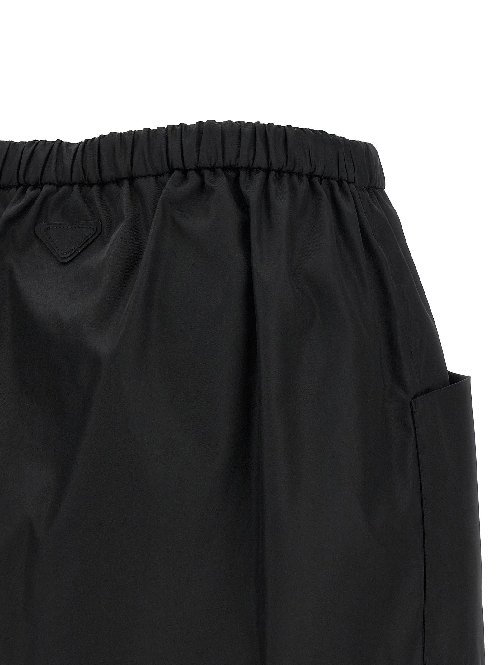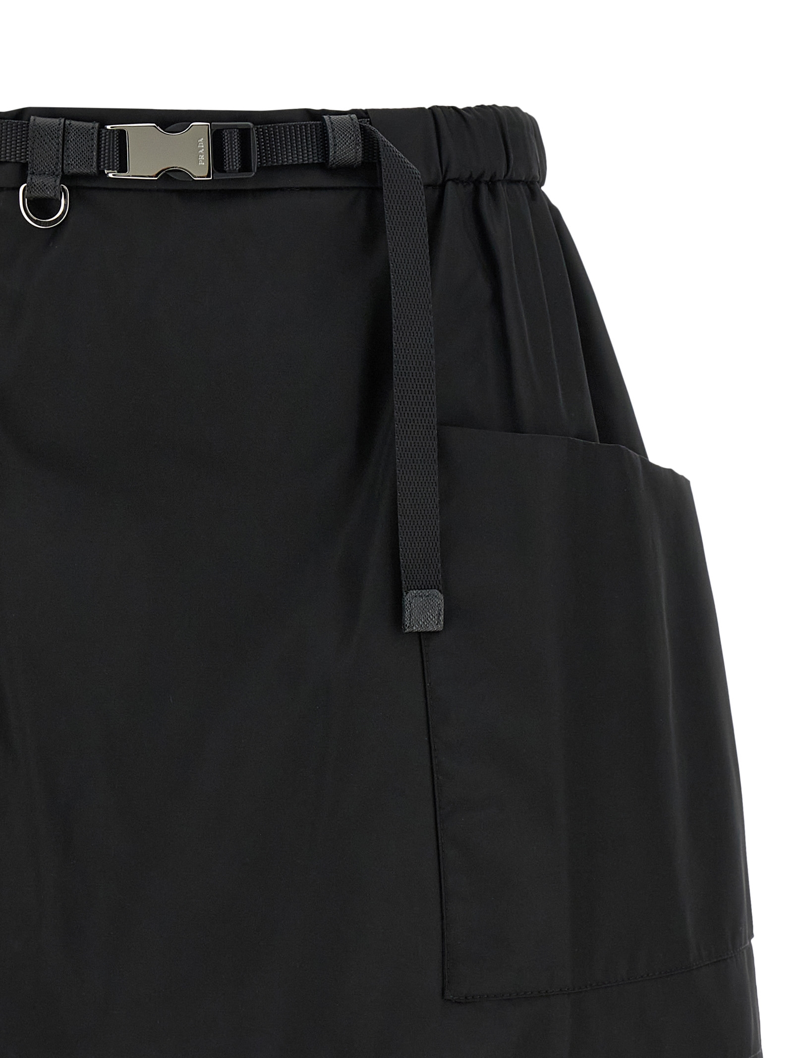 Re-Nylon mini skirt, ribbon belt with tuc closure and Saffiano leather details, pockets, triangle logo in tone-on-tone fabric on the back, unlined. SUSTAINABLE: This product is made with Re-Nylon, a regenerated yarn made from recycled and purified plastic collected in oceans, fishery nets and textile fibers.