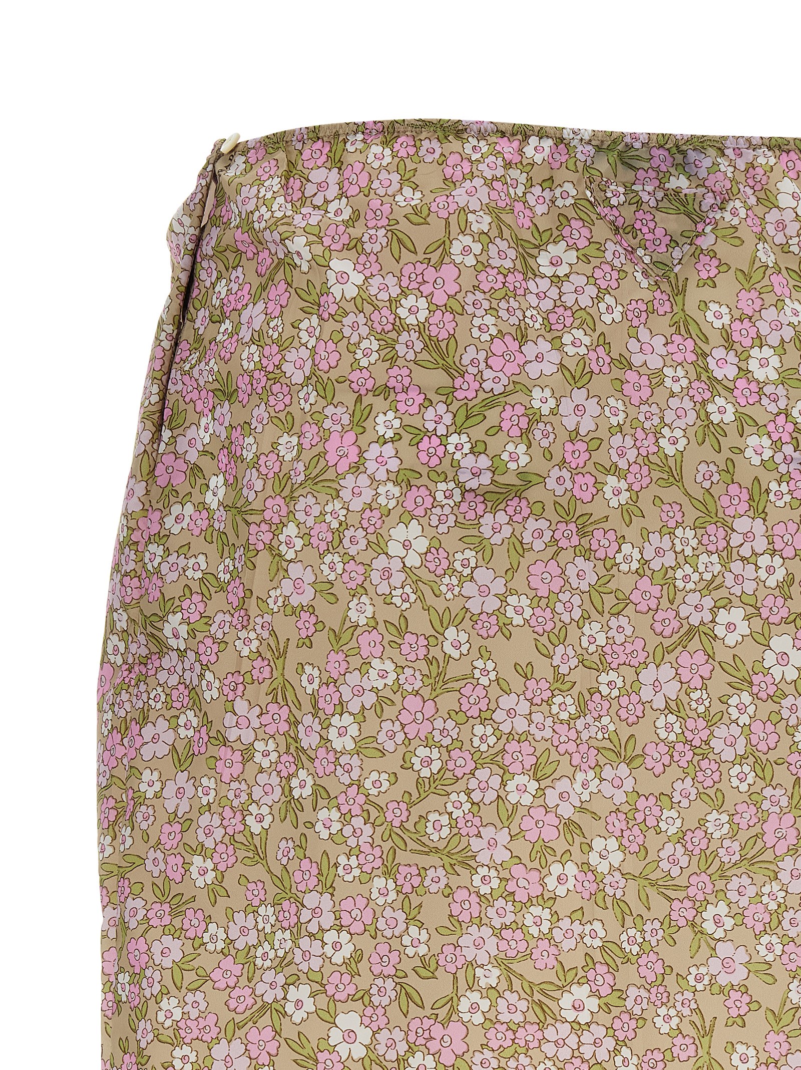All-over nylon 'Blossom' print midi skirt, straight silhouette, tone-on-tone triangle fabric logo on the back, elastic waistband, lace piping on the hem, unlined.