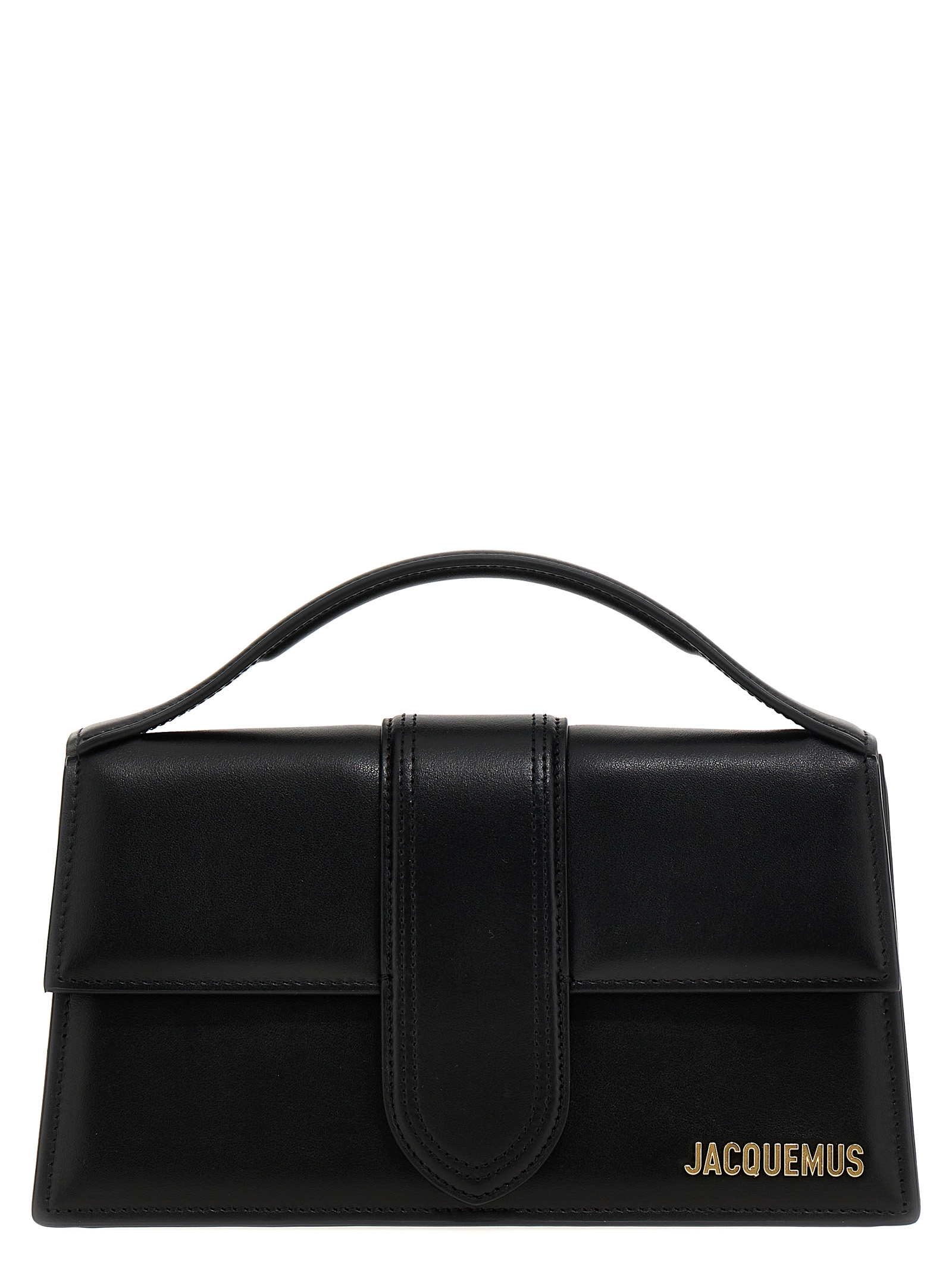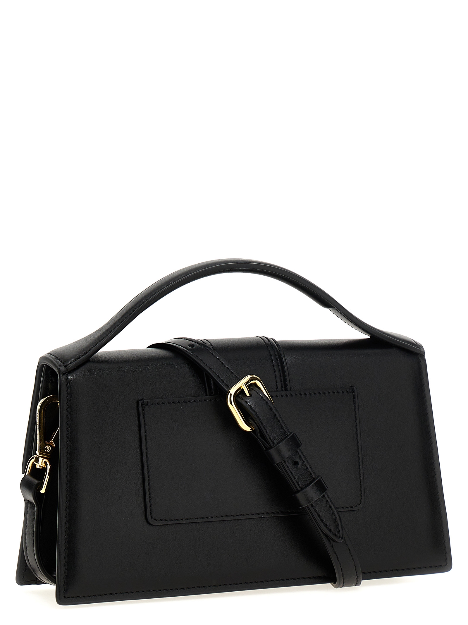 'Le Grand Bambino' leather handbag with magnetic flap closure, front metal logo appliqué, fixed handle, adjustable and removable shoulder strap.