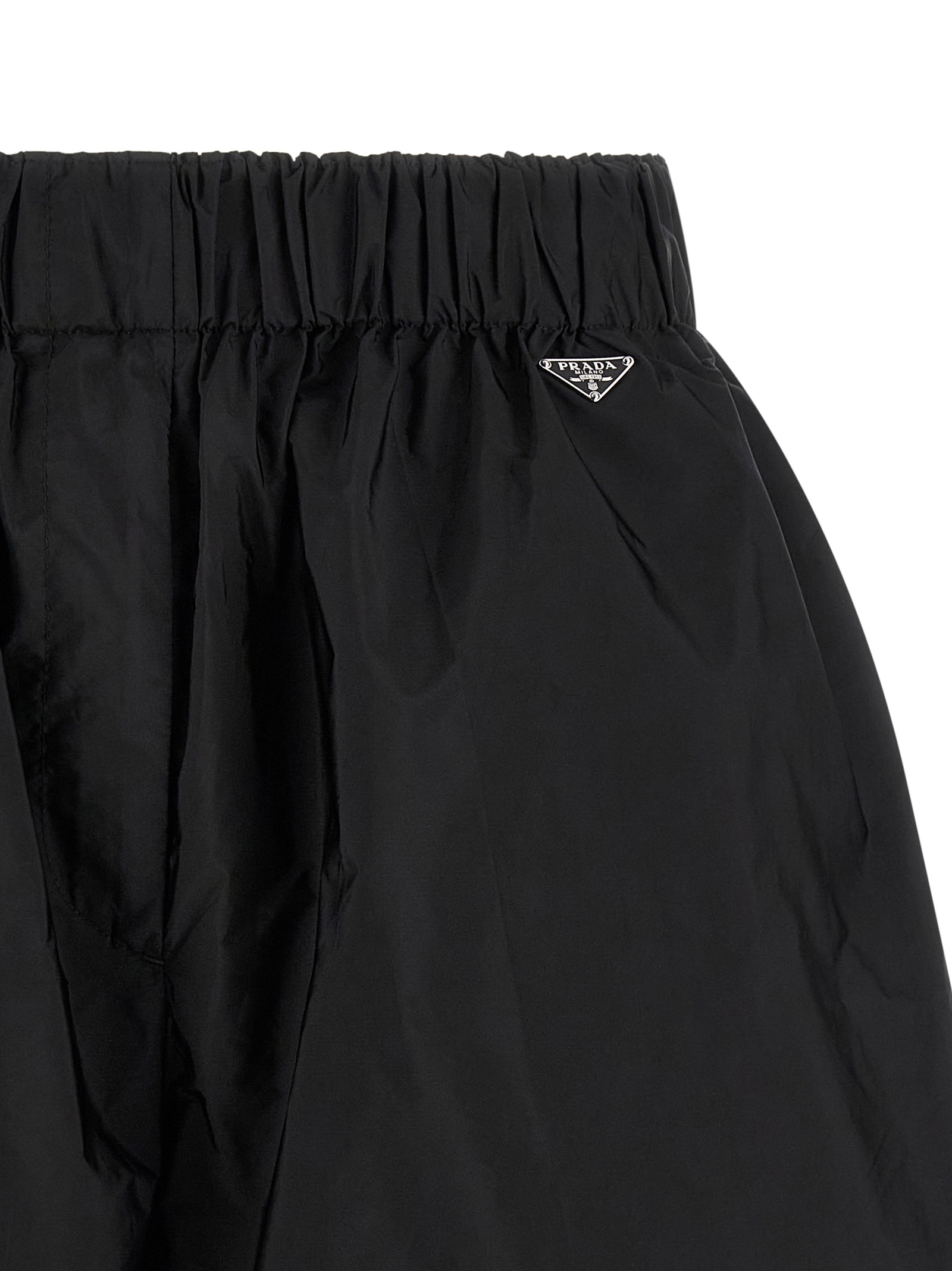 'Re-Nylon Piuma' shorts, elastic waistband, side splits, contrast edging, triangle metal enamel logo detail on the front.