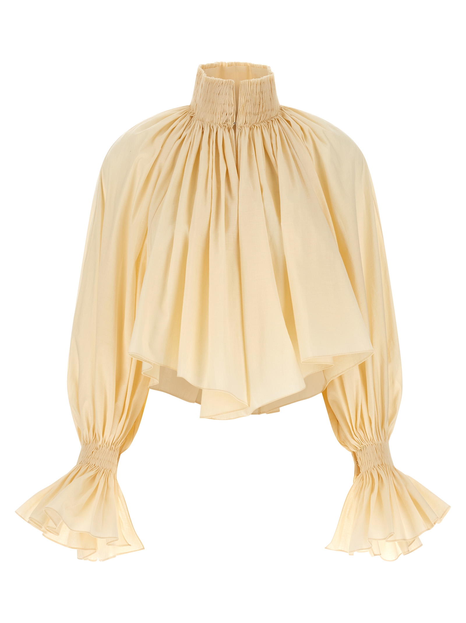 Рубашка Durer из мягкого хлопкового холста, укороченный крой, ручная сборка со складками, высокий воротник-стойка со складками, застежка на крючок и V-образный вырез, длинные широкие рукава-фонарики с манжетами, асимметричный подол. Можно носить с вырезом спереди или сзади.