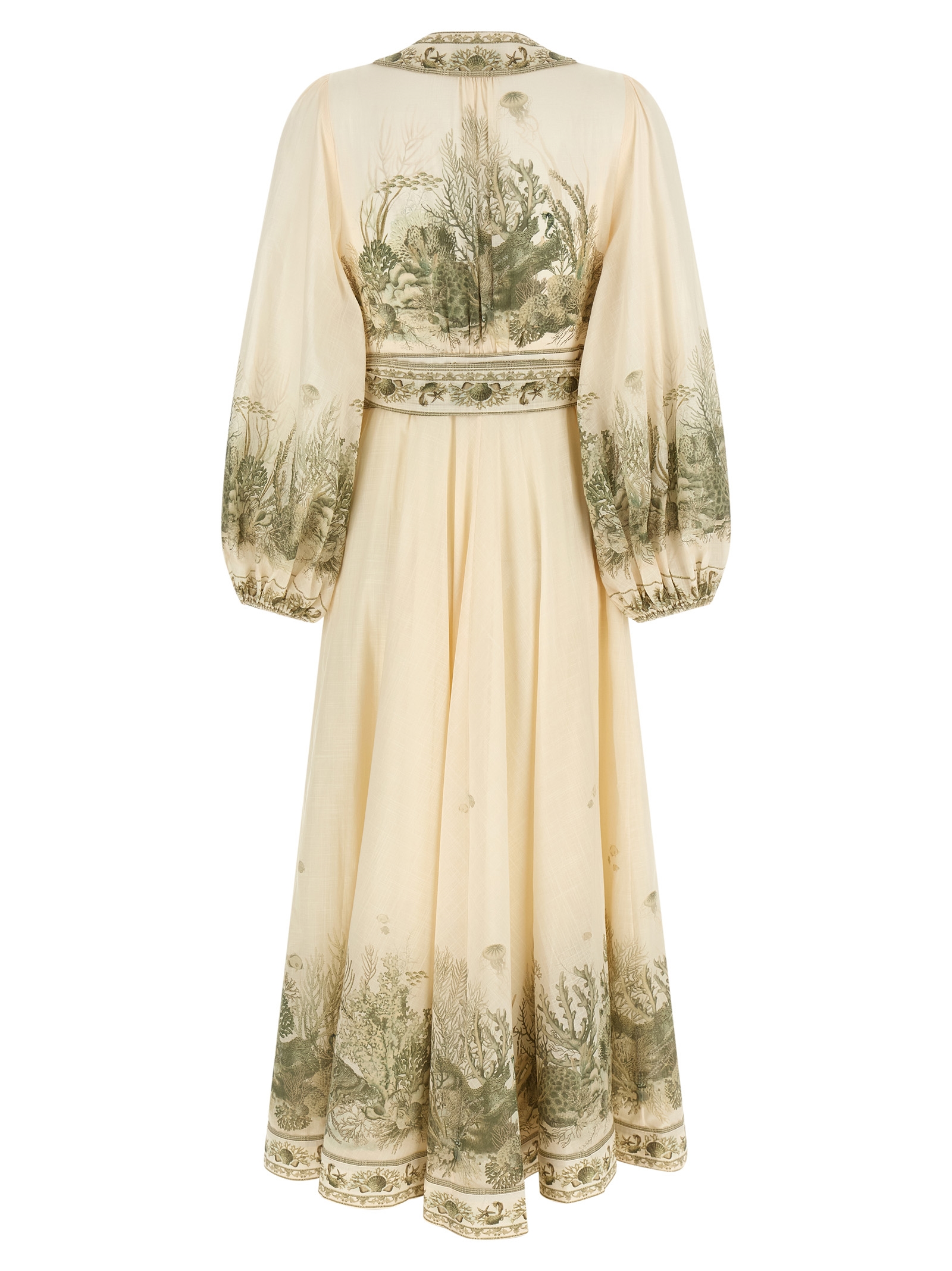 'Wanderlust Wrap Midi' all-over Toile print cotton dress, wallet style with belt to tie at the waist, deep V-neck, long puff sleeves with elastic cuffs.