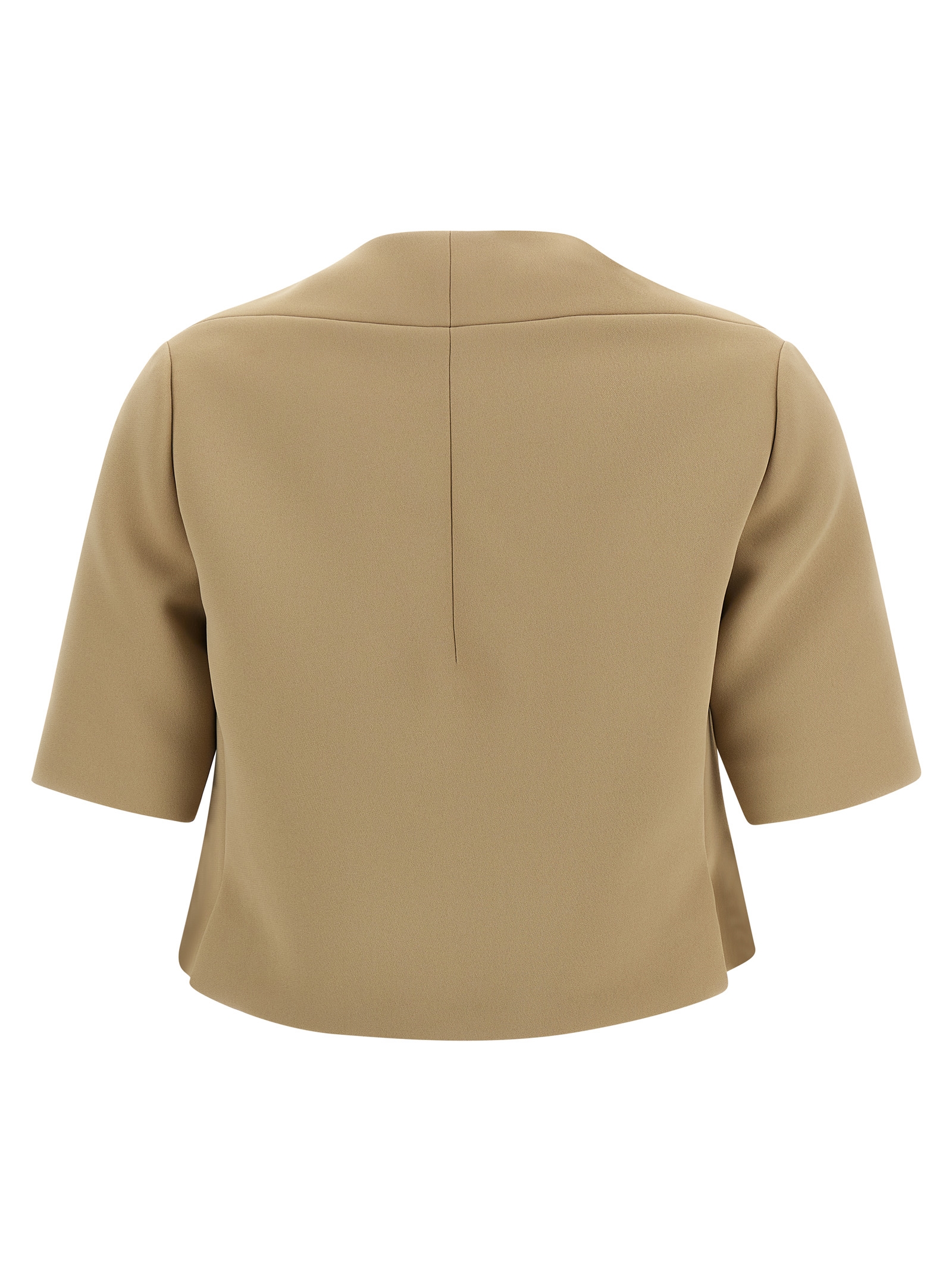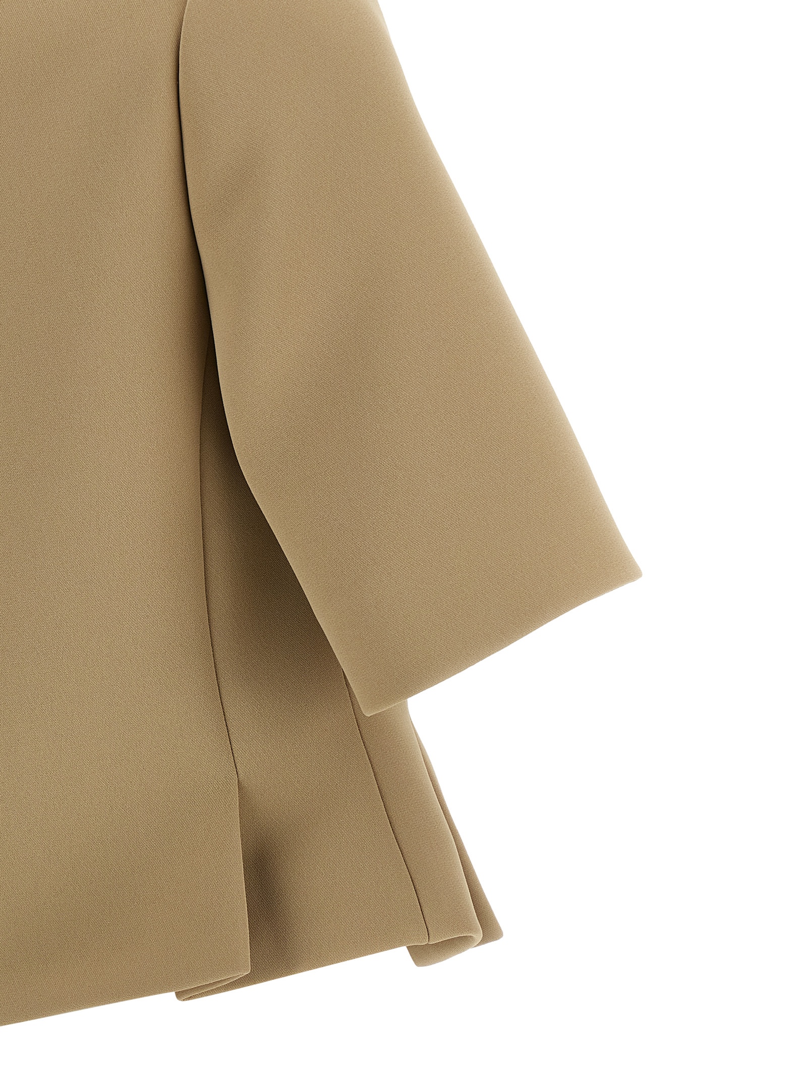'Franc' smooth effect crepe jacket with square geometric neckline with stitched pleats, front button closure, pleated flared waistband, silk lining, 3/4 sleeves.