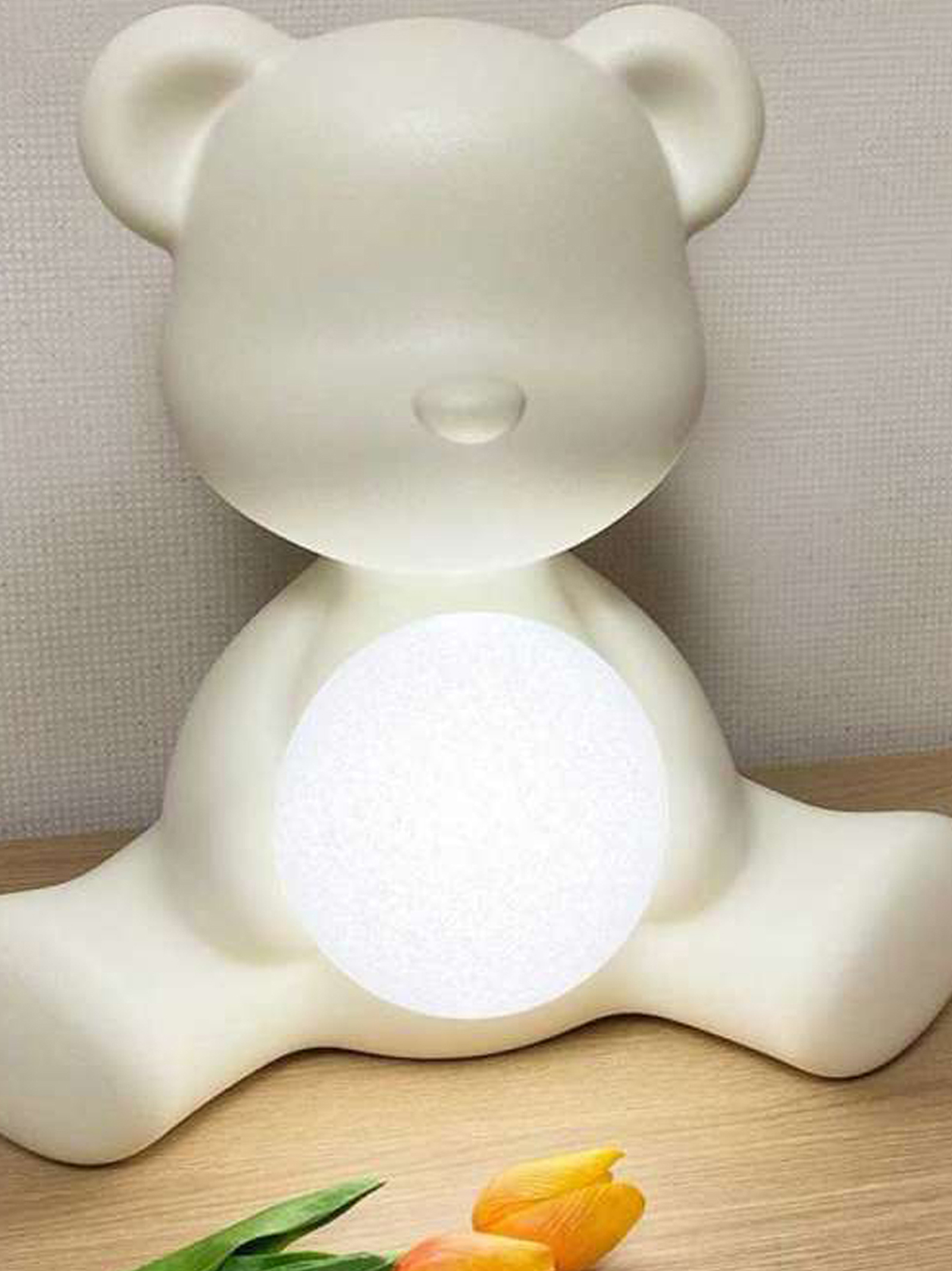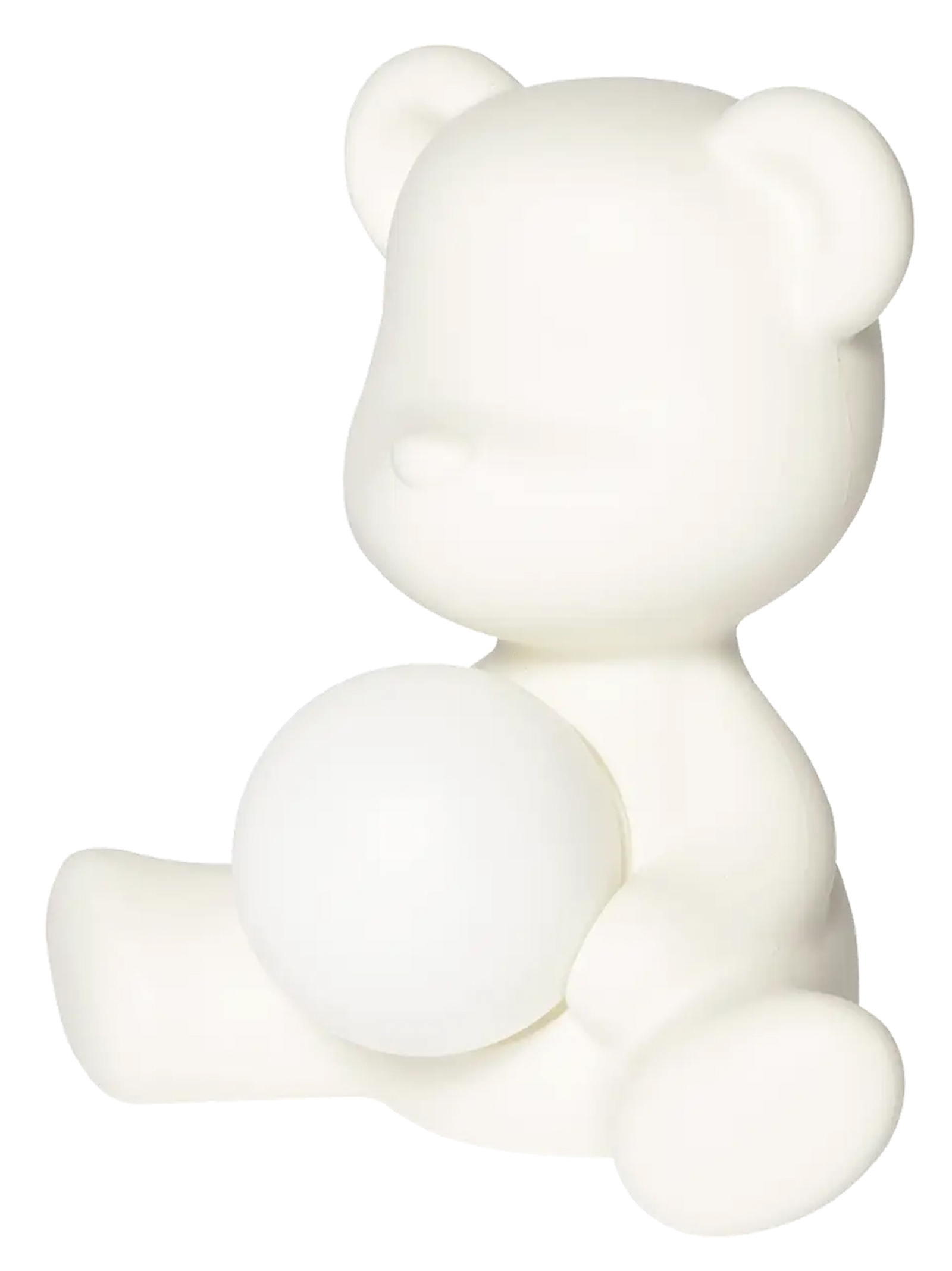 Teddy Girl is a rechargeable, wireless table lamp designed by Stefano Giovannoni with the shape of a traditional teddy bear enclosing a small luminous sphere. Timid and delicate, it emphasizes the tender soul of the teddy bear.