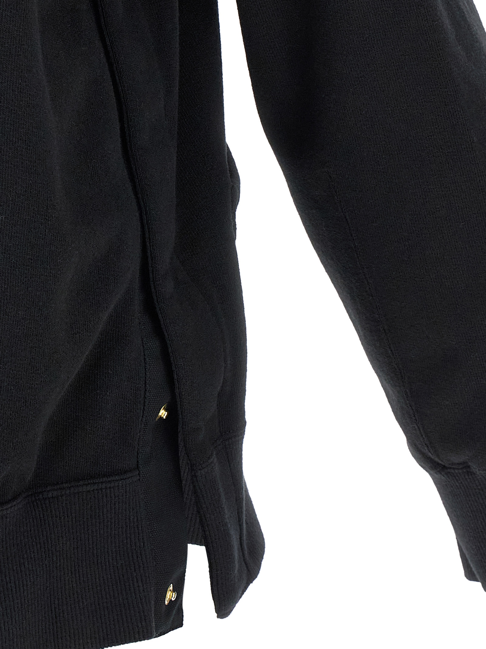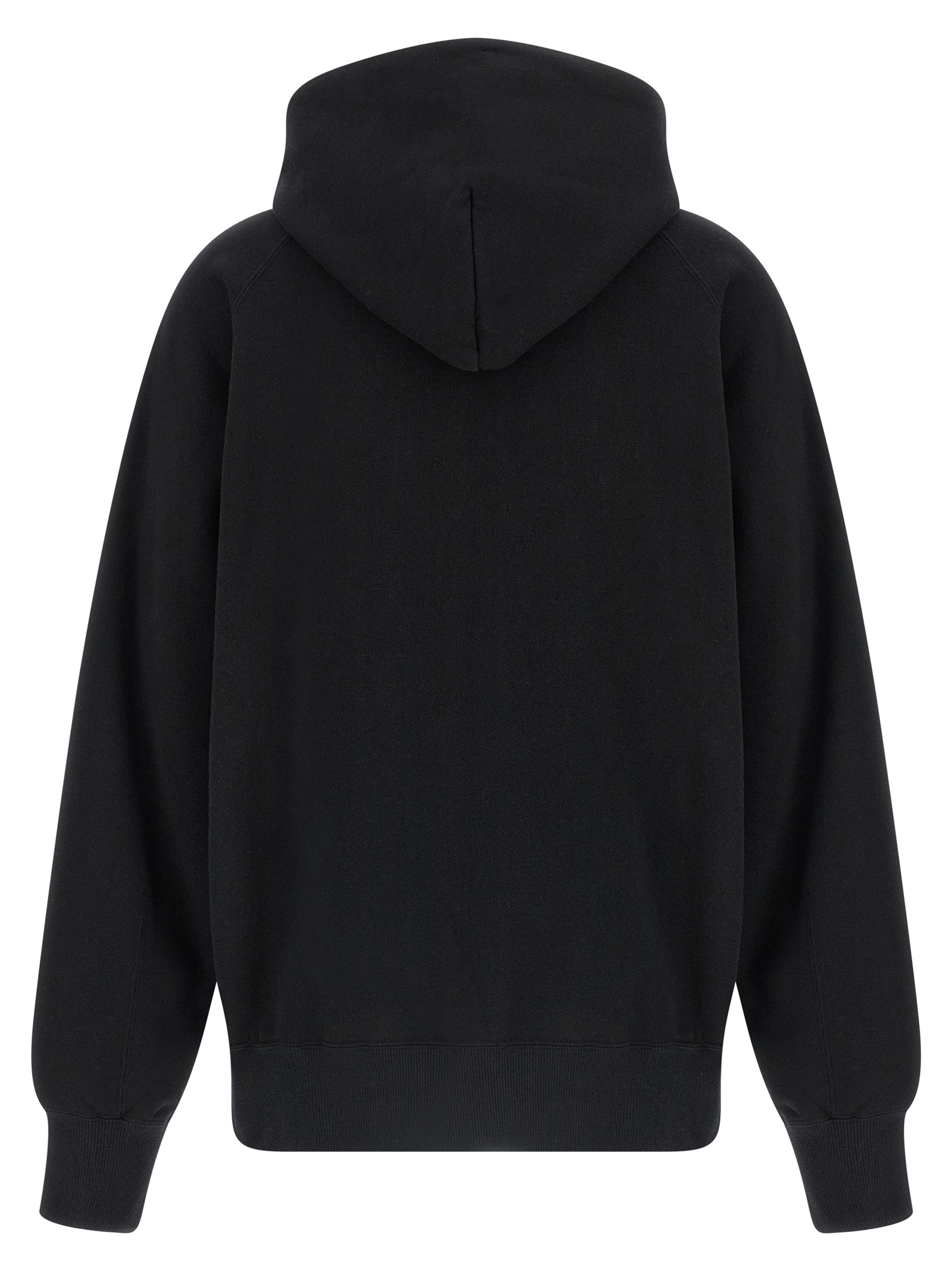 Sacai x Carhartt Wip capsule hoodie in fleece cotton with lightweight ribbed cotton inserts, kangaroo pocket with front logo patch, long sleeves with cuffs and dropped shoulders, side slits with snap buttons.