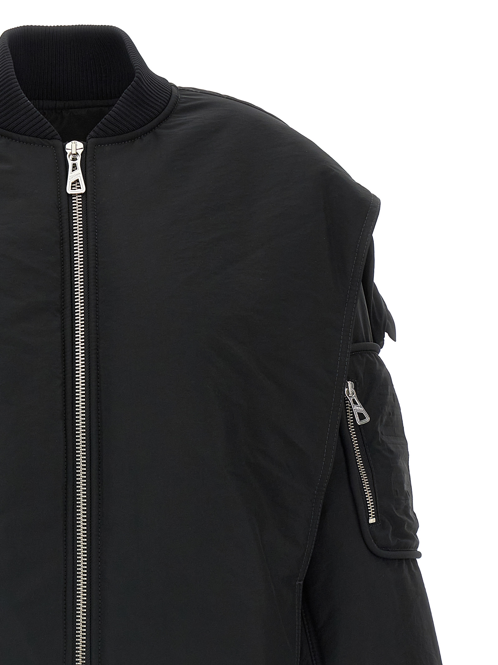 'The Hooded Bomber' padded nylon jacket with stretch ribbed knit details, crop model, maxi hood hidden on the back, front zip closure, pockets, long cuffed sleeves, elastic hem.