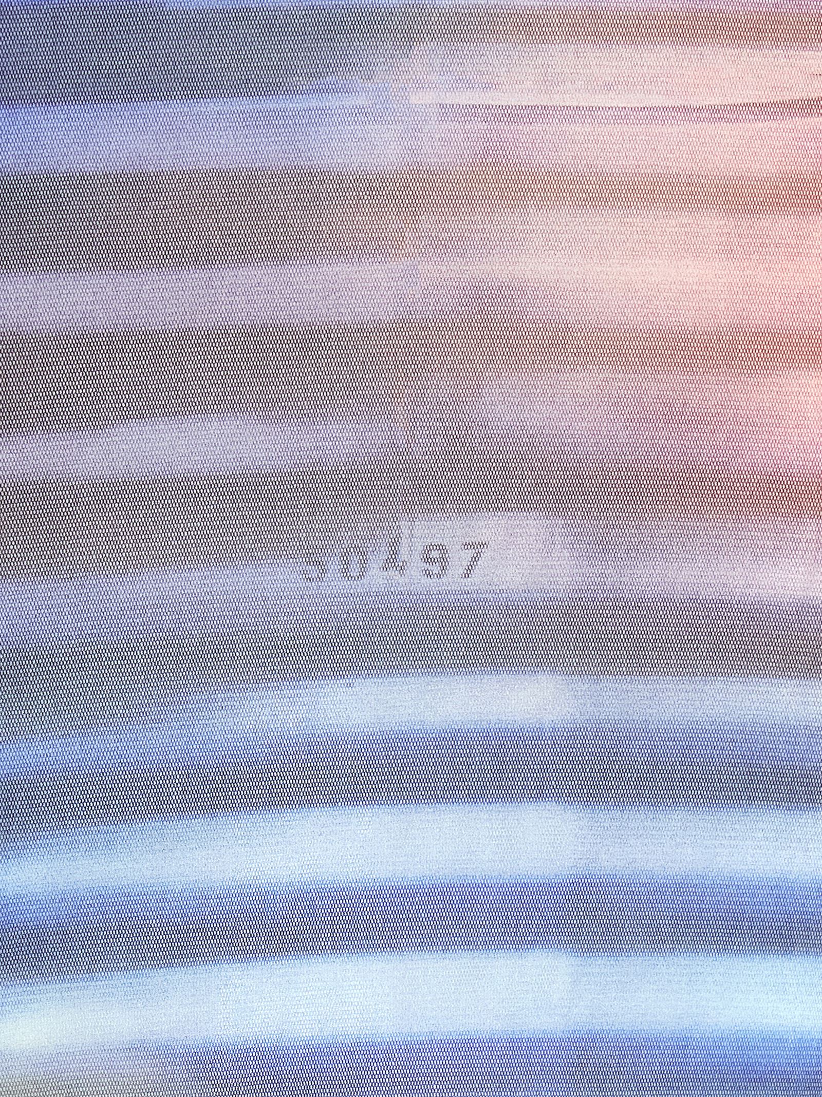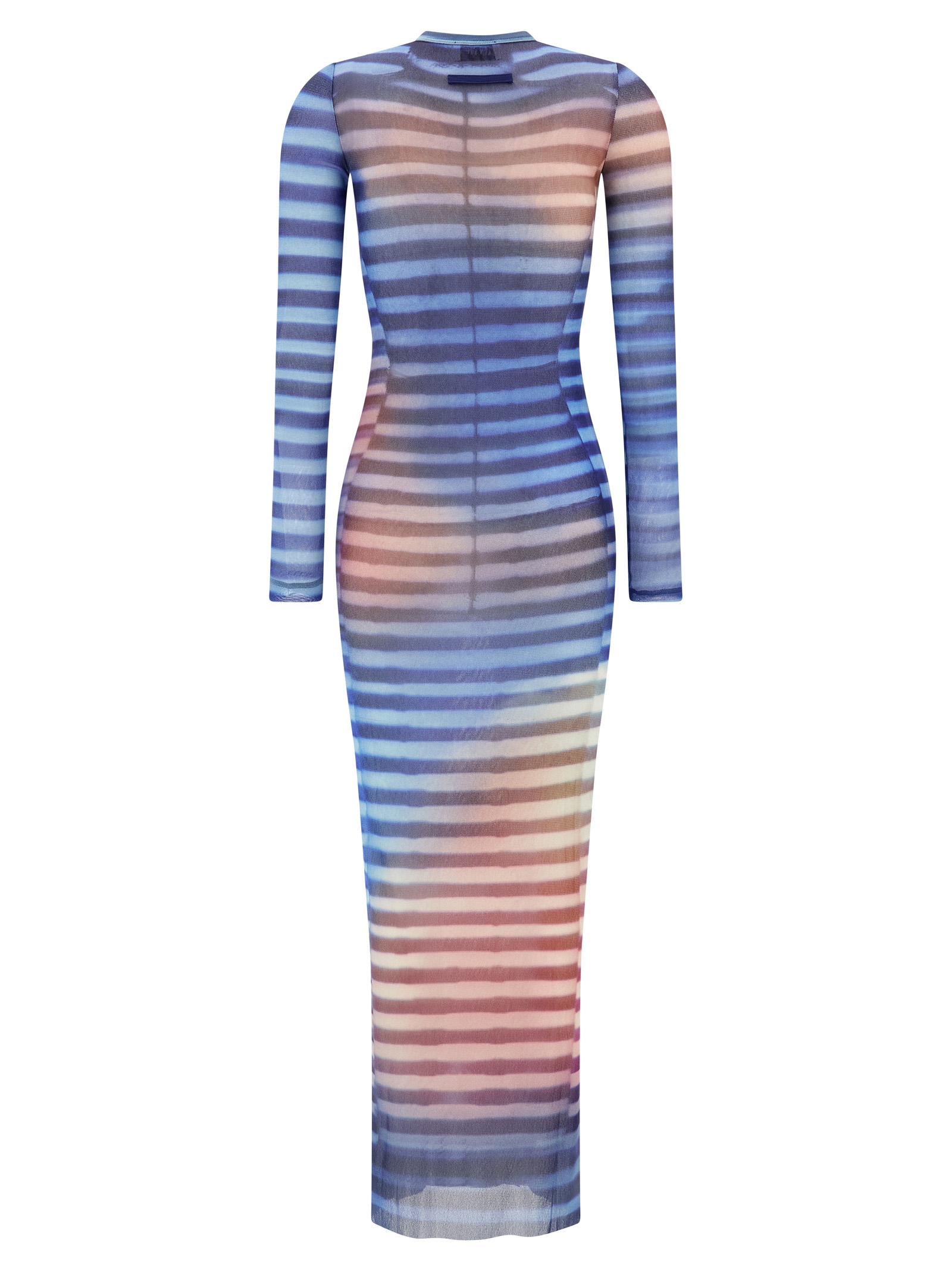 Long dress in stretch tulle with all-over 'Air' print, crew neck, long sleeves, raw cut hem.