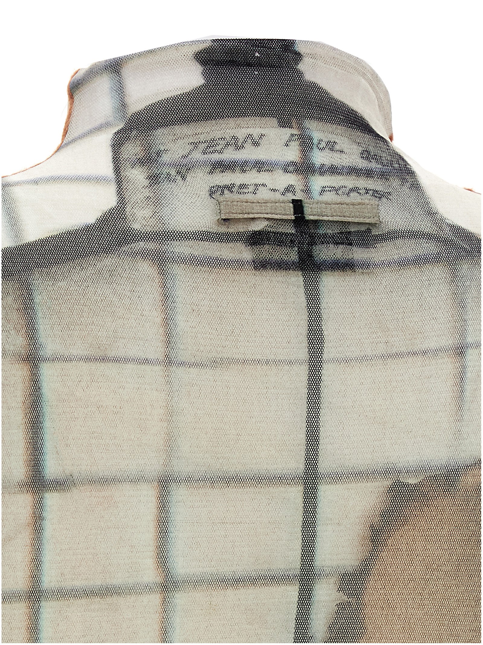 All-over 'The Fire' print stretch tulle bodysuit, draped solid tulle lining, high neck, long sleeves, snap buttons on the hem, and high-leg.