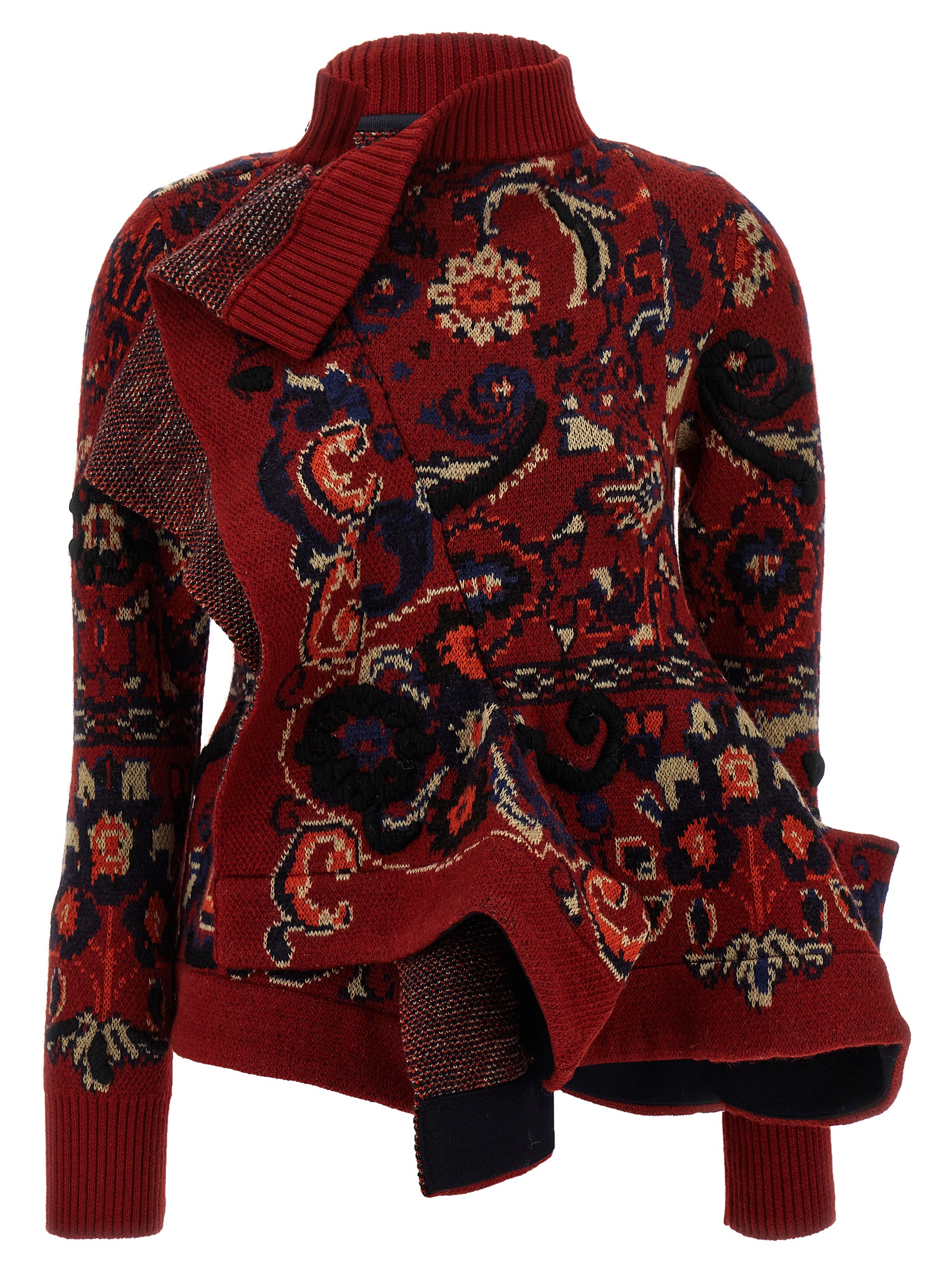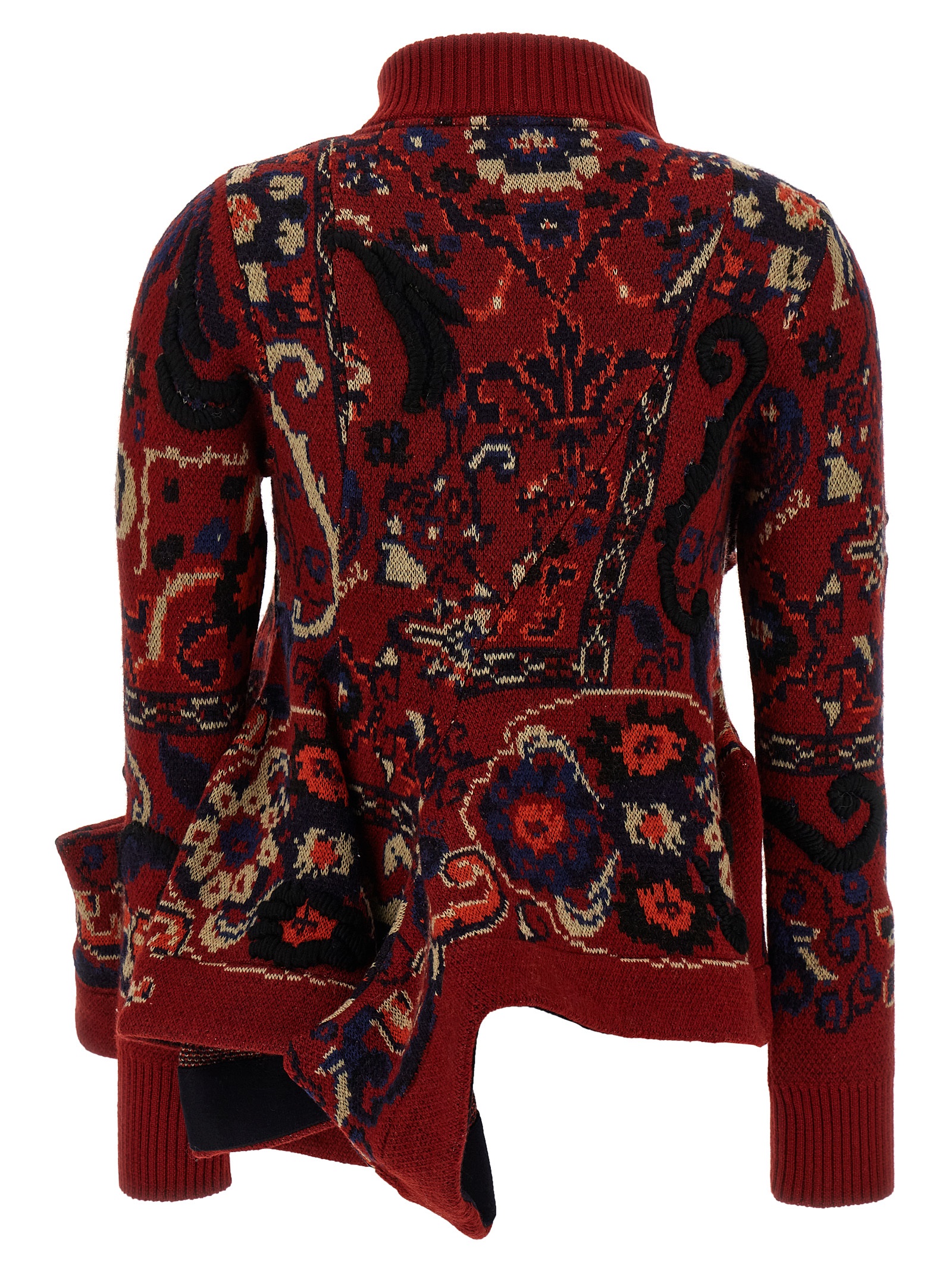 Wool knit cardigan with floral jacquard and 3D embroidery, high neck, front oblique zip closure, ruffle on the hem, long cuffed sleeves.