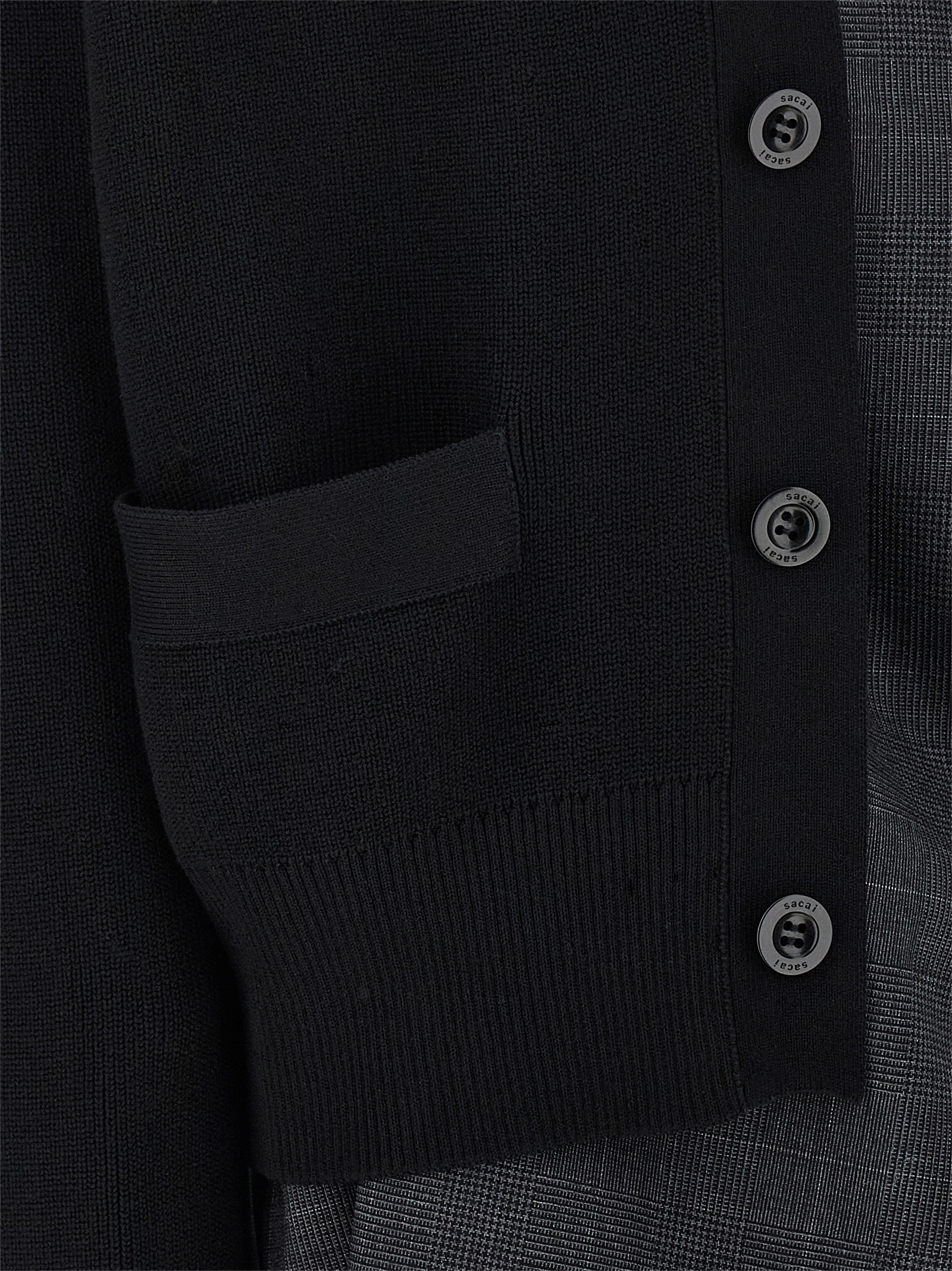 Double layer garment consisting of knitted wool cardigan, front button closure, long cuffed sleeves, pockets and insert blazer gilet in check wool and tulle, peak lapels, front button closure, flounced back.