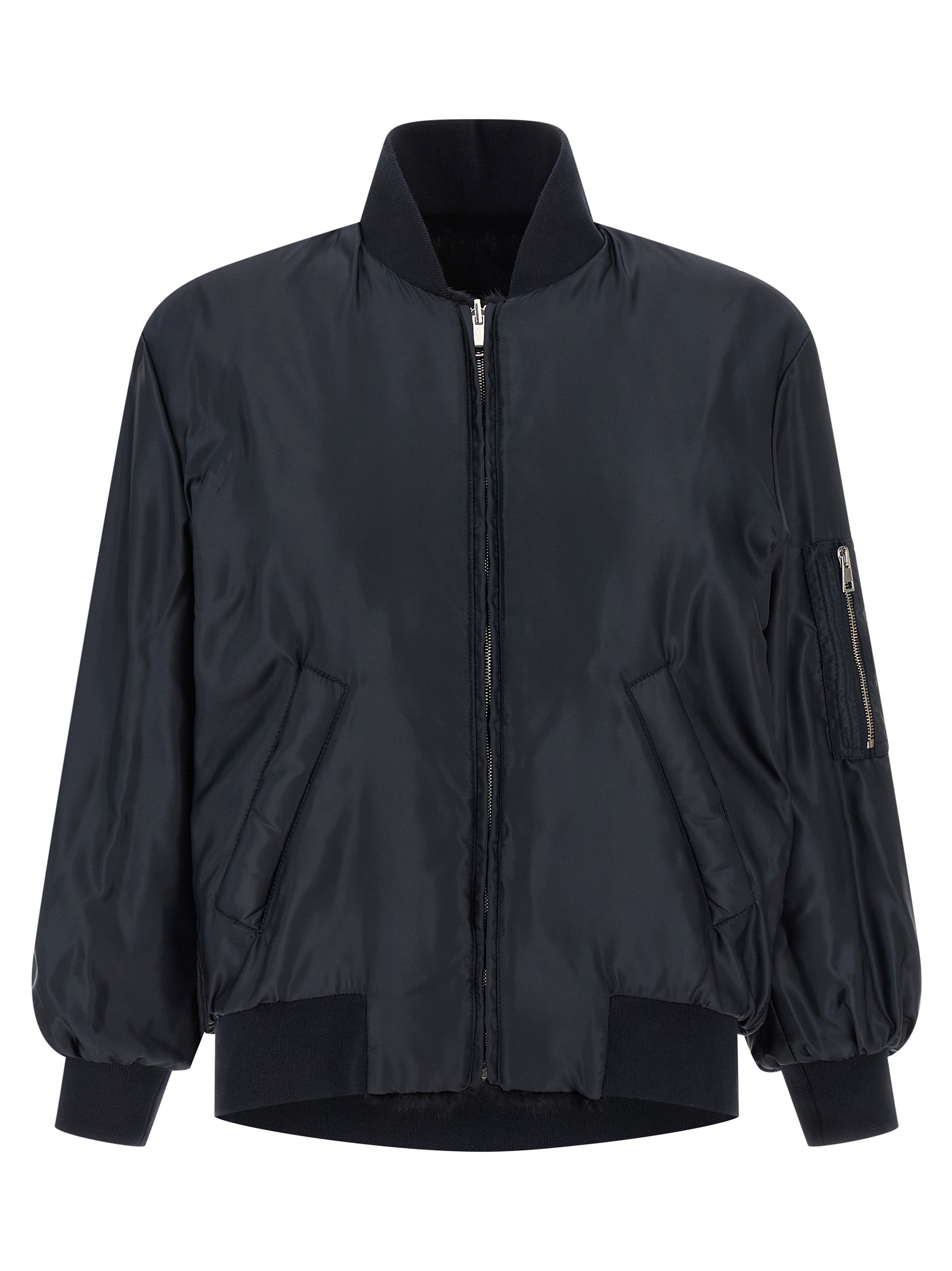 Mink fur bomber jacket, zip closure, side pockets, elastic knit collar and cuffs and hem, long sleeves.