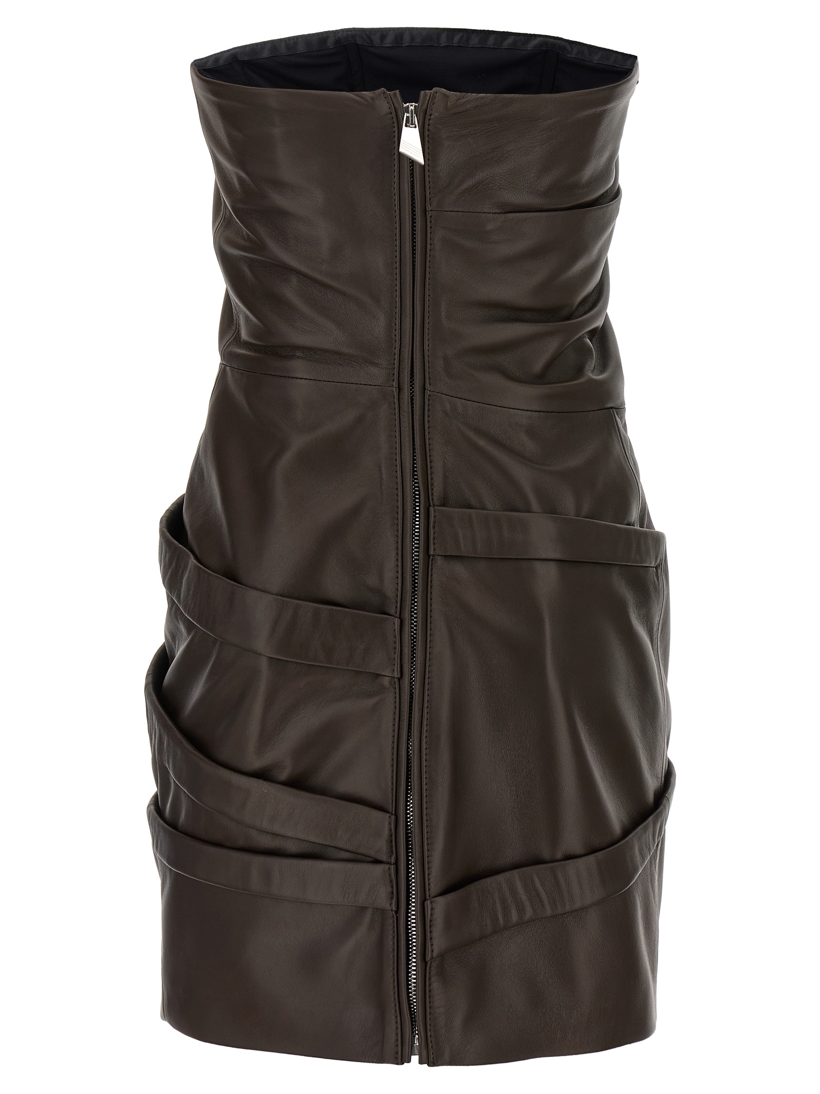 Кожаное мини-платье с открытыми плечами, оборками и рюшами, интегрированным лифом, застежкой-молнией сзади.
