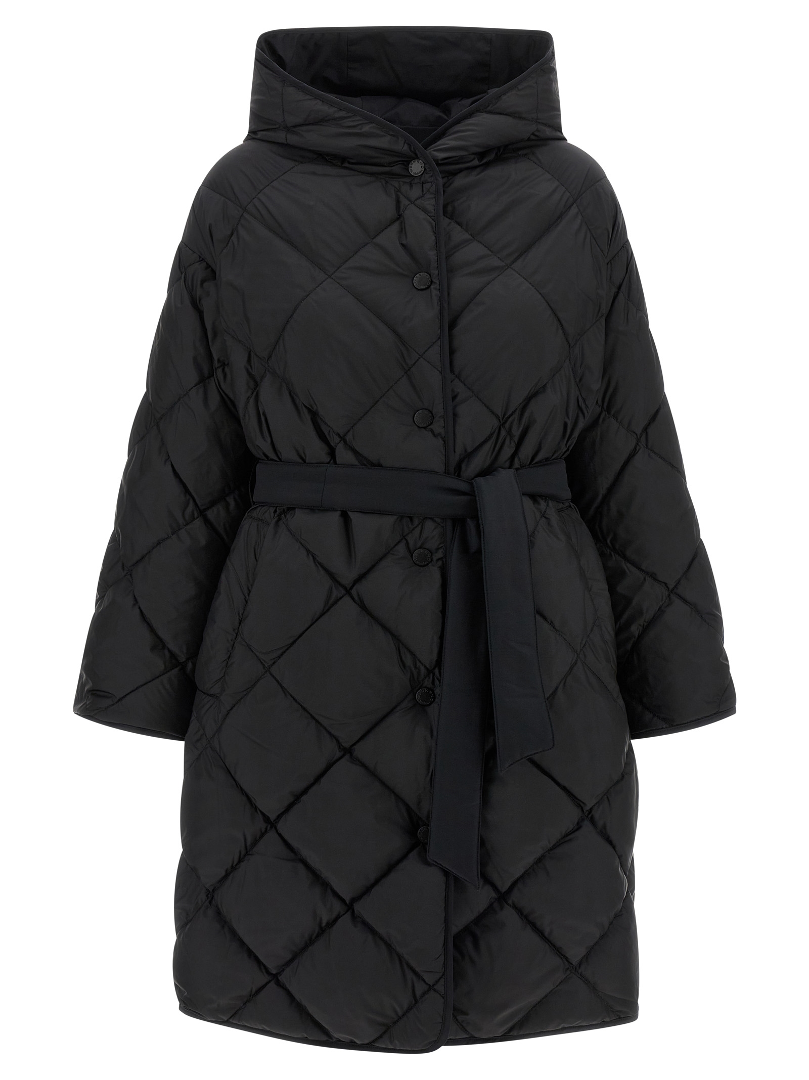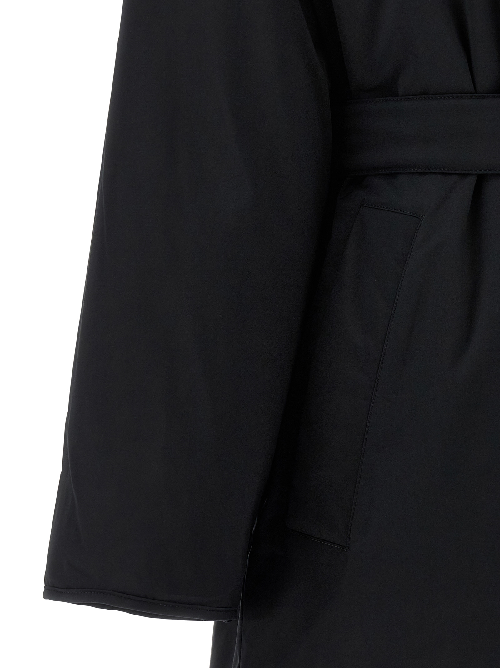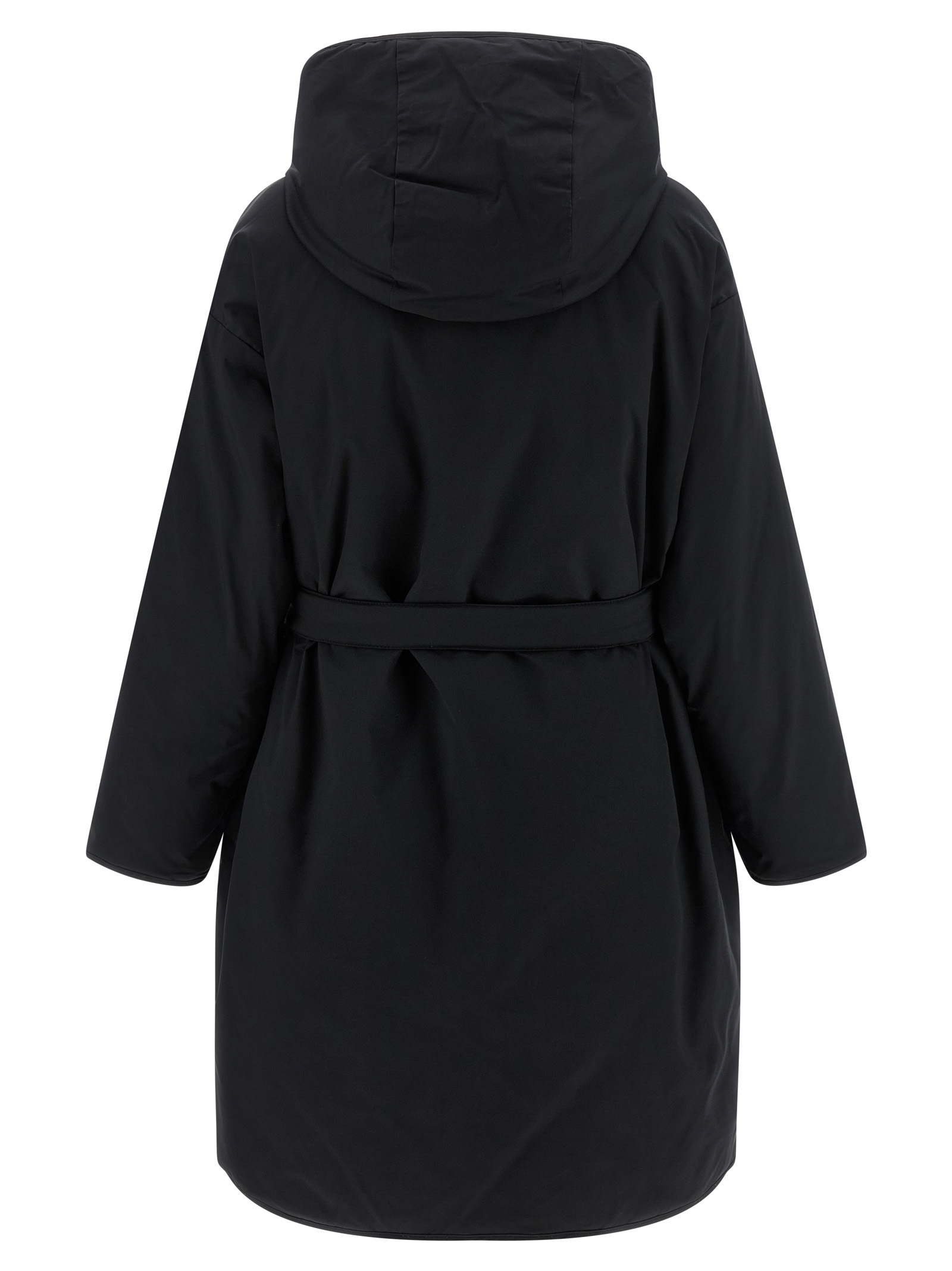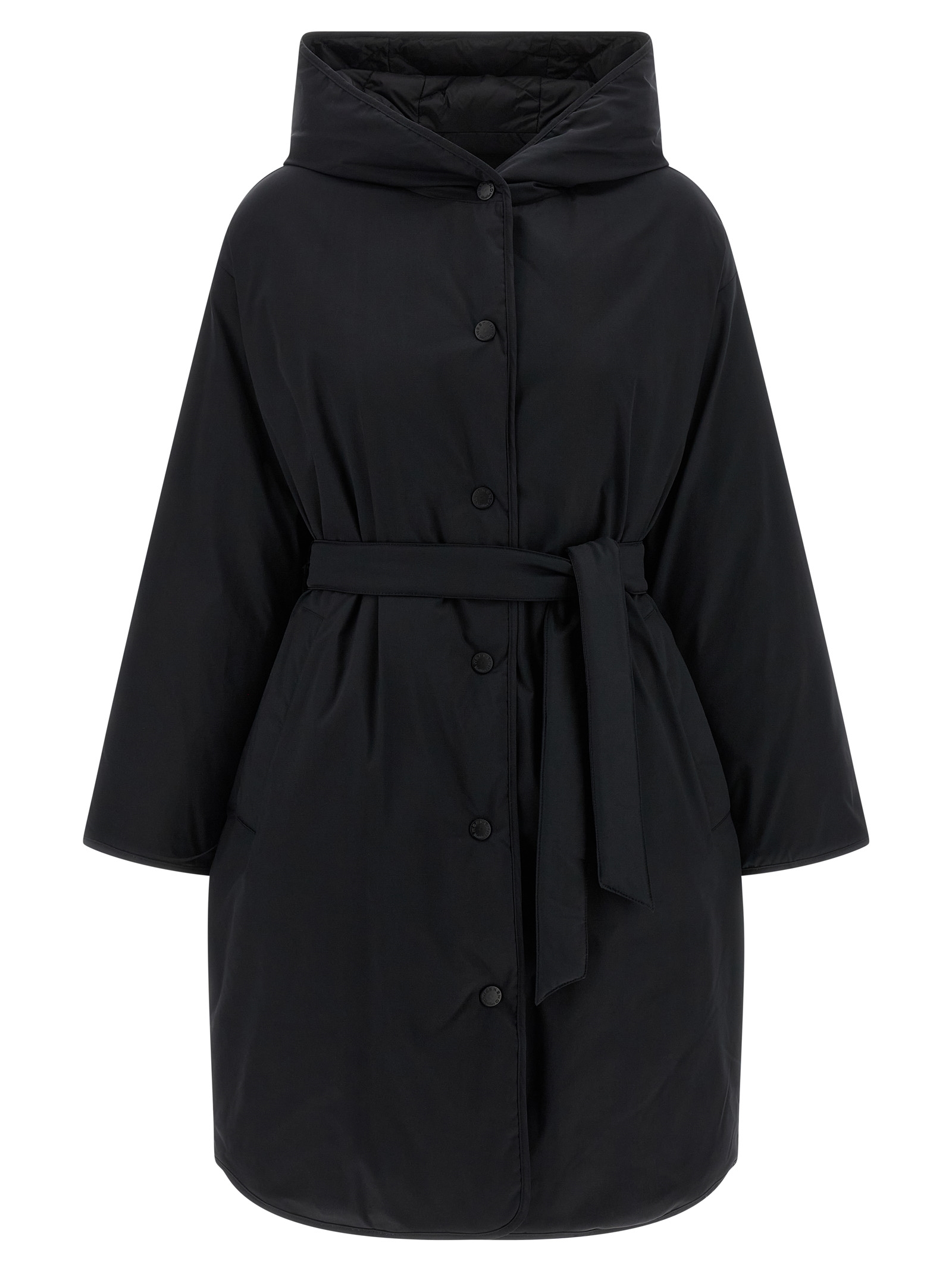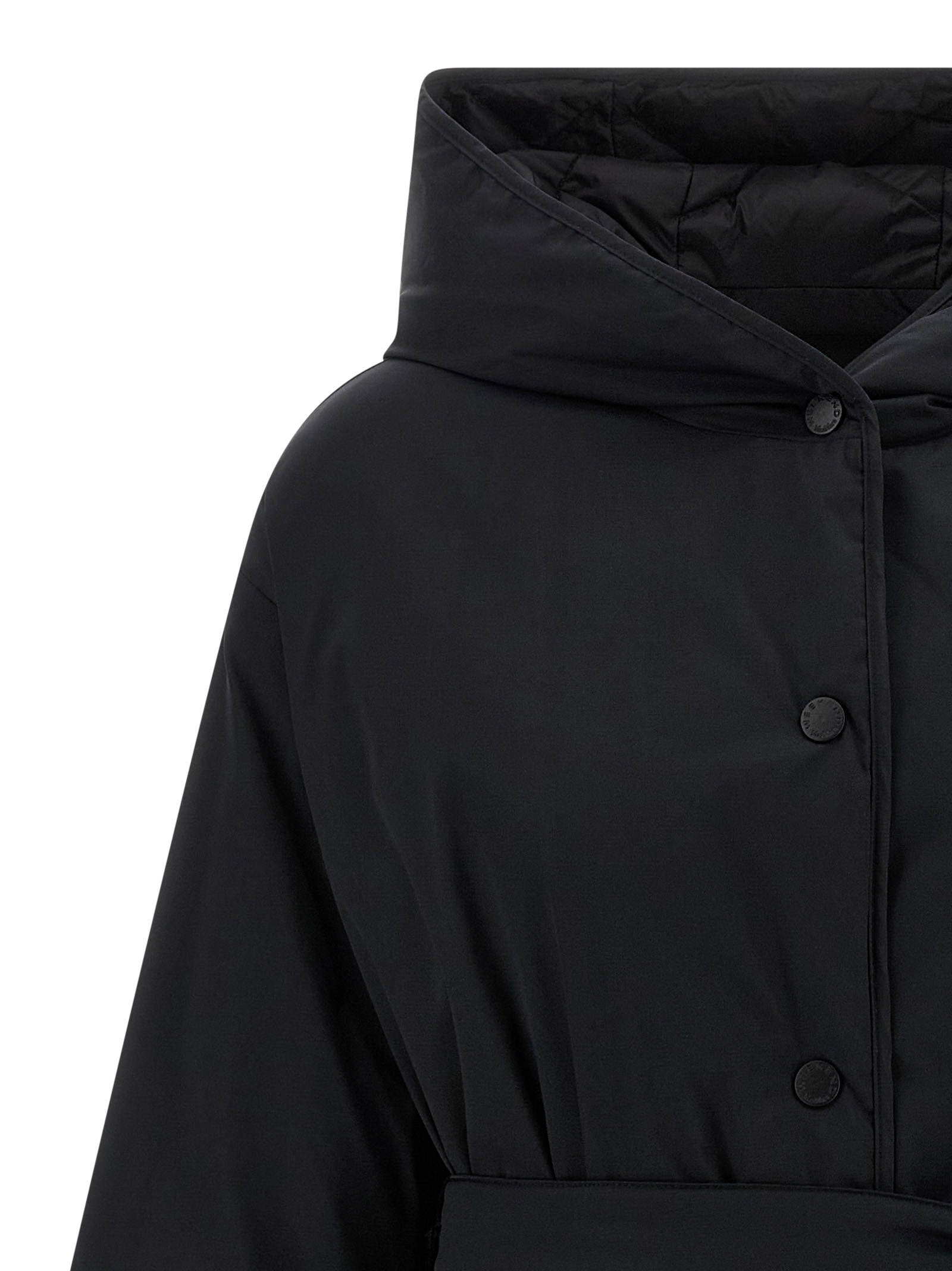 'Banfy' waterproof, reversible, padded and quilted fabric jacket, hood, front snap button closure, dropped shoulder, side pockets, removable belt knotted at the waist, long sleeves.