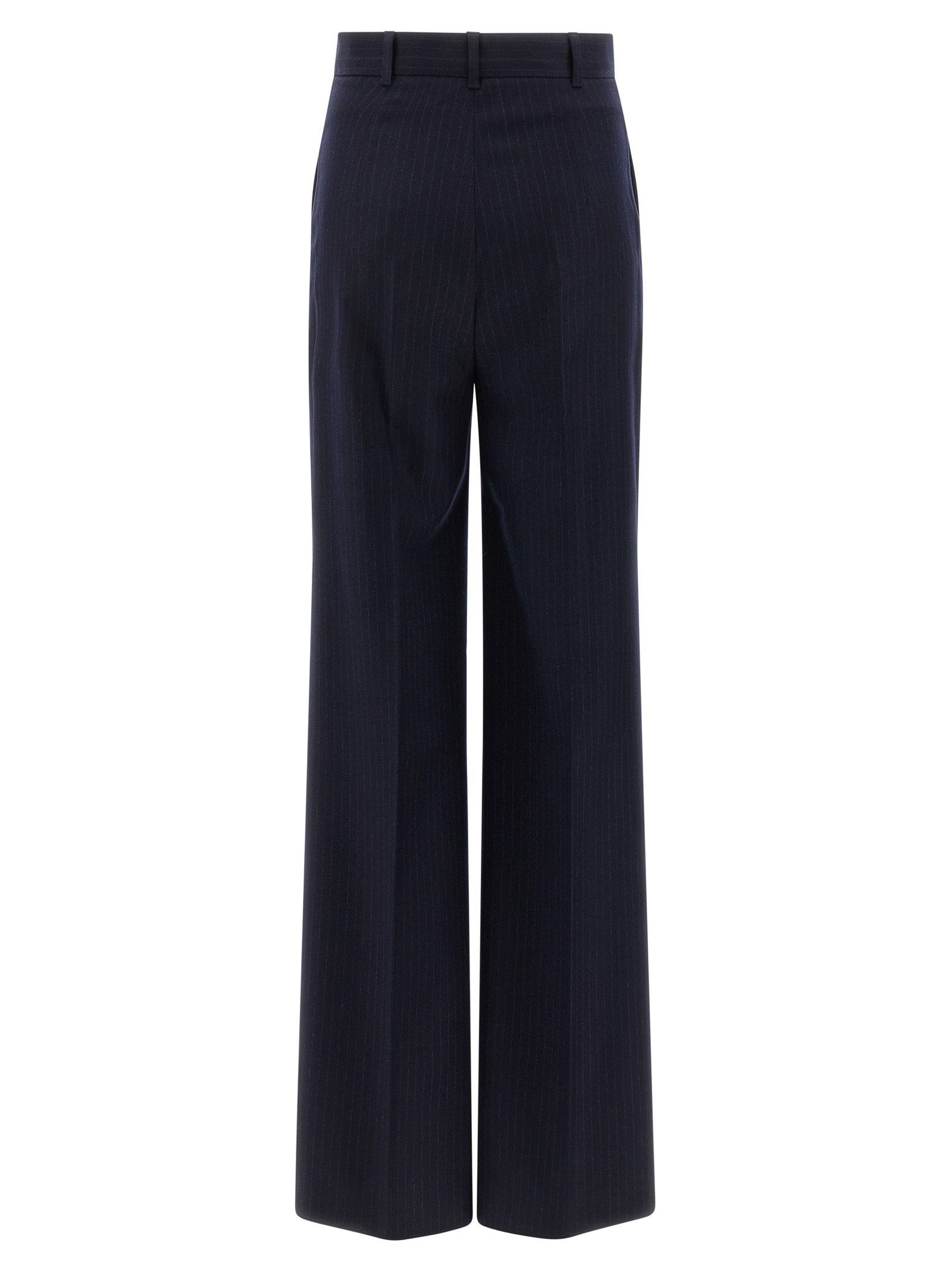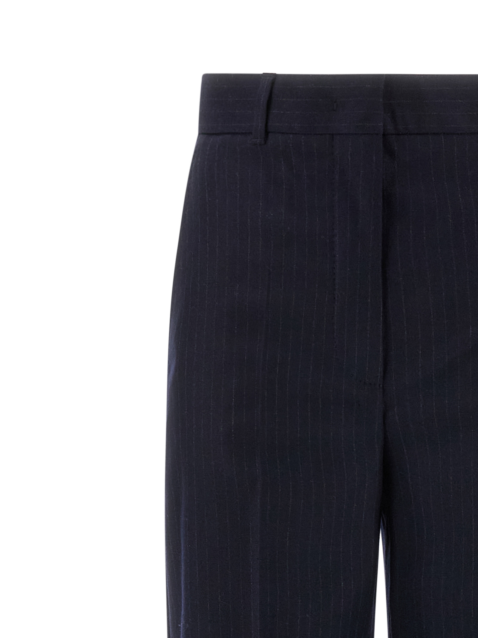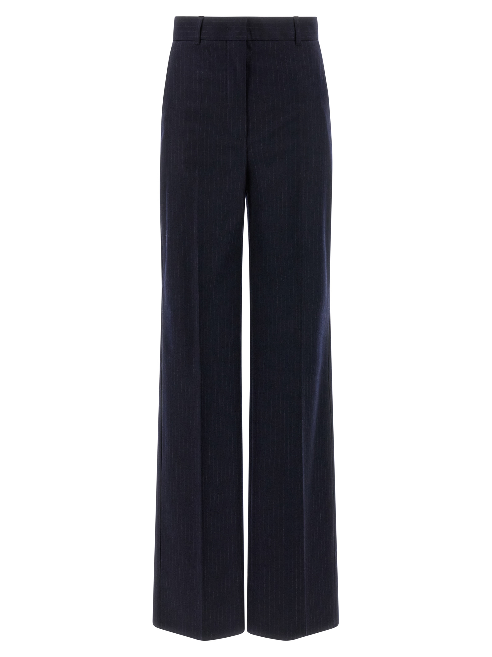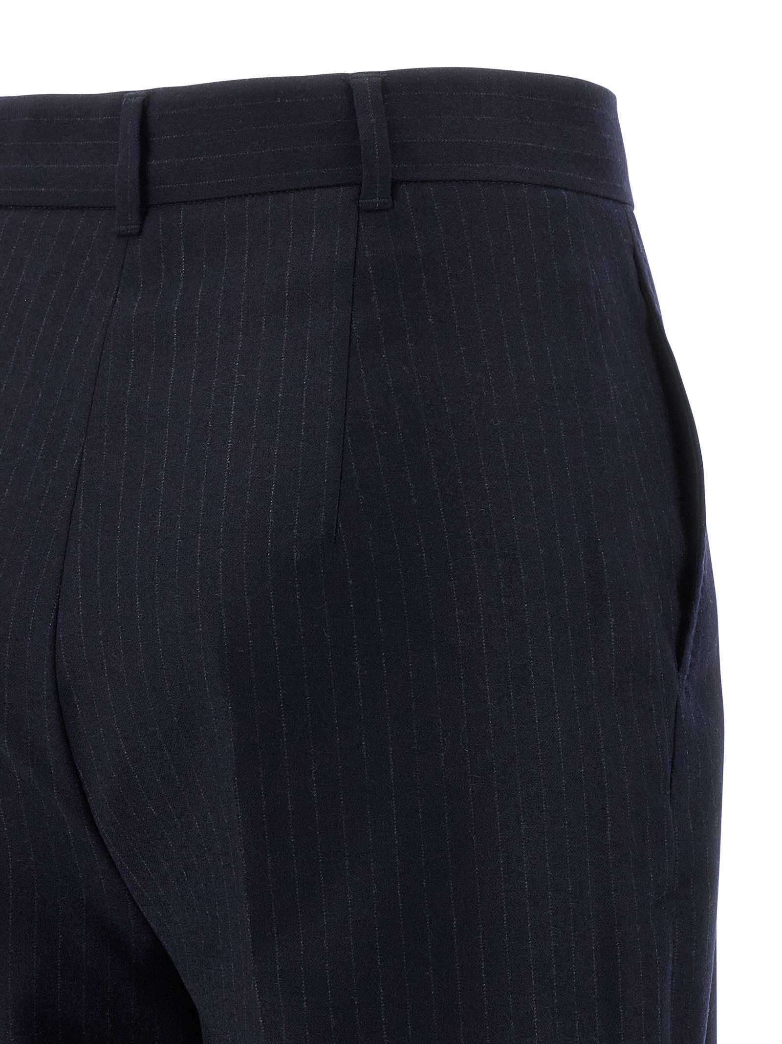 'Medium' stretch wool flannel pants with pinstripe pattern, straight leg, stretched pleat, zip, hook and front button closure, pockets.