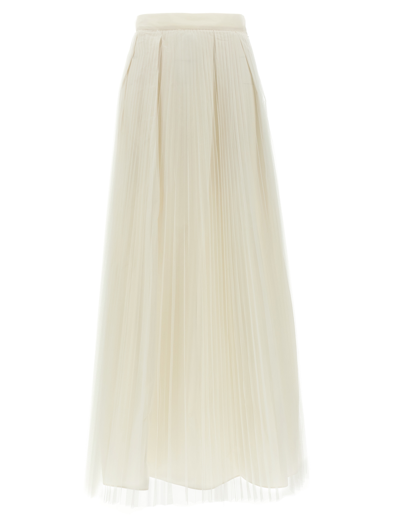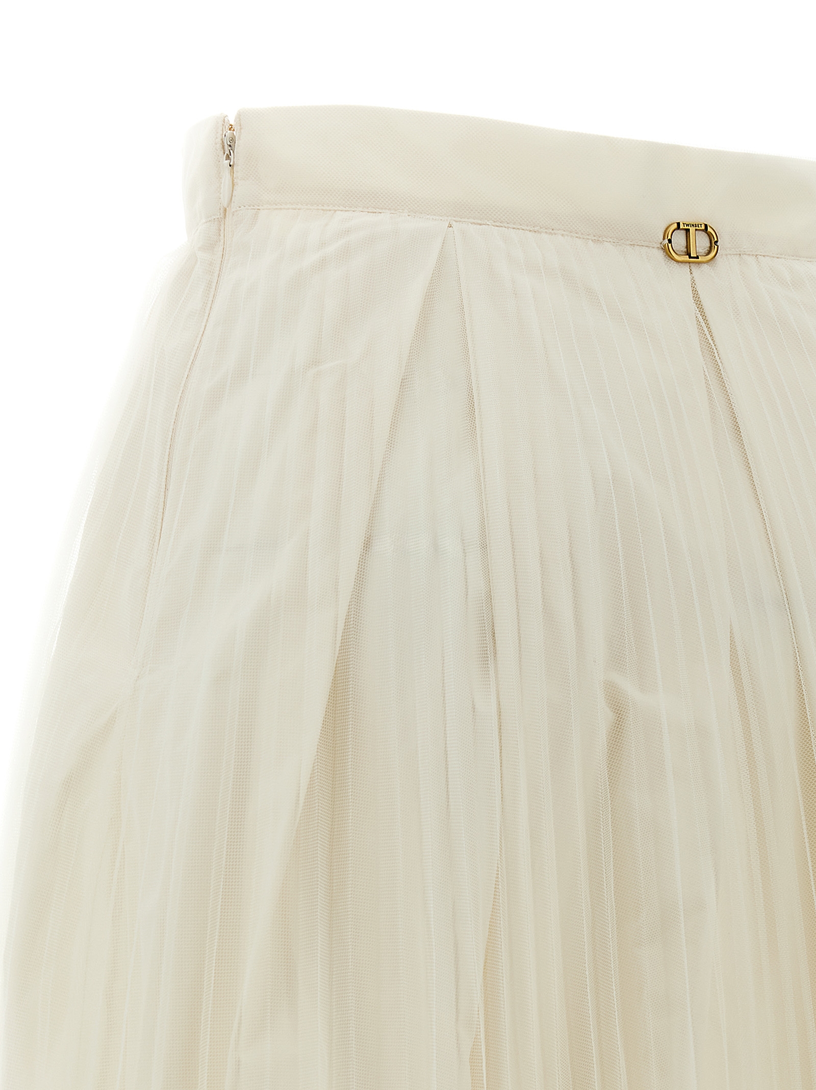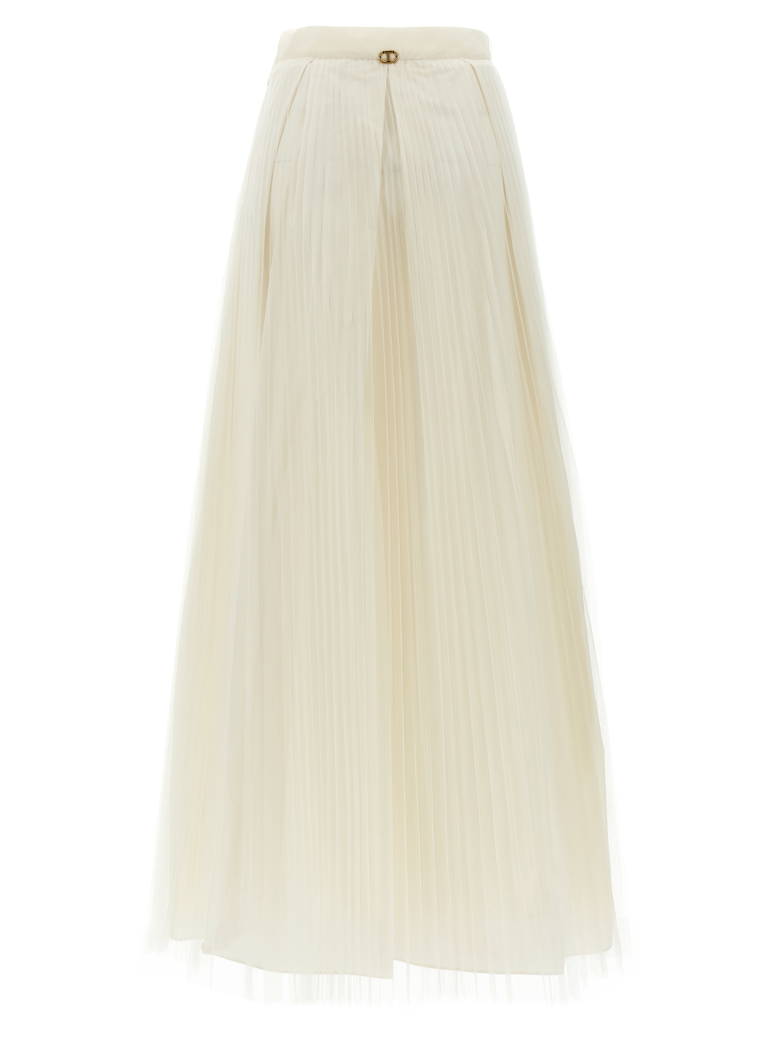Длинная юбка из тафты, дополненная плиссированным тюлем со складками на талии, расклешенного силуэта, застежки-молнии сбоку, металлической овальной логотипной пластиной в виде буквы Т на спине.