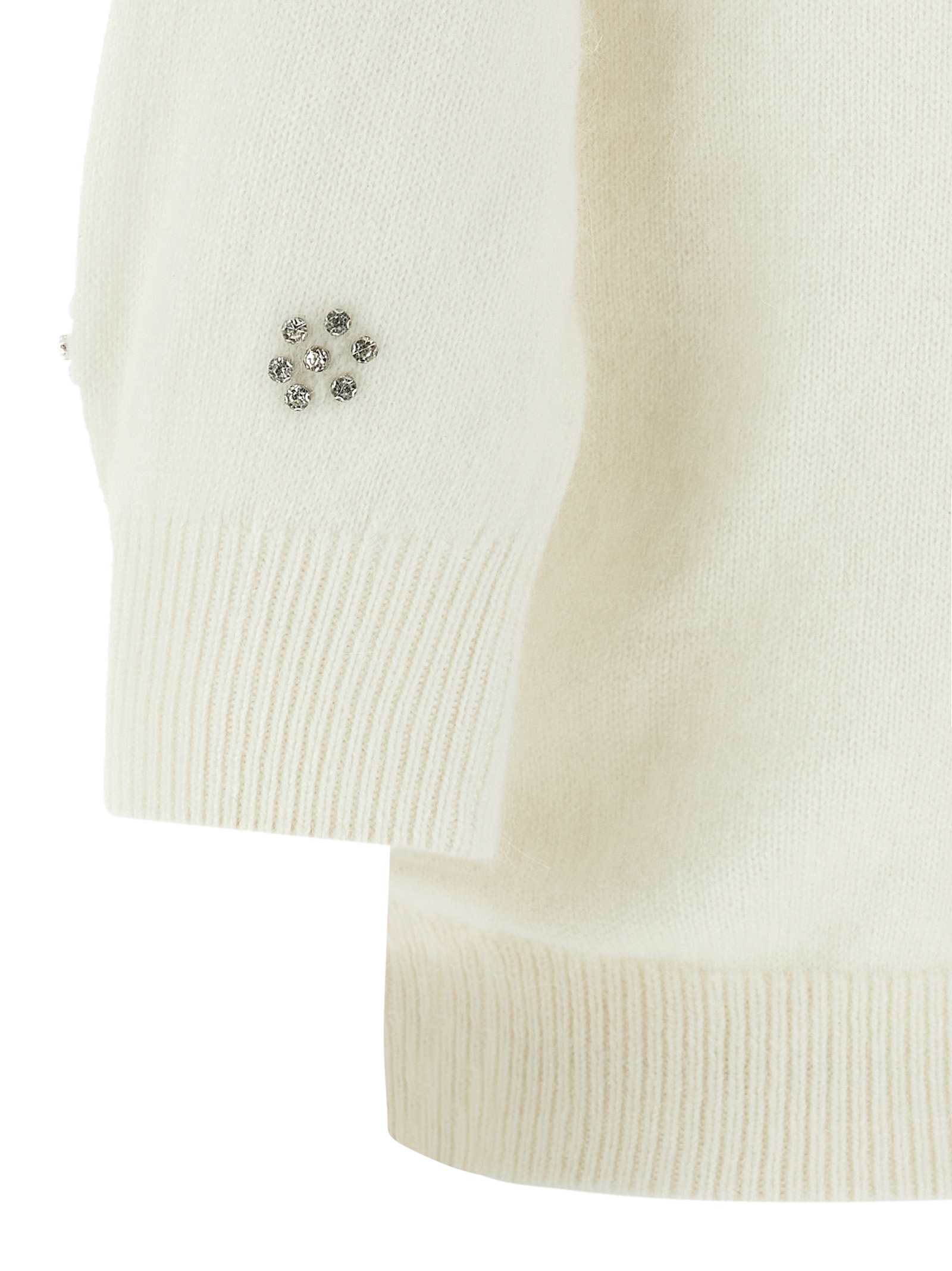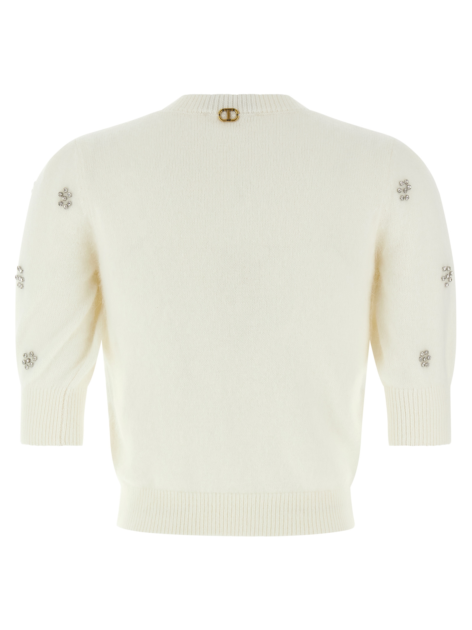 Свитер из смеси ангоры с узором, выполненным методом филиграни, и аппликацией из заклепок в виде цветов, слегка укороченный, круглый вырез, короткие рукава, металлическая овальная логотипная пластина в виде буквы Т на спине.