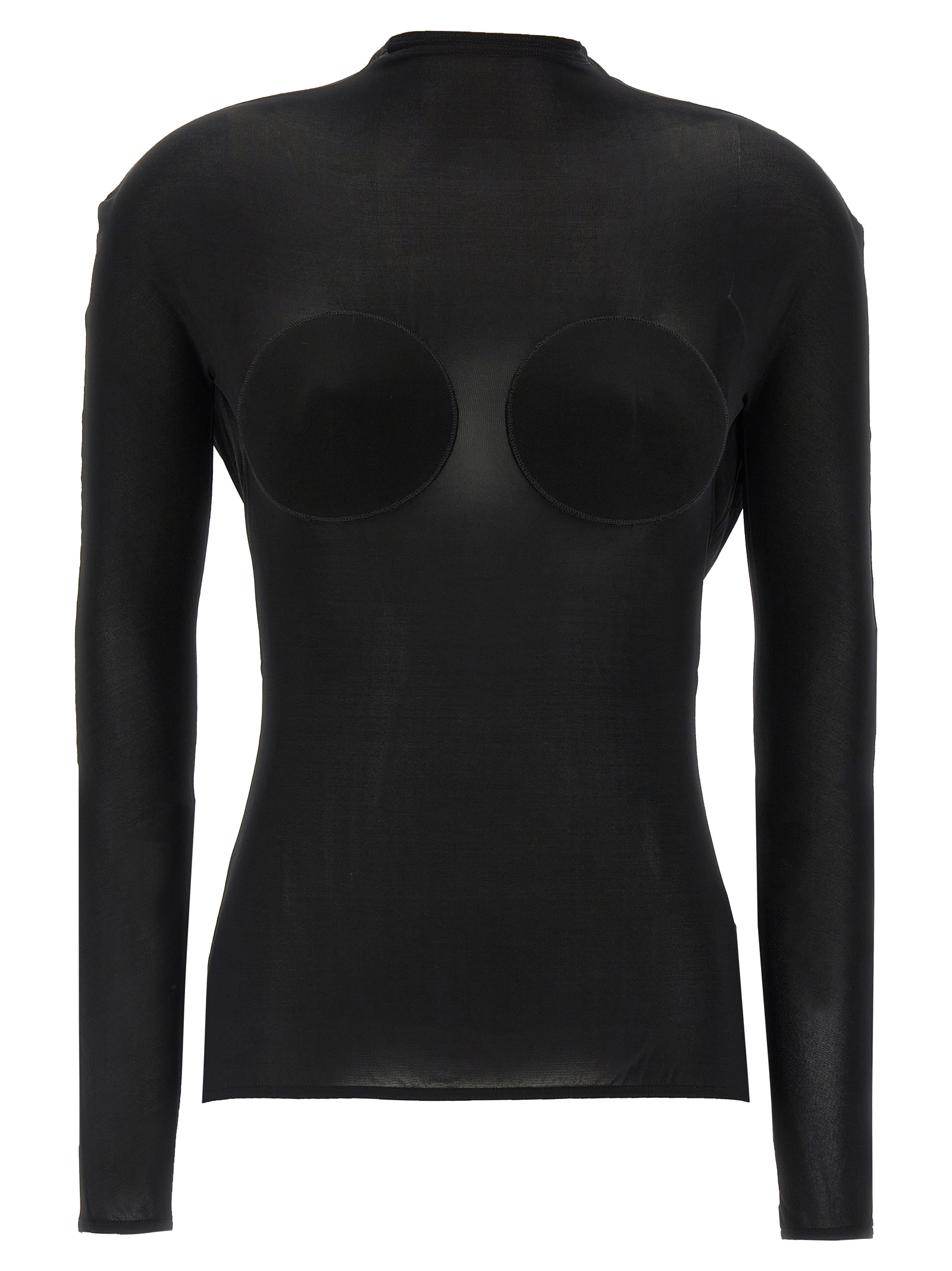 Semi-transparent lightweight jersey sweater, front cone volume detail, back neckline, long sleeves.