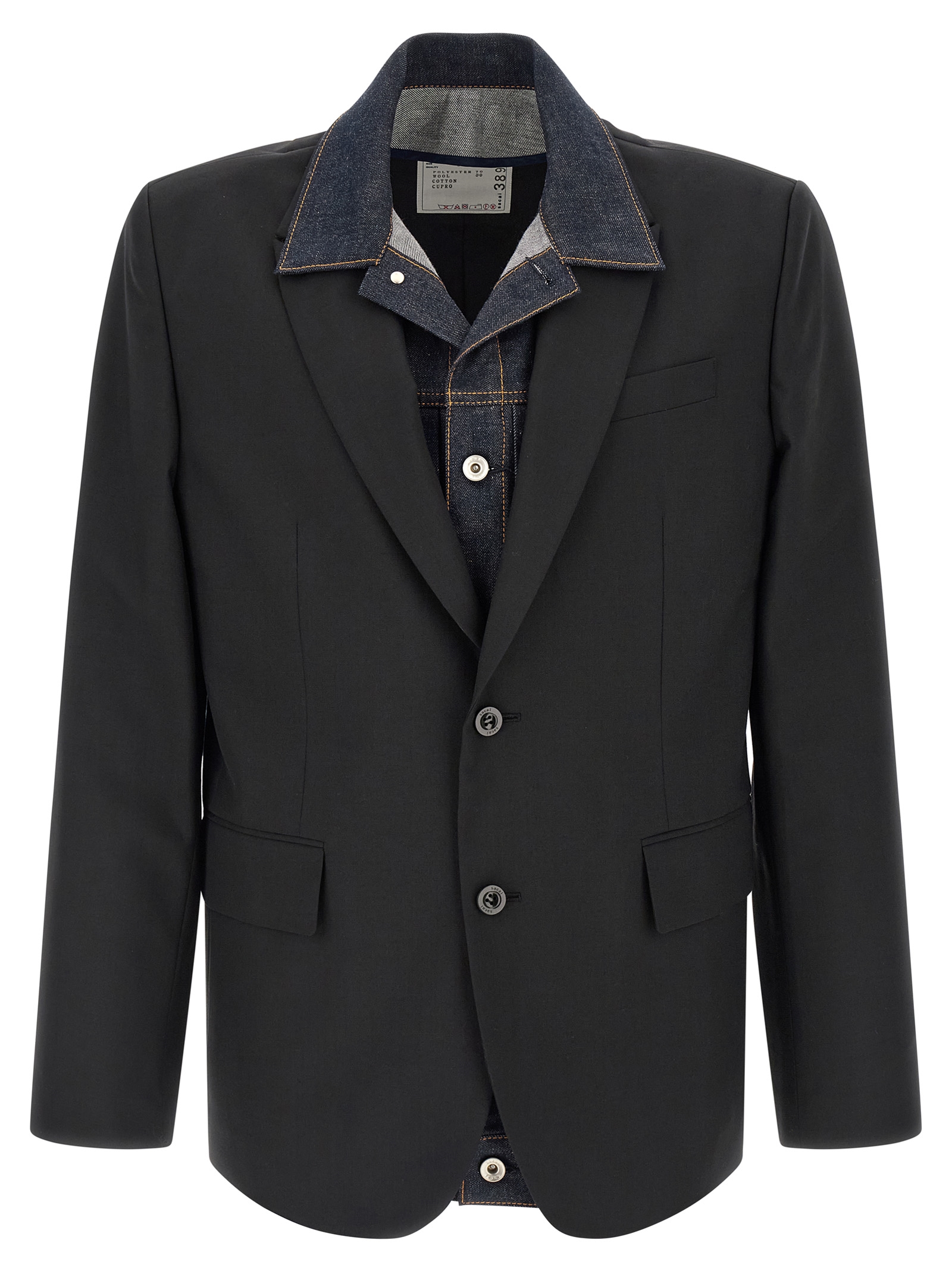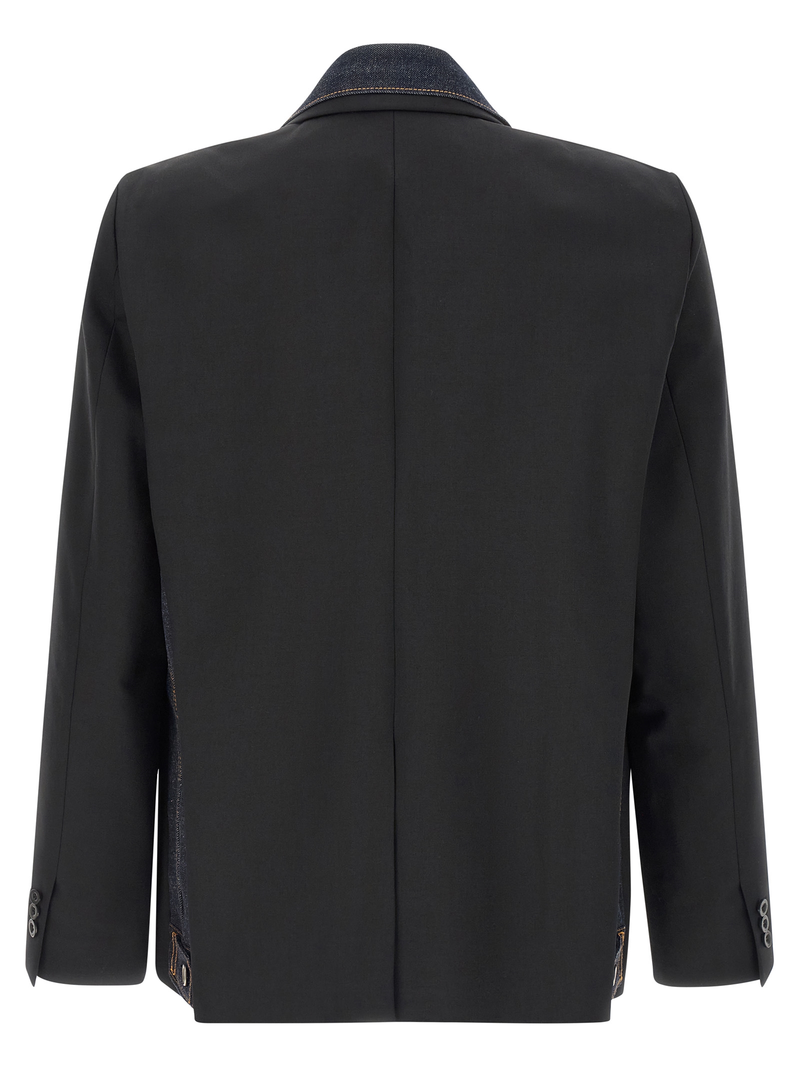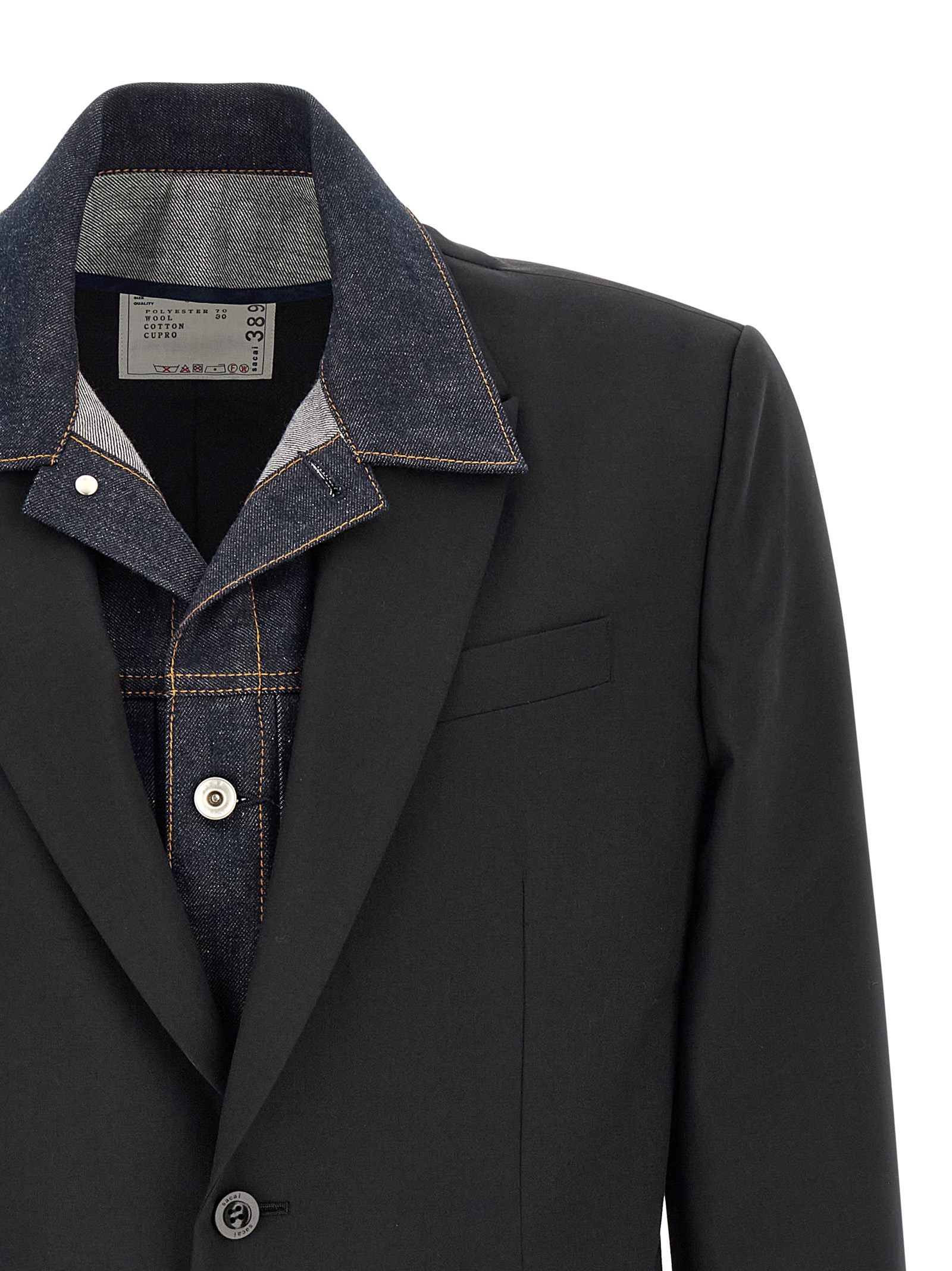 Wool blend blazer jacket with front and side cotton denim insert with contrast stitching, shirt collar, button closure, pockets. Single-breasted model with front button closure, peak lapels, breast pocket, flap pockets, structured shoulder straps, cuffs with open buttonholes, back split.