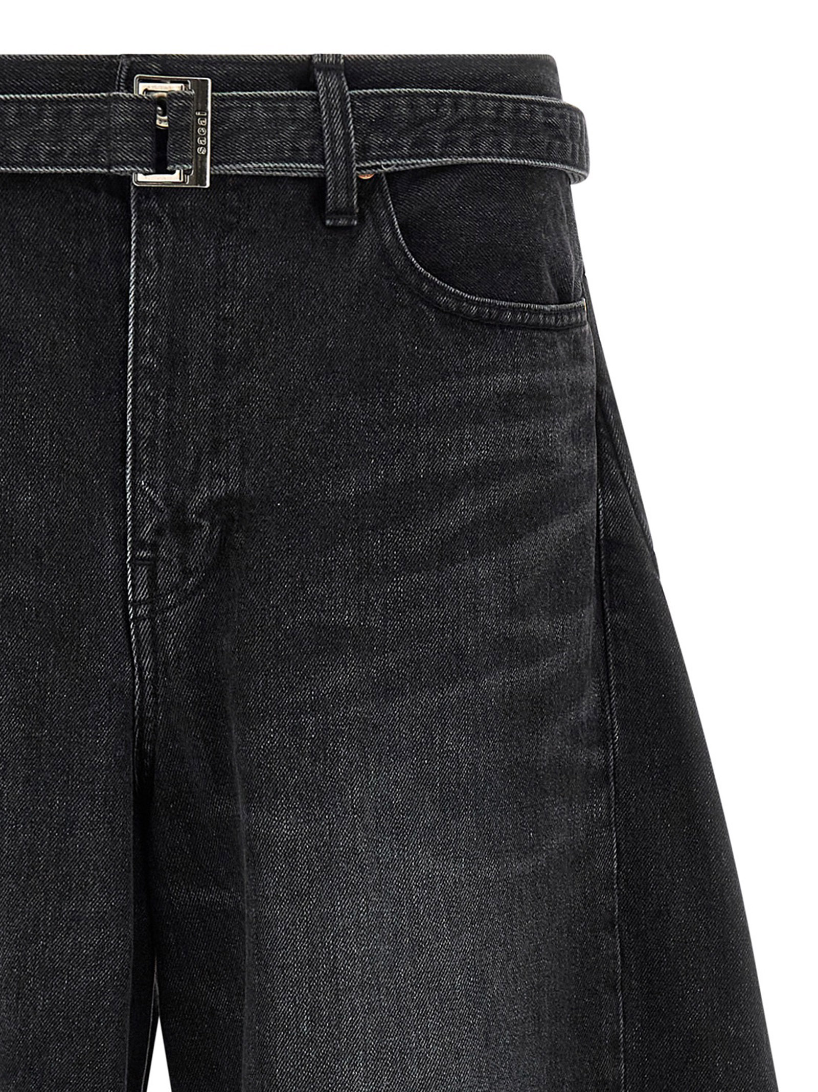 Stone-washed cotton denim jeans with extra wide and curved leg at the hem, zip and front button closure, five pockets.