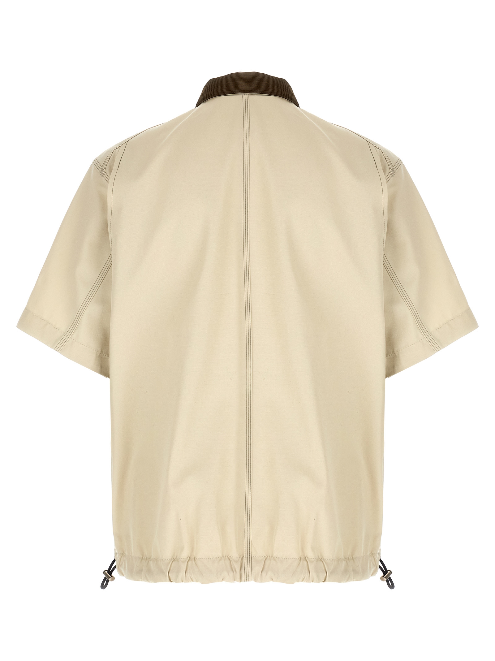 Рубашка Sacai x Carhartt WIP 'Duck' из канваса Dearborn Canvas с контрастным вельветовым воротником, нашивкой с логотипом и застежкой на пуговицы спереди, карманами, короткими рукавами со спущенными плечами, двумя складками на спине и шнурком по низу.