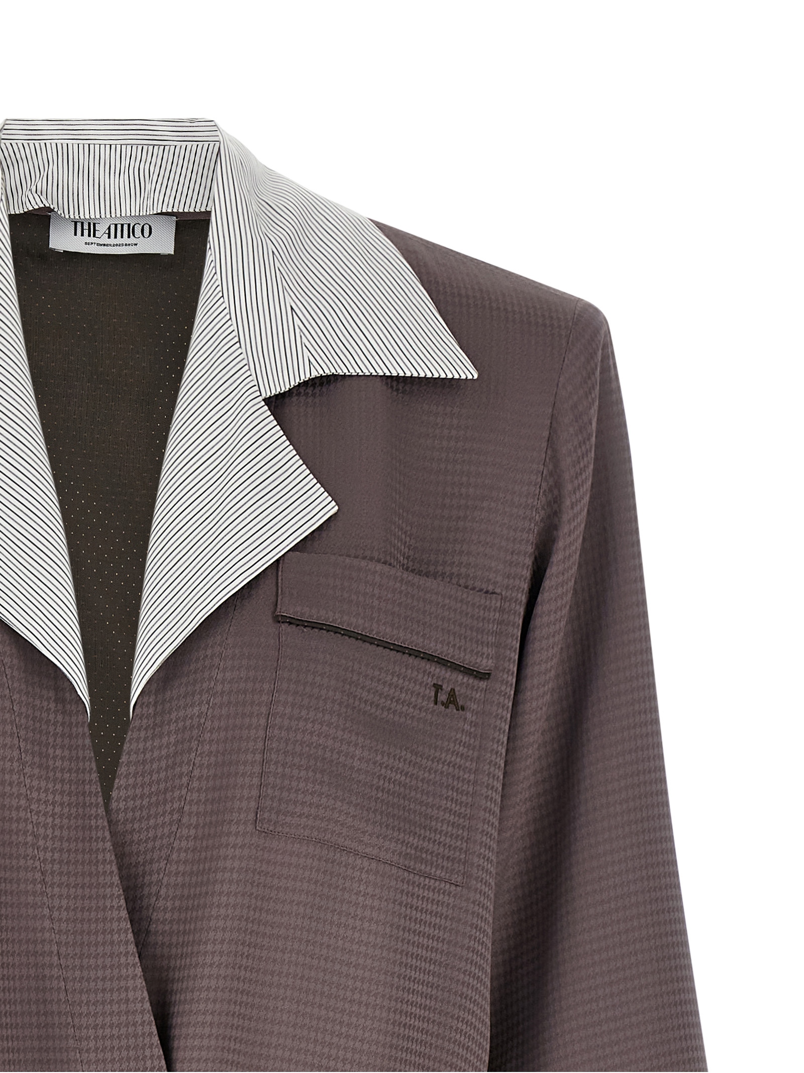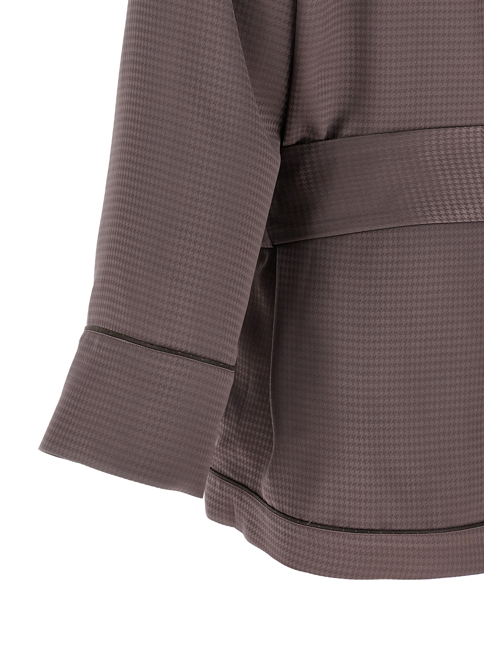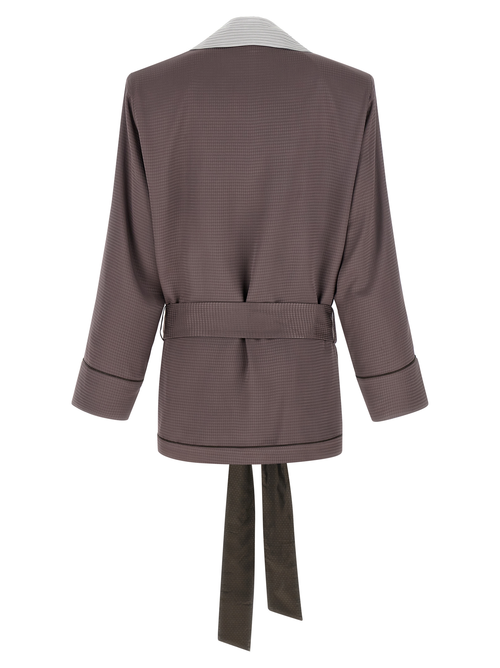 Houndstooth patterned viscose satin blazer with dressing gown style, contrasting striped insert to create the lapel collar, pocket with tone-on-tone embroidered logo, patch pockets, extra padded shoulder strap, long wide sleeves with cuffs, micro polka dot viscose blend lining, removable matching belt.