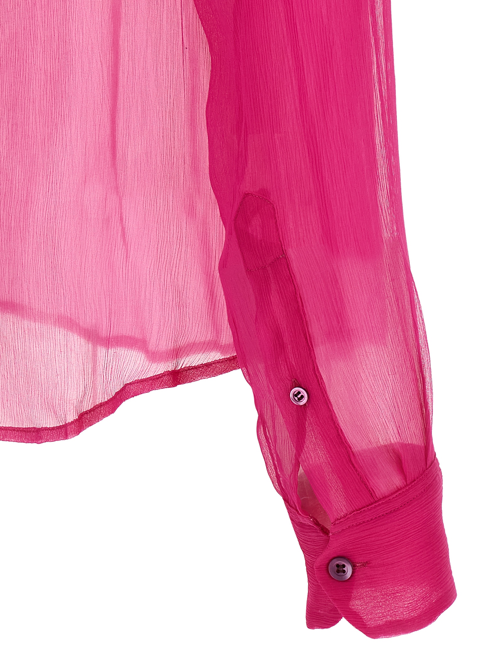 'Cloudy' semi-transparent washed silk muslin shirt, pointed collar, front mother-of-pearl button closure, long cuffed sleeves, rounded and asymmetrical hem.