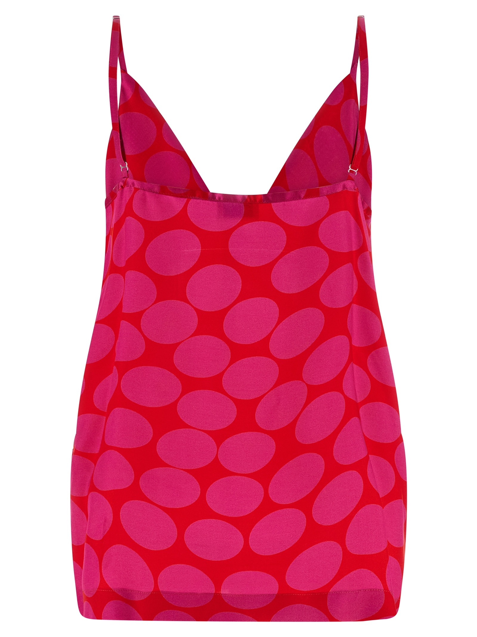 'Caliya' viscose maxi polka dot patterned top, V-neck with front button closure, thin adjustable straps, side curls, back square neckline.
