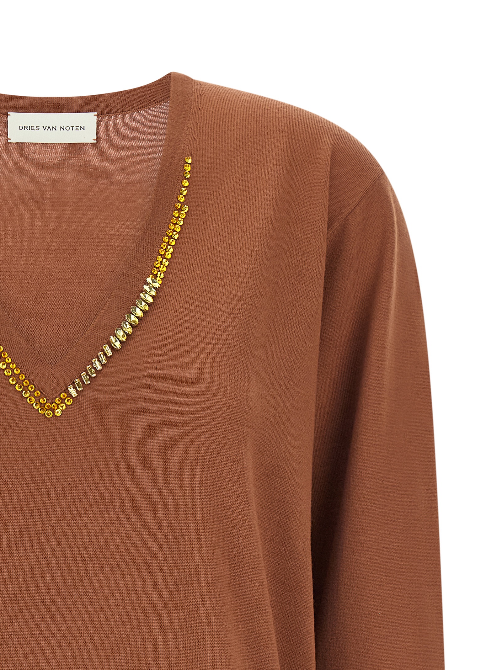 'Tuomas' sweater in light merino wool, V-neck with crystal application, long sleeves with cuffs and dropped shoulder, band on the hem.