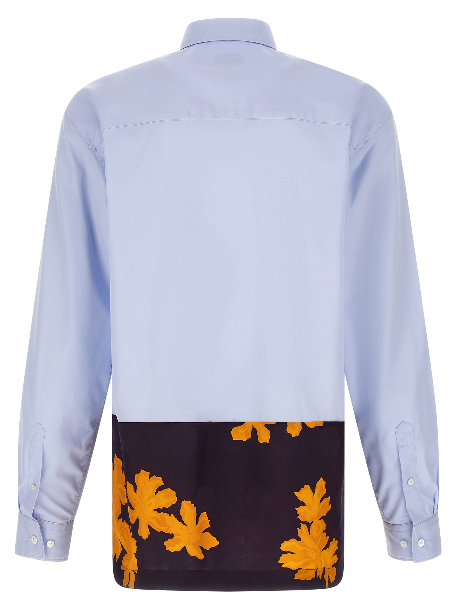 'Capero' cotton poplin shirt with front button closure, long cuffed sleeves, shiny viscose band with floral print on the hem.