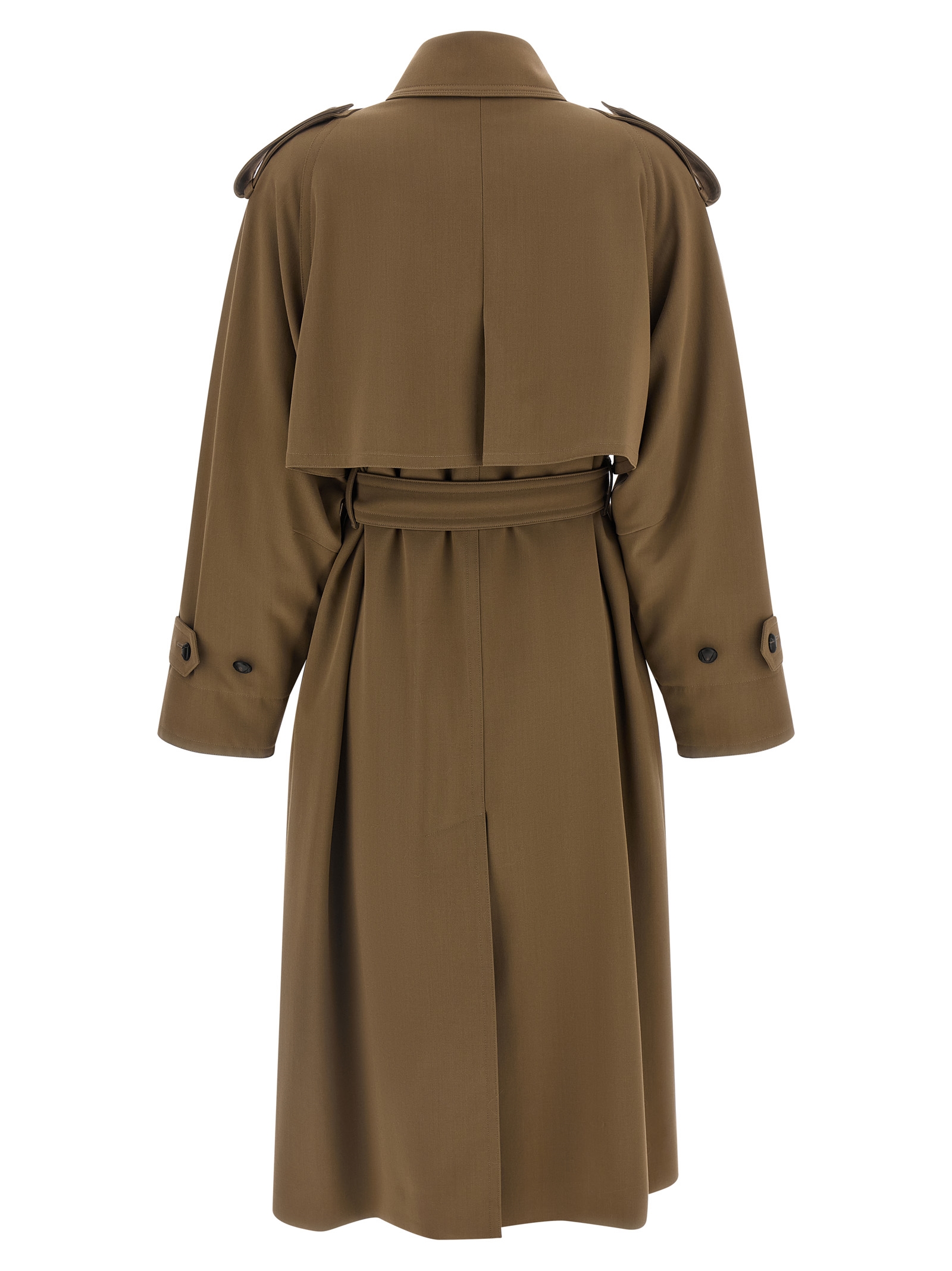 'Mxmcerto' wool gabardine waterproof trench coat with shirt collar, double-breasted button closure, back cape, flared cut with wide back split, removable and adjustable belt with buckle, side pockets with flap and buttons, straps on the shoulders, long sleeves with straps on the cuffs with buttons.