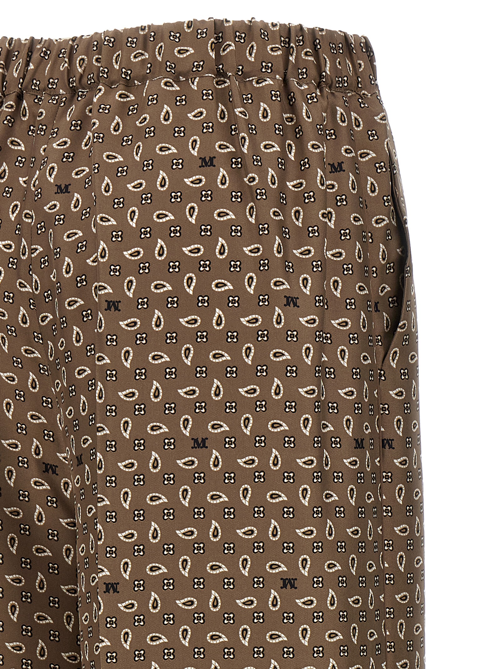 'MxmVischio' pure silk twill pants with E. Marinella archive print, wide leg, stretched pleat, high waist, drawstring elastic waistband, pockets.