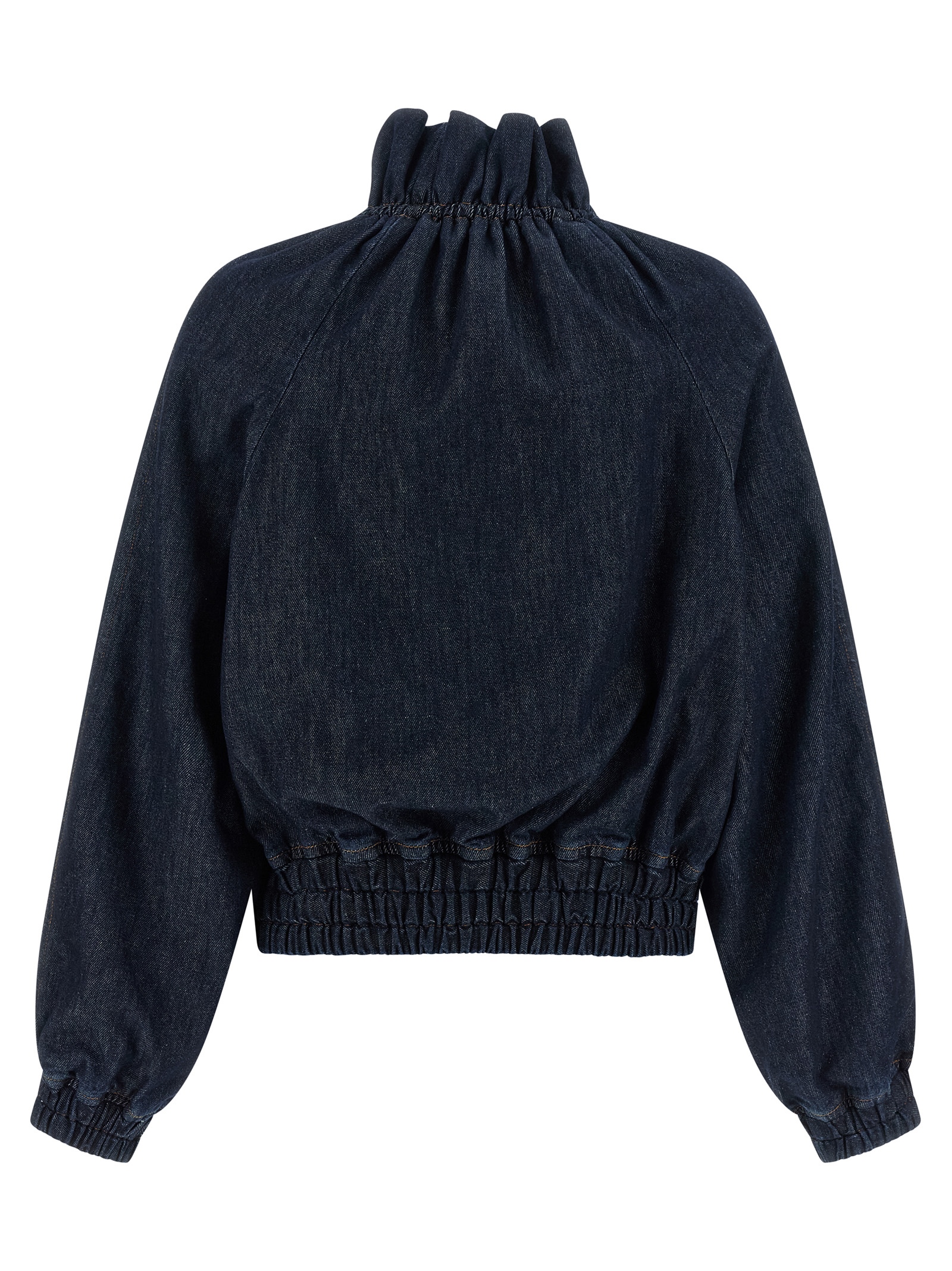 Джинсовая куртка Voly' из хлопка с контрастной строчкой, воротником-стойкой с регулируемым шнурком, застежкой-молнией спереди, эластичным низом, карманами, длинными рукавами с эластичными манжетами.