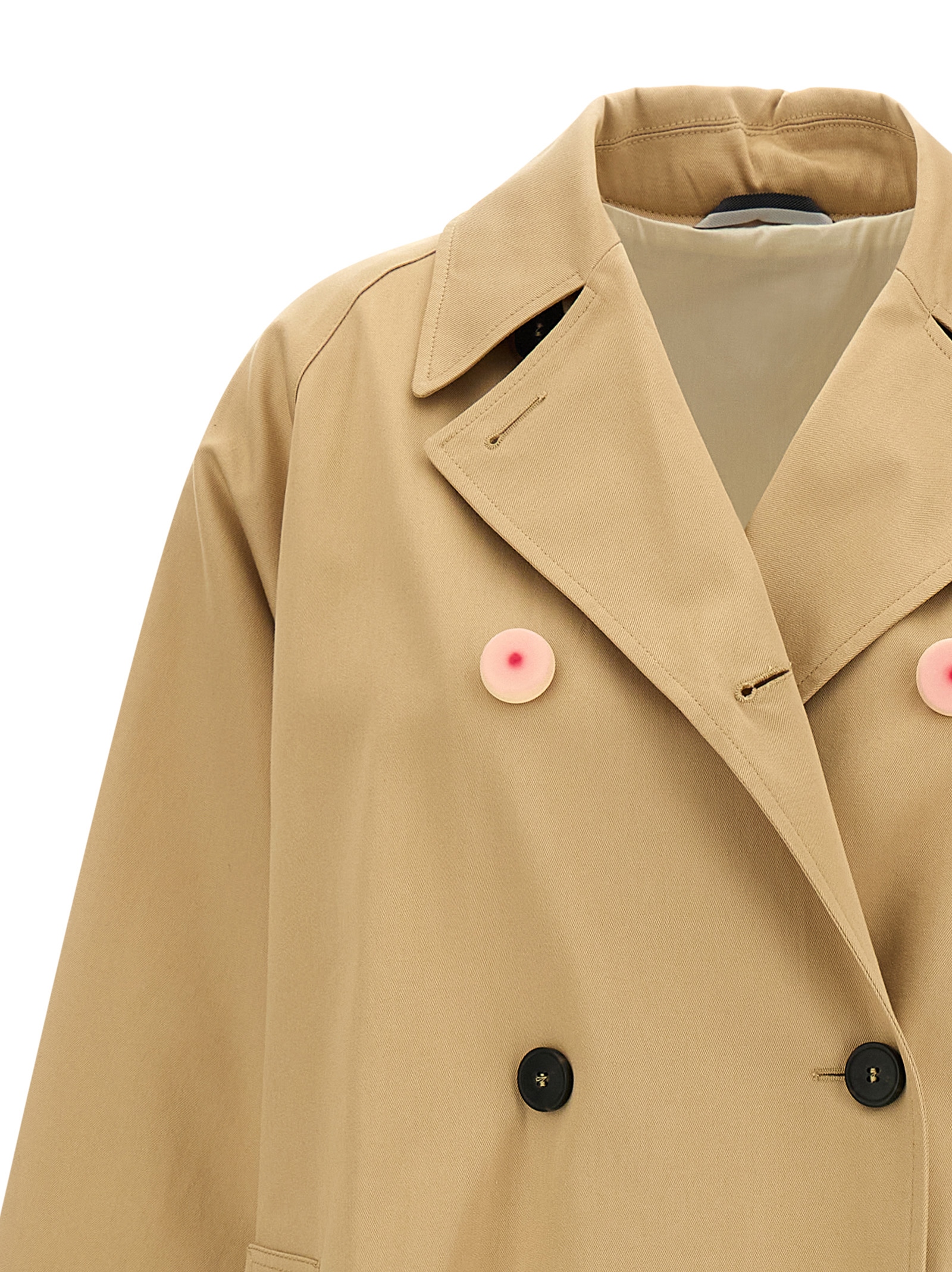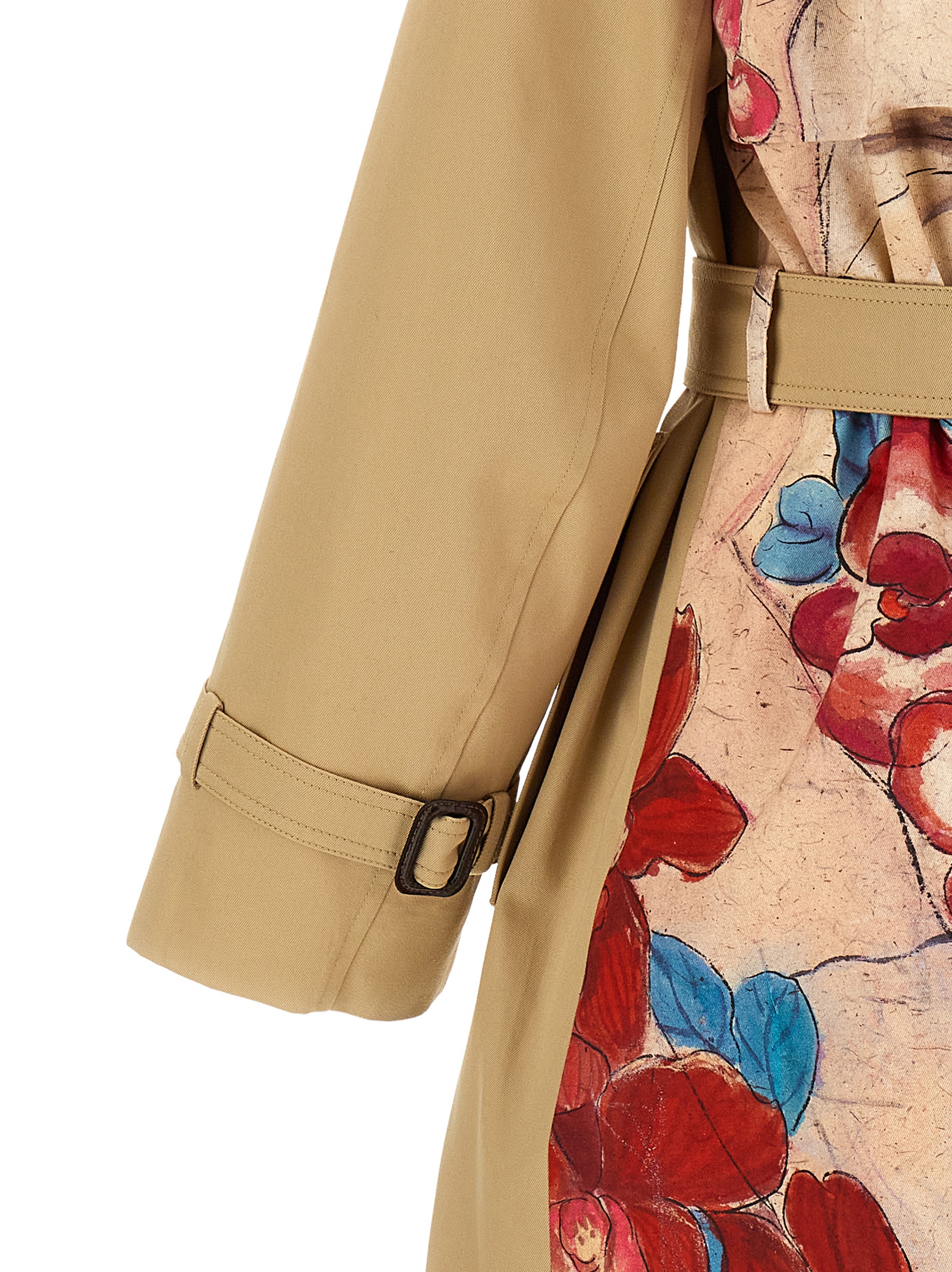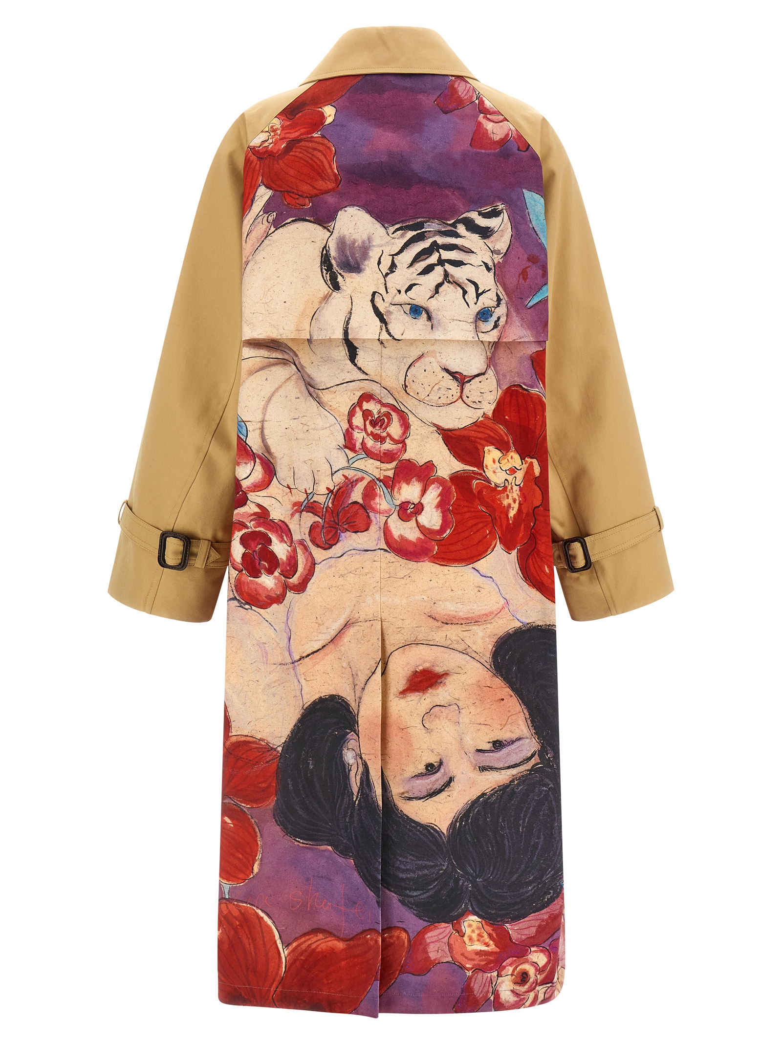 'Ninfa' capsule 'A Weekend With An Artist' trench coat designed by Shafei Xia in waterproof cotton gabardine with back print, double-breasted style with front button closure, flared silhouette, lapel collar, welt pockets, long raglan sleeves with frog on the wrist, back split, lining, removable matching belt, one pair of covers buttons included.