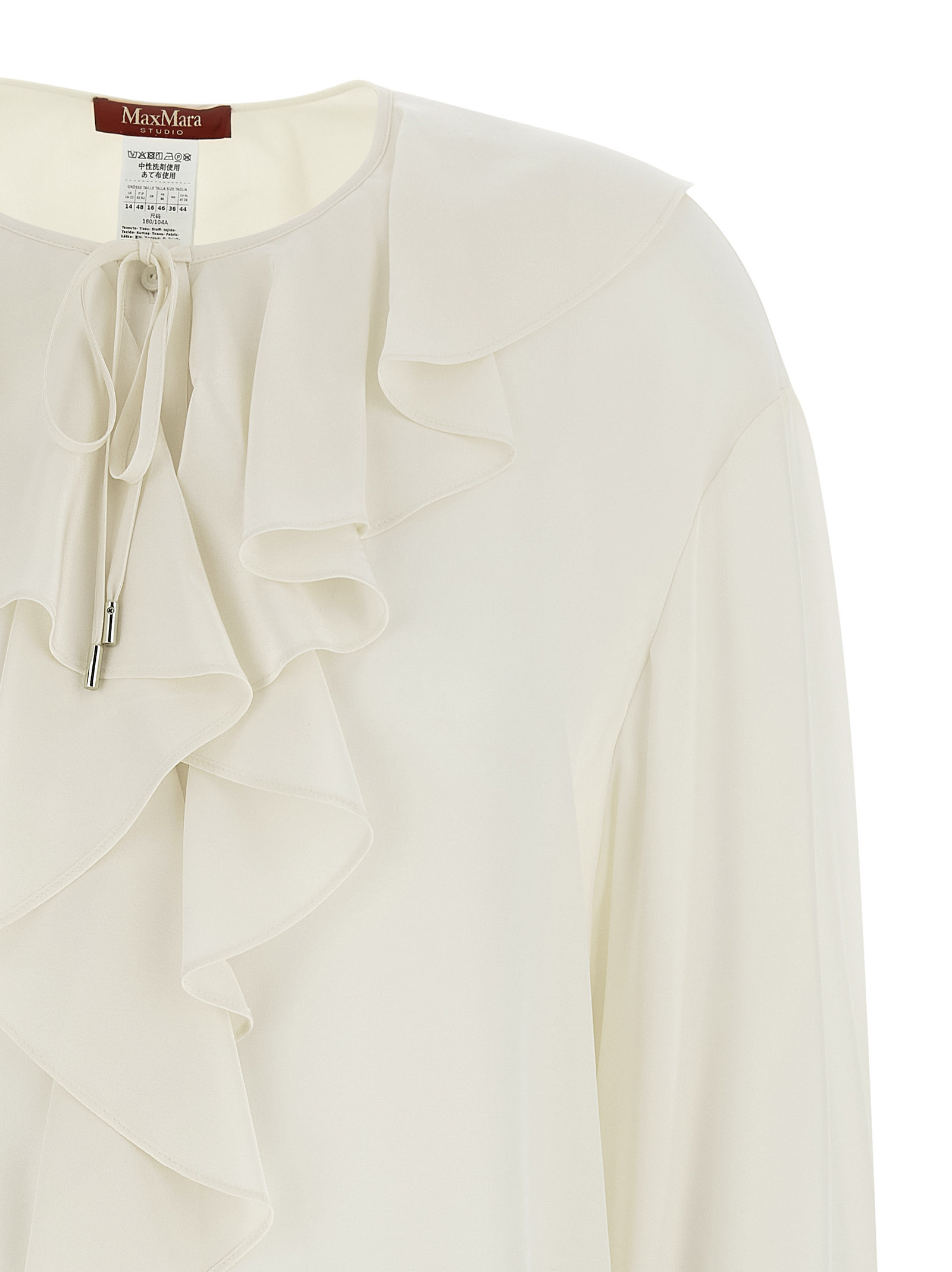 'MstEpica' pure silk crêpe de Chine blouse with ruffle pattern on the neck and front, crew neck with tie cord, front mother-of-pearl button closure, long sleeves with cufflinks, rounded hem.