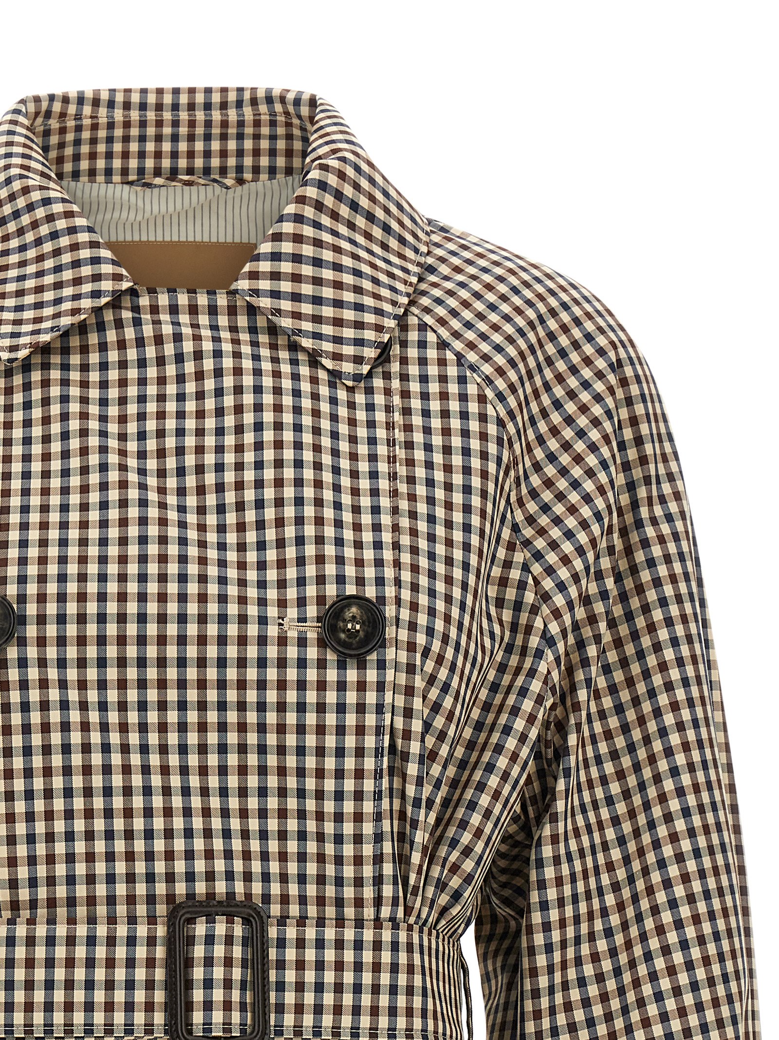 Check pattern 'MtcFate' waterproof cotton blend twill trench coat, flared silhouette, shirt collar with back logo embroidery, double-breasted style with front horn button closure, pockets, long raglan sleeves with frog on the wrist and pleated pattern on the elbow, back split, taffeta half-lining and jacquard logo ribbon, removable belt.